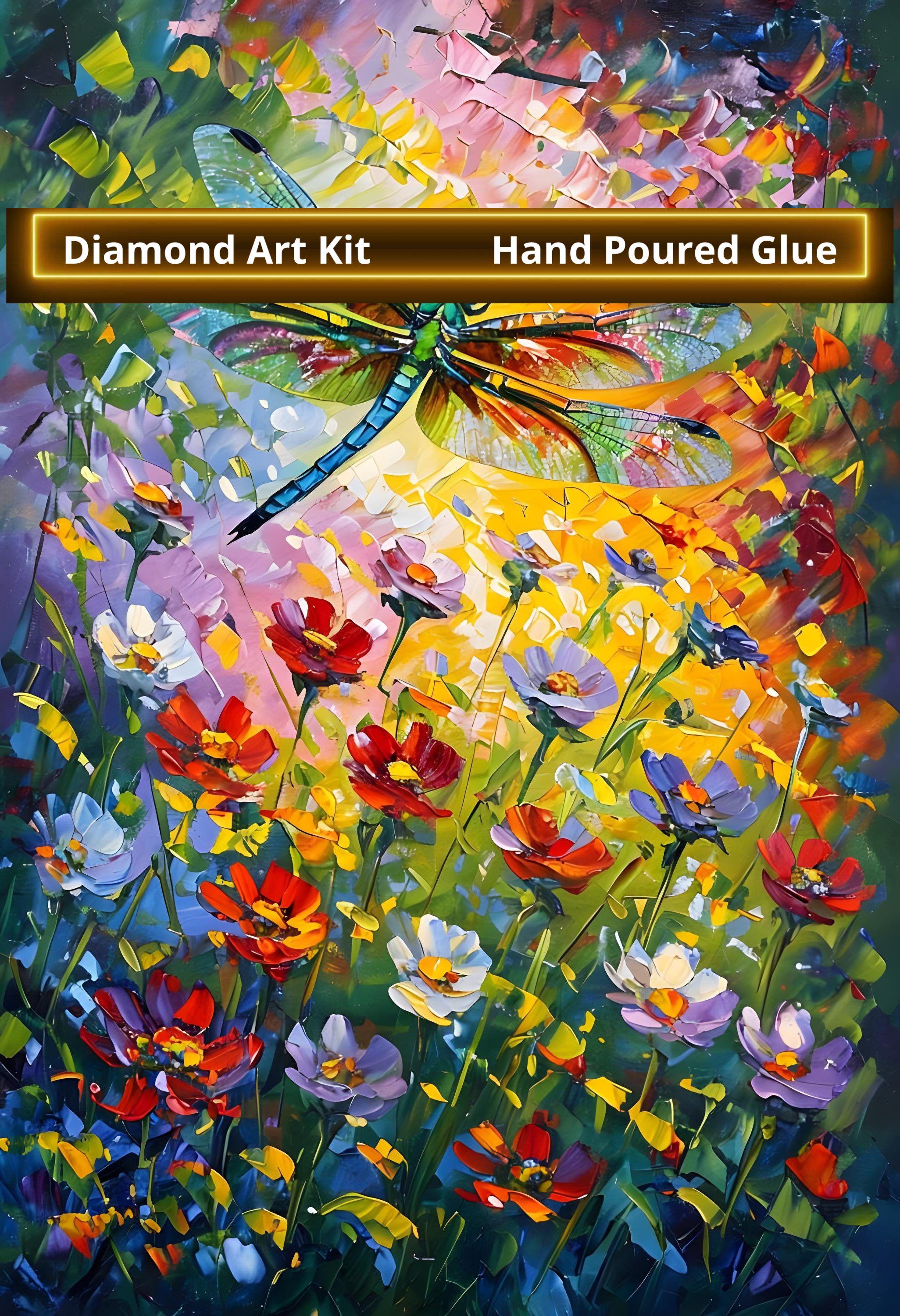 Dragonfly, Wildflowers, Vibrant Colors, DIY Diamond Painting with Frame - yes Framed Canvas! Large 20"x28" or 16”x20” no frame