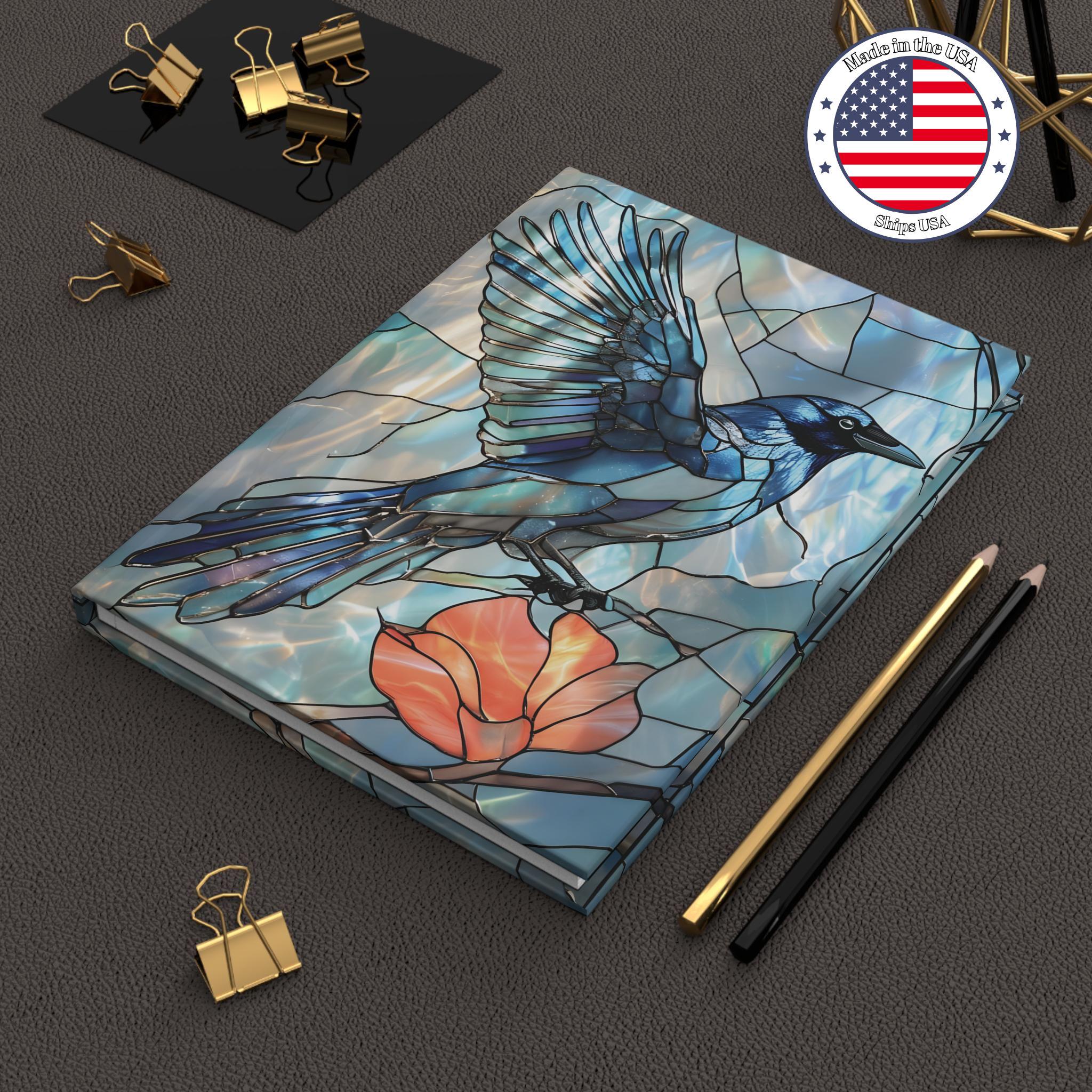 A hardcover journal with a Raven in blue stained glass design, giving off a mystical and artistic vibe. Perfect for writers, artists, and anyone who loves unique and creative stationery. Ideal for journaling, note-taking, or sketching. Relevant for Halloween, creative writing month, and art appreciation occasions.