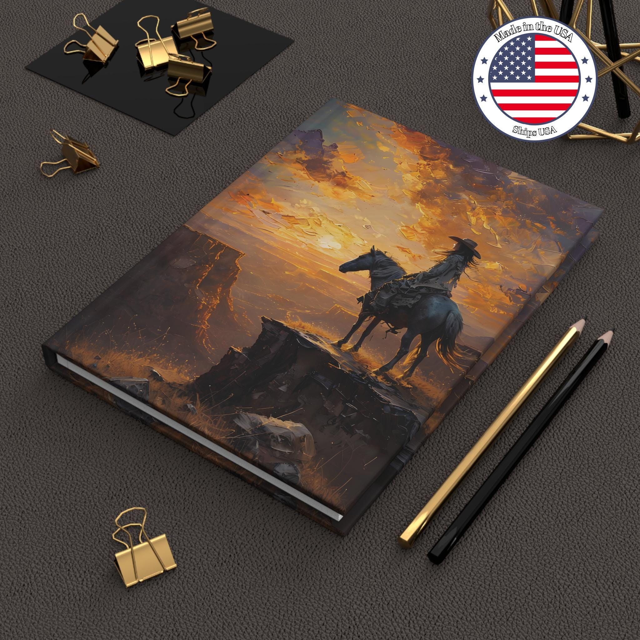 Capture your thoughts and dreams in this stunning Journal featuring a solitary Cowgirl with Stallion on a Cliff at sunset oil painting design. The vibrant colors and matte finish create a serene and peaceful atmosphere, perfect for horse lovers and nature enthusiasts. This journal is great for daily reflections, sketching, or jotting down notes. Ideal for birthdays, holidays, and special occasions.