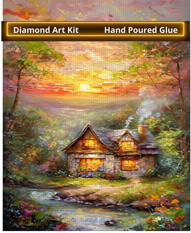 Diamond Painting, Cottage in the Woods during Sunset Art design, Diamond Paintings, DIY, 16”x20”, Diamond Art
