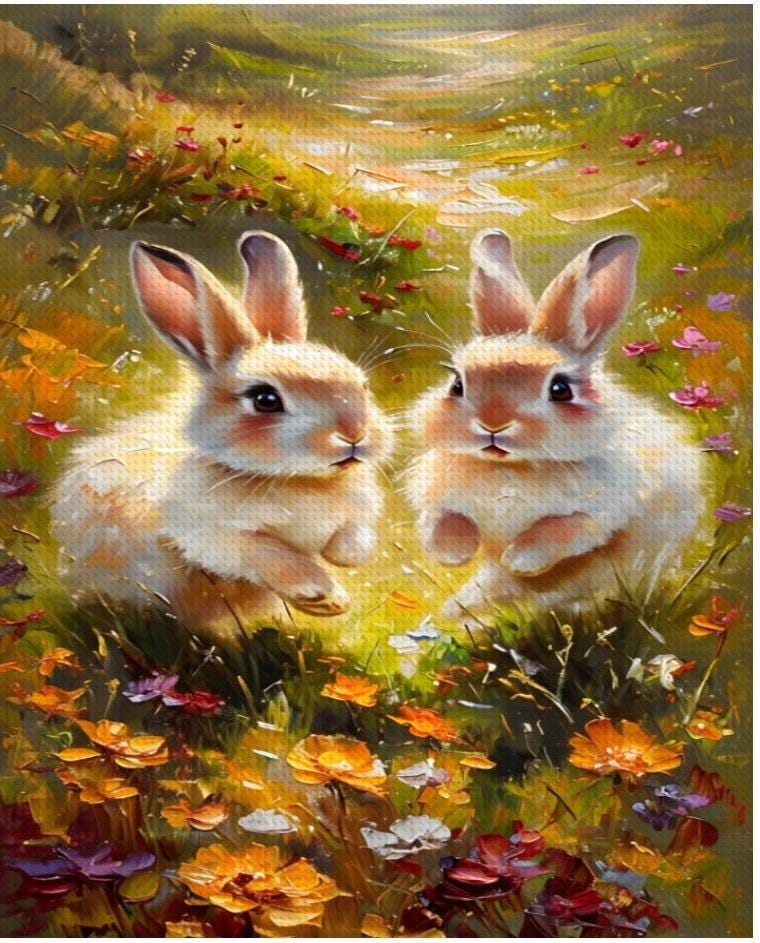 Diamond Painting, Bunnies in a Field of Flowers Art design, Diamond Paintings, DIY, 12”x16” or 16”x20”, Diamond Art
