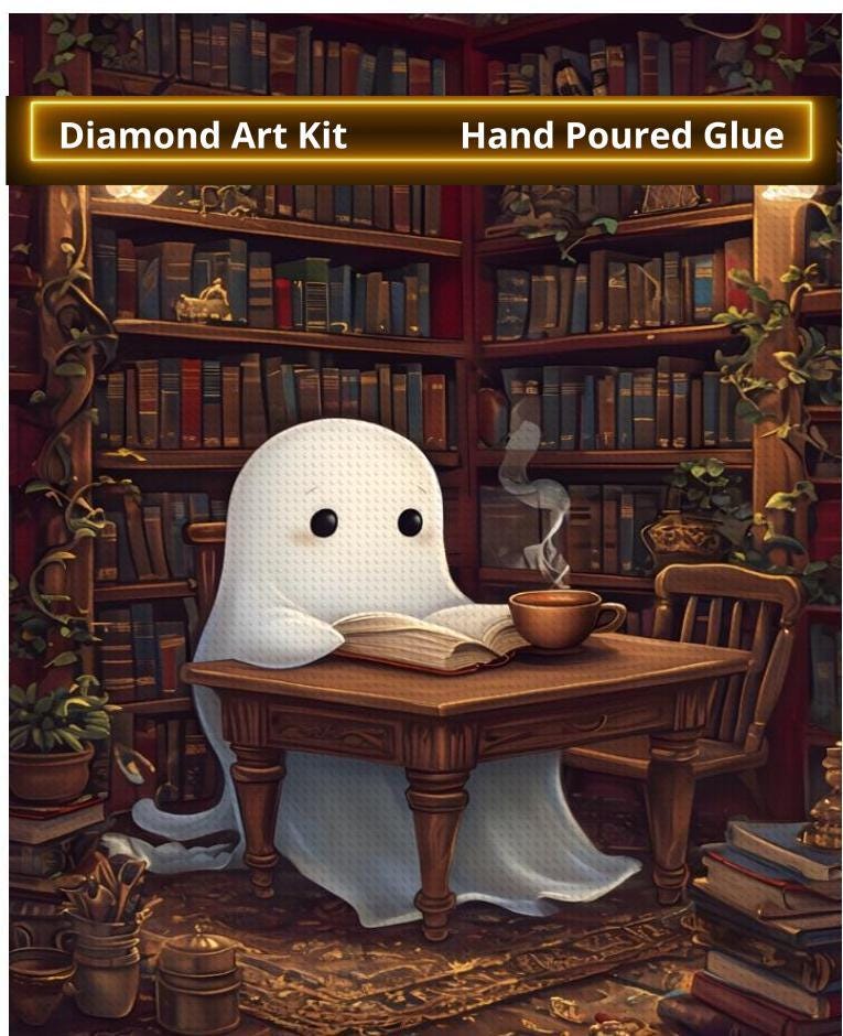 Diamond Painting, Ghost Drinking Coffee Reading in the Library Art design, Diamond Paintings, DIY, 16”x20”, Diamond Art