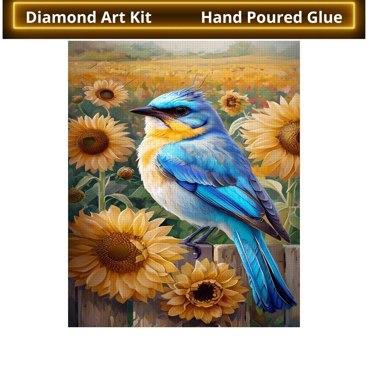 Blue Bird with Yellow Chest in Sunflower Field, DIY, Diamond Painting Kit, Diamond Art on Canvas, Full Kit, Field of Flowers with White Fence and Bird Watching,