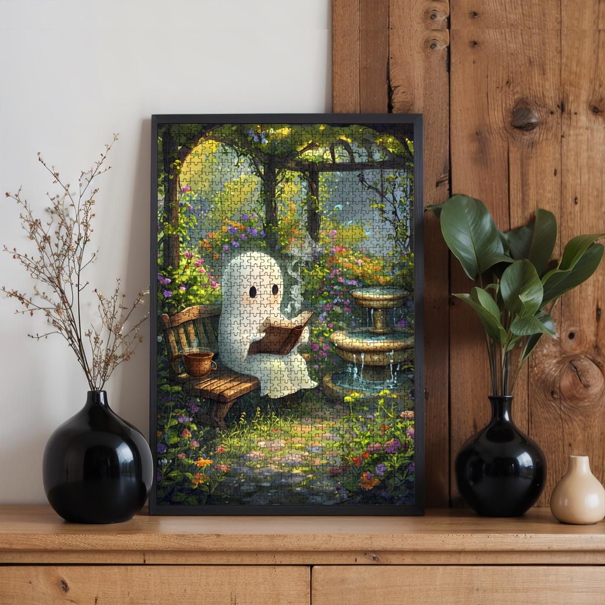 This whimsical artwork features a sweet ghost reading in a magical garden filled with flowers, lantern light, and cozy cottagecore vibes, creating a calming and joyful puzzle experience. Designed for adults and families, it offers both a relaxing challenge and a beautiful finished piece that can be framed as wall art.