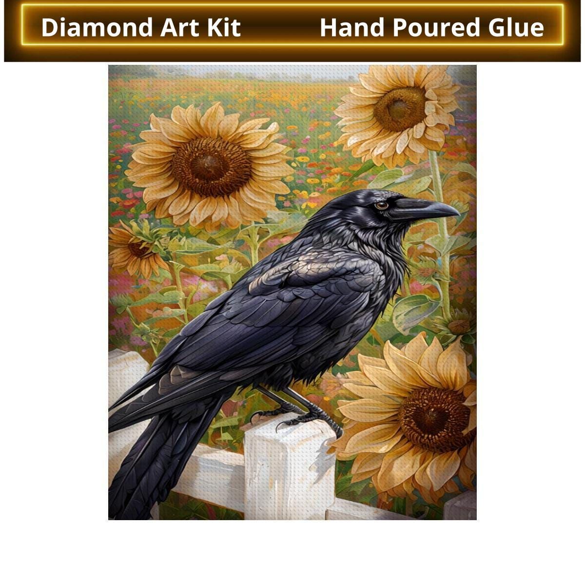 Crow in Sunflower Field, DIY, Diamond Painting Kit, Diamond Art on Canvas, Full Kit, Field of Flowers with White Fence and Crow Watching,