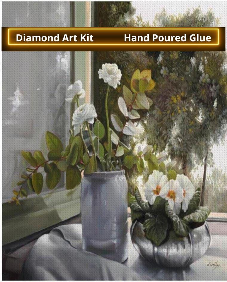 White Flowers Window View, Diamond Art Kit, Fiori Bianchi Alla Finestra by Guido Borelli Art Design Vintage Art