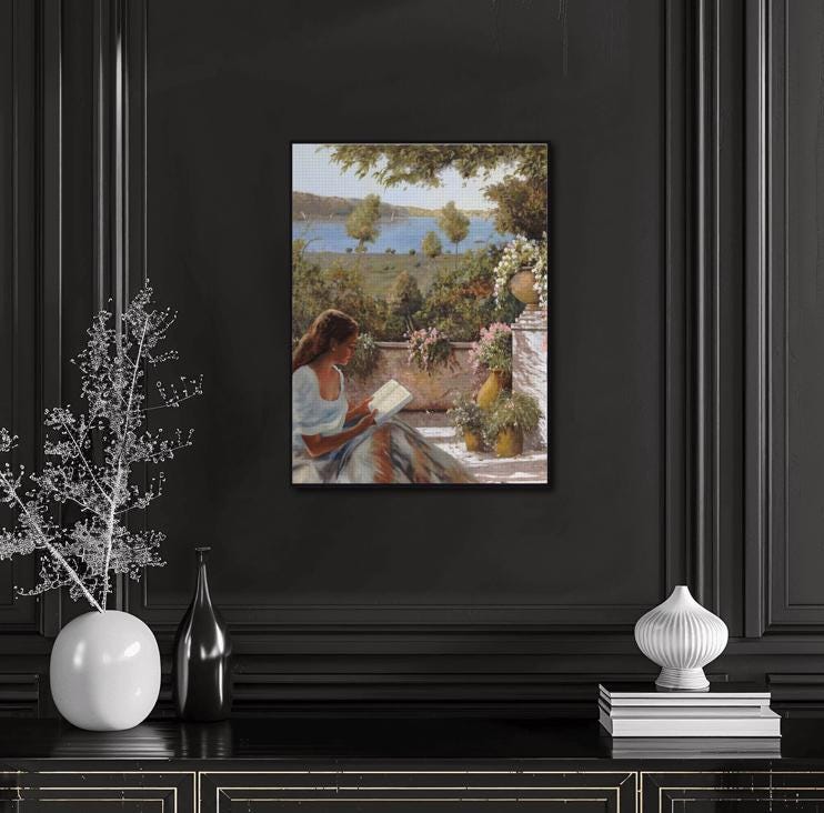 Diamond Painting, Vintage Art by Guido Borelli Design, Featuring Girl in the Garden Reading, Vibrant, Diamond Paintings, DIY, 12”x16” or 16”x20” or 20”x28”, Diamond Art