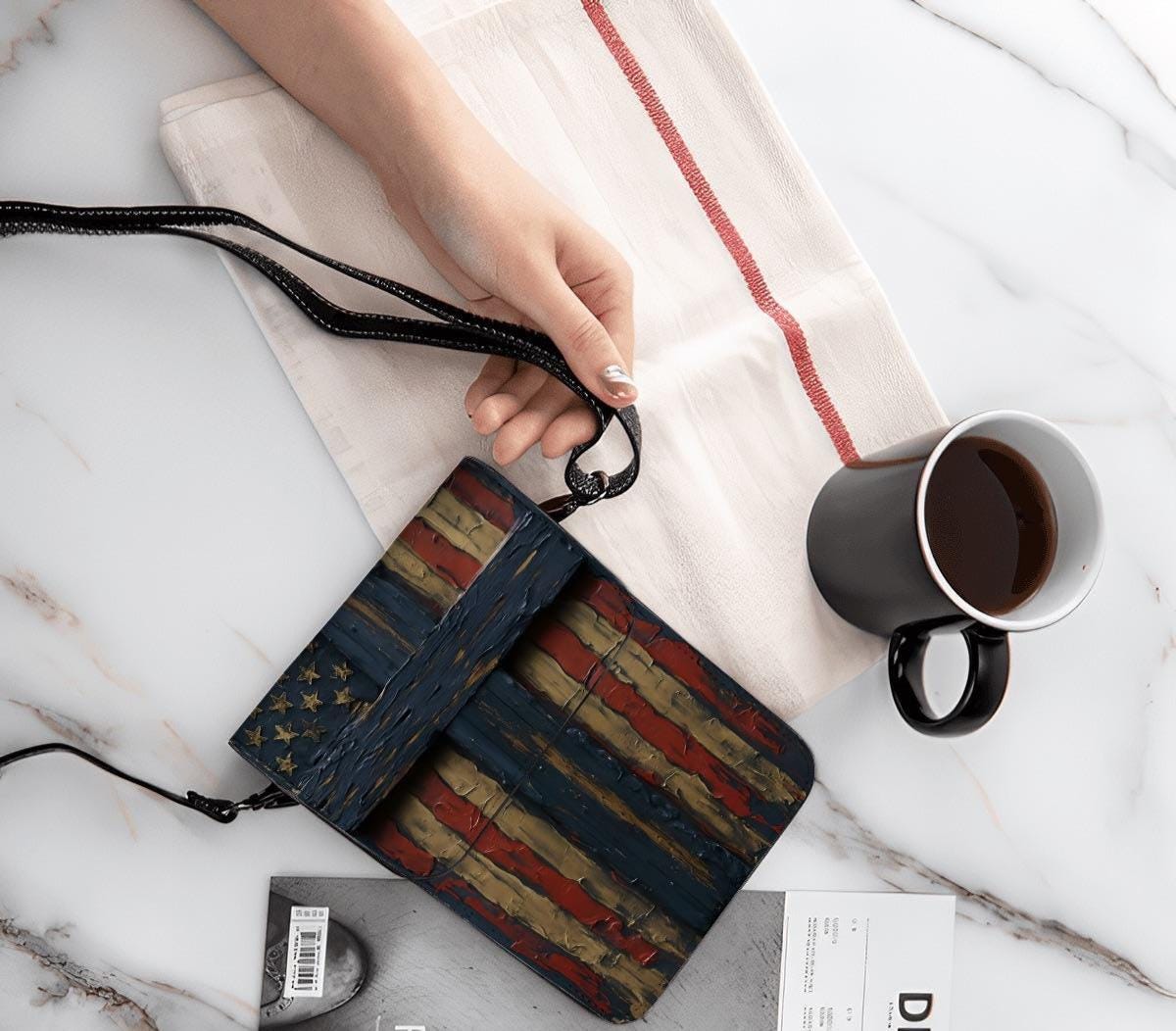 Wooden Cross and American Flag Design Shoulder or Crossbody Phone Wallet is a small faux leather purse with card slots, perfect for carrying your phone, cards, and other small items. Americana, Patriotic