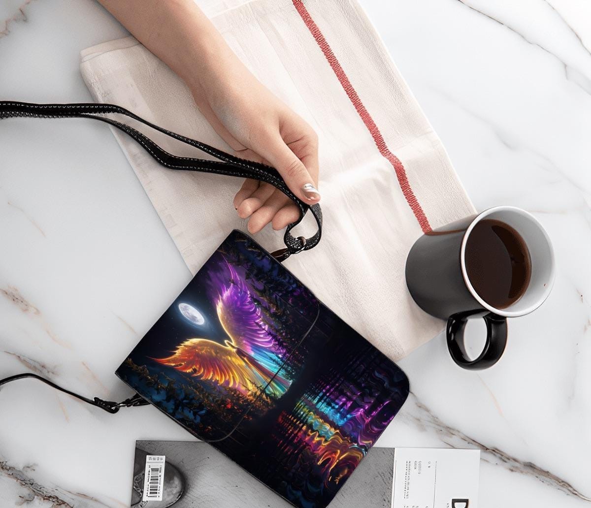 Leather Cell Phone Purse With Shoulder Strap, Angel in the Forest, Reflection Pool Lake