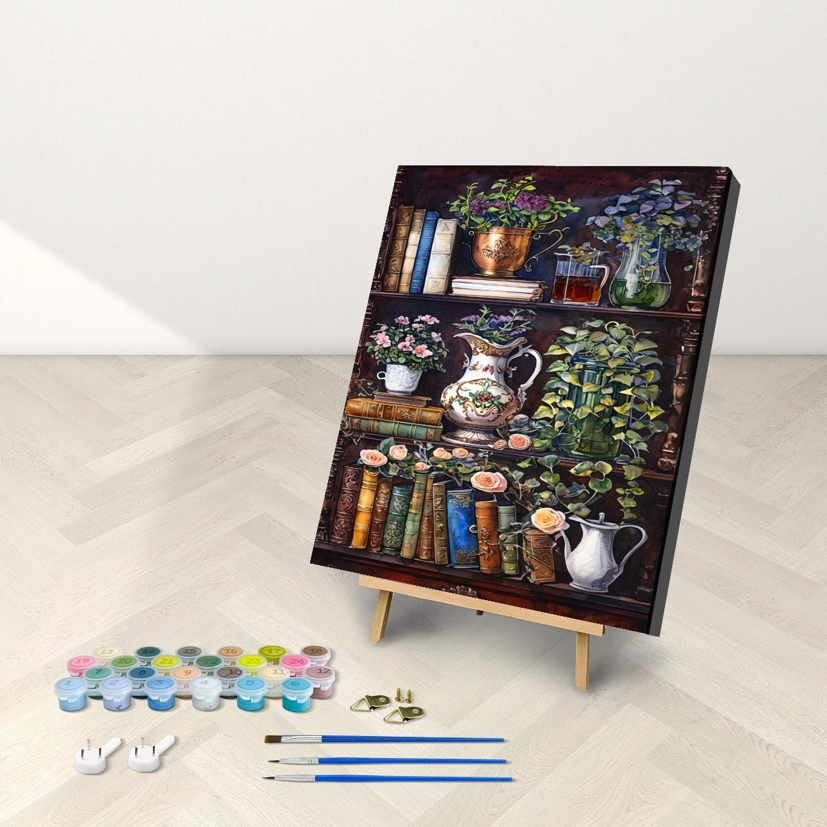 Framed or Frameless Paint by Numbers Kit for Adults with Stand Painting of Vintage Books and Plants on a Bookshelf, Art Kit, PBN