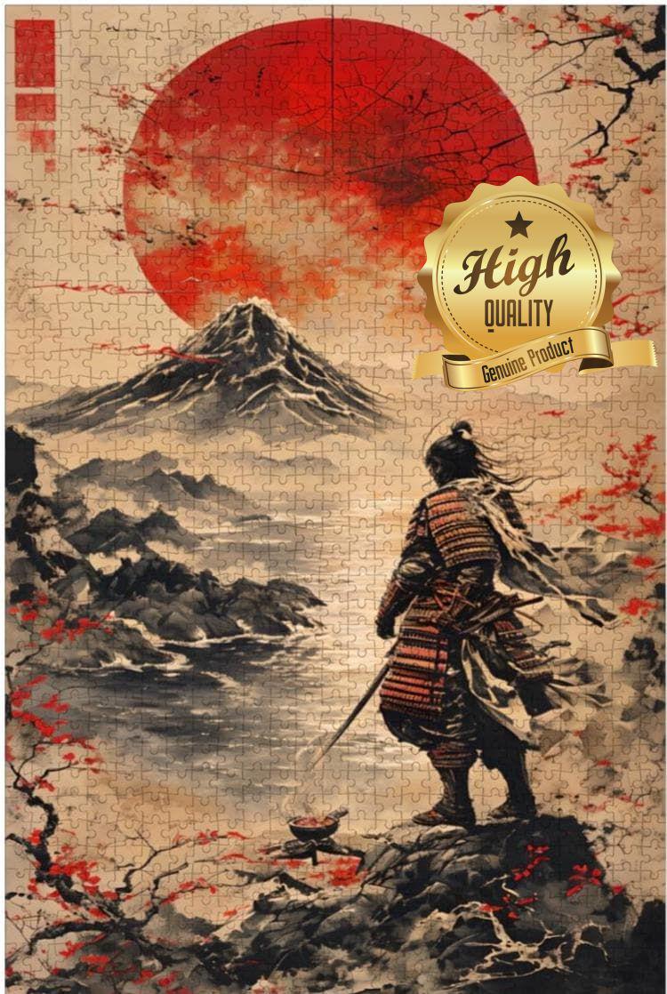 Jigsaw Puzzles: Samurai Looking over Mountain Sky View with Red Sun, Precision Cut, Wood, 300, 500 or 1000 pieces. An ideal choice for relaxation and stress relief, especially for adults during leisure time. Once completed, the puzzle can be framed as decor, adding a personal touch to home or office spaces, making it a perfect gift for friends and family.