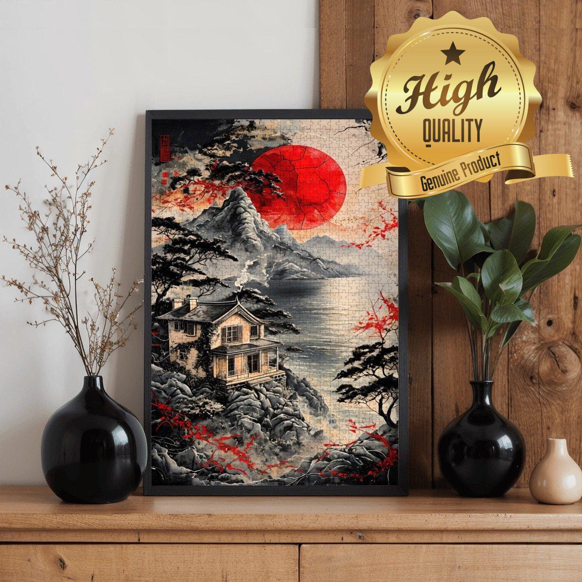 Jigsaw Puzzles: Seaside House Lake View with Red Sun, Precision Cut, Wood, 300, 500 or 1000 pieces. An ideal choice for relaxation and stress relief, especially for adults during leisure time. Once completed, the puzzle can be framed as decor, adding a personal touch to home or office spaces, making it a perfect gift for friends and family.