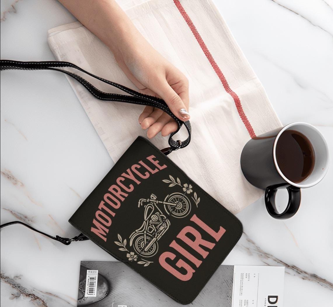 Leather Cell Phone Purse With Shoulder Strap, Motorcycle Girl in Pink