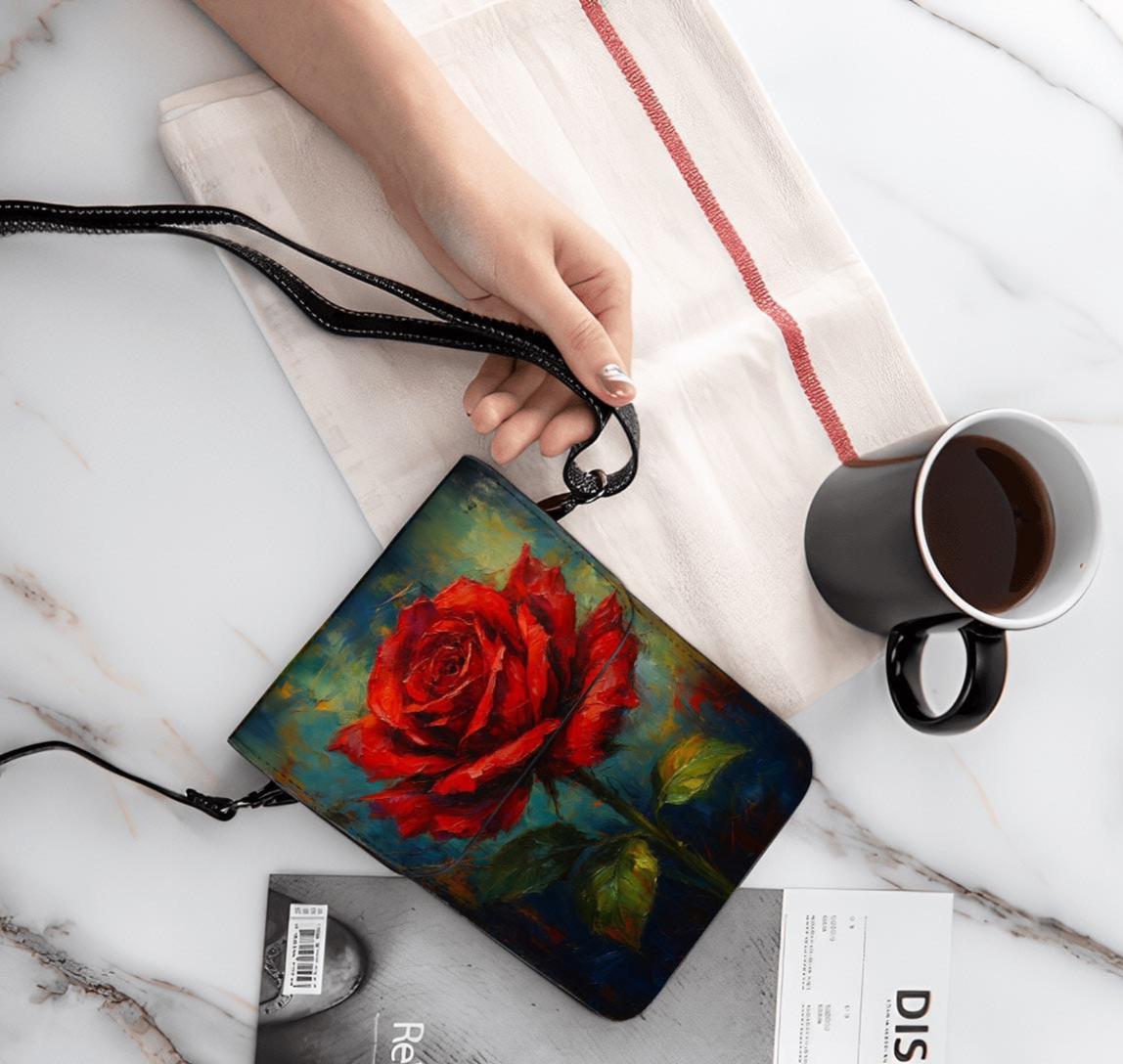 Red Rose, Leather Cell Phone Purse With Shoulder Strap or Adjustable for Crossbody Wear