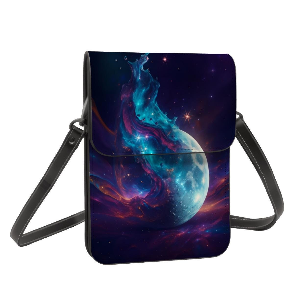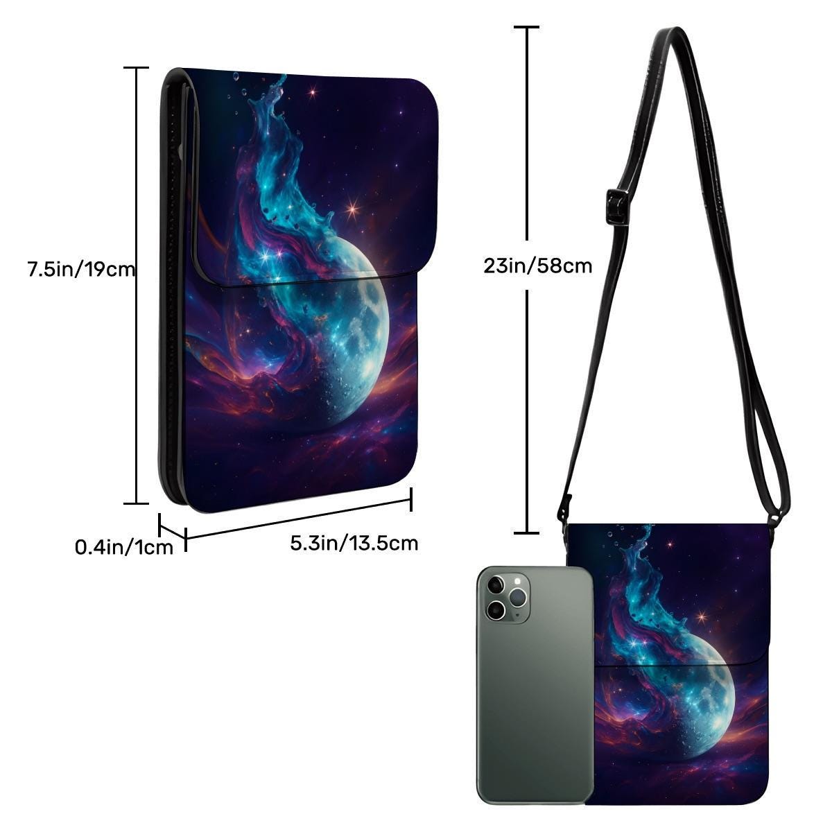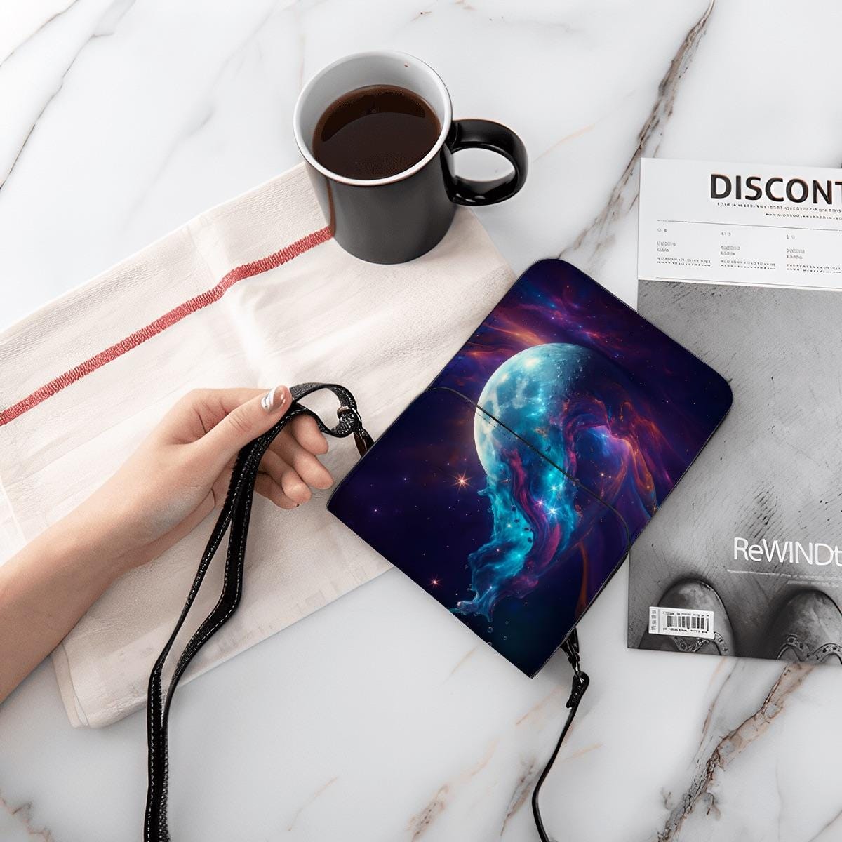 This leather cell phone purse showcases a dramatic galaxy-inspired space design, featuring a glowing planet surrounded by swirling nebula clouds in deep blues, purples, and teal tones, as shown in the images above. The artwork has a luminous, high-detail look that feels celestial, modern, and bold.