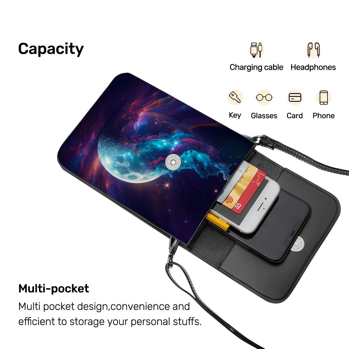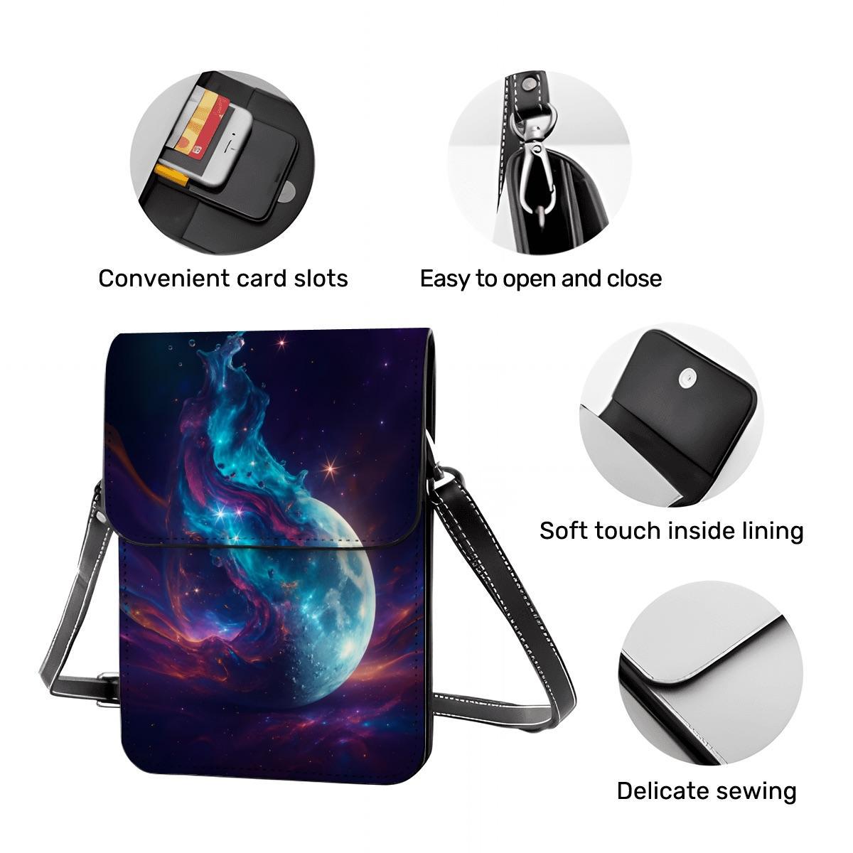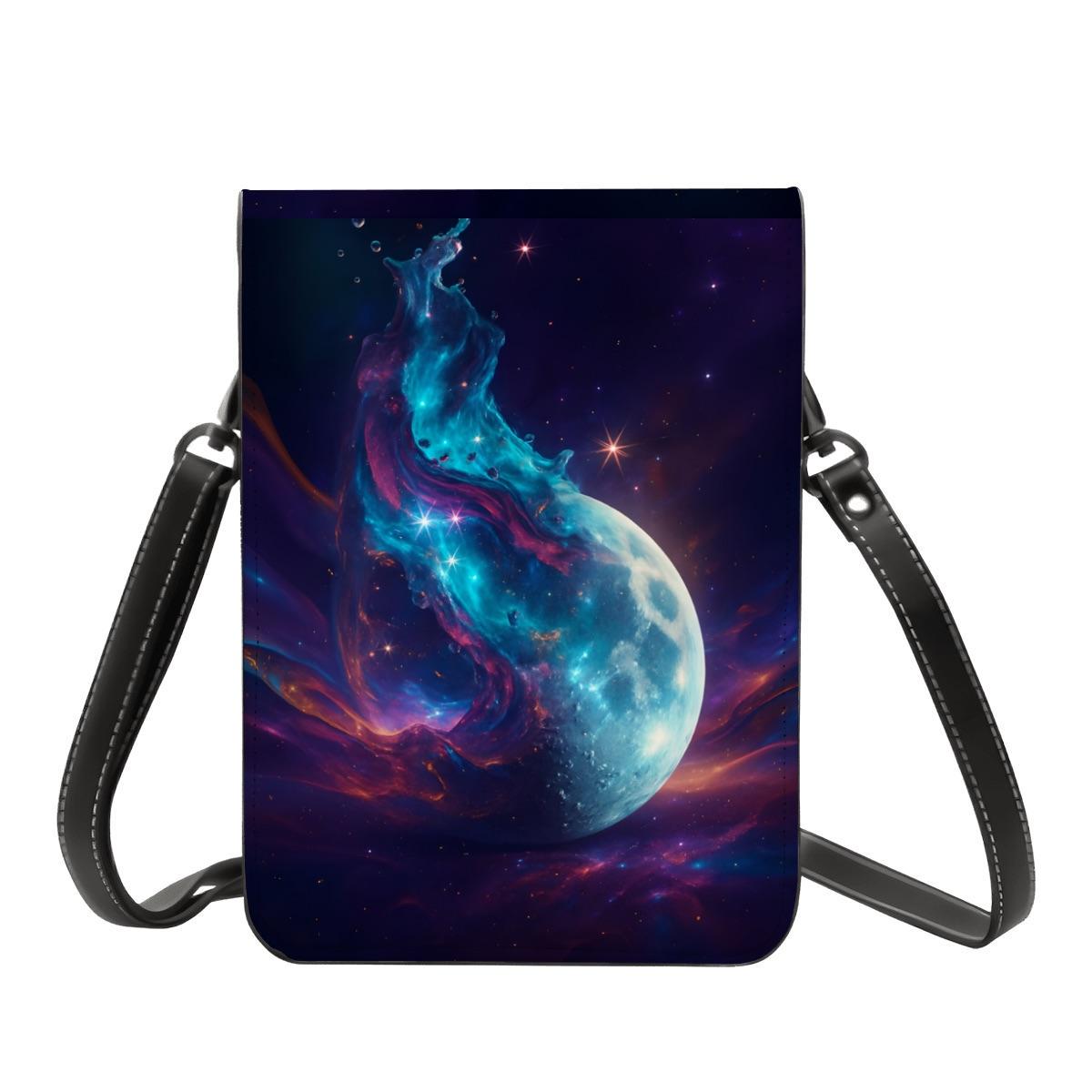 This leather cell phone purse showcases a dramatic galaxy-inspired space design, featuring a glowing planet surrounded by swirling nebula clouds in deep blues, purples, and teal tones, as shown in the images above. The artwork has a luminous, high-detail look that feels celestial, modern, and bold.