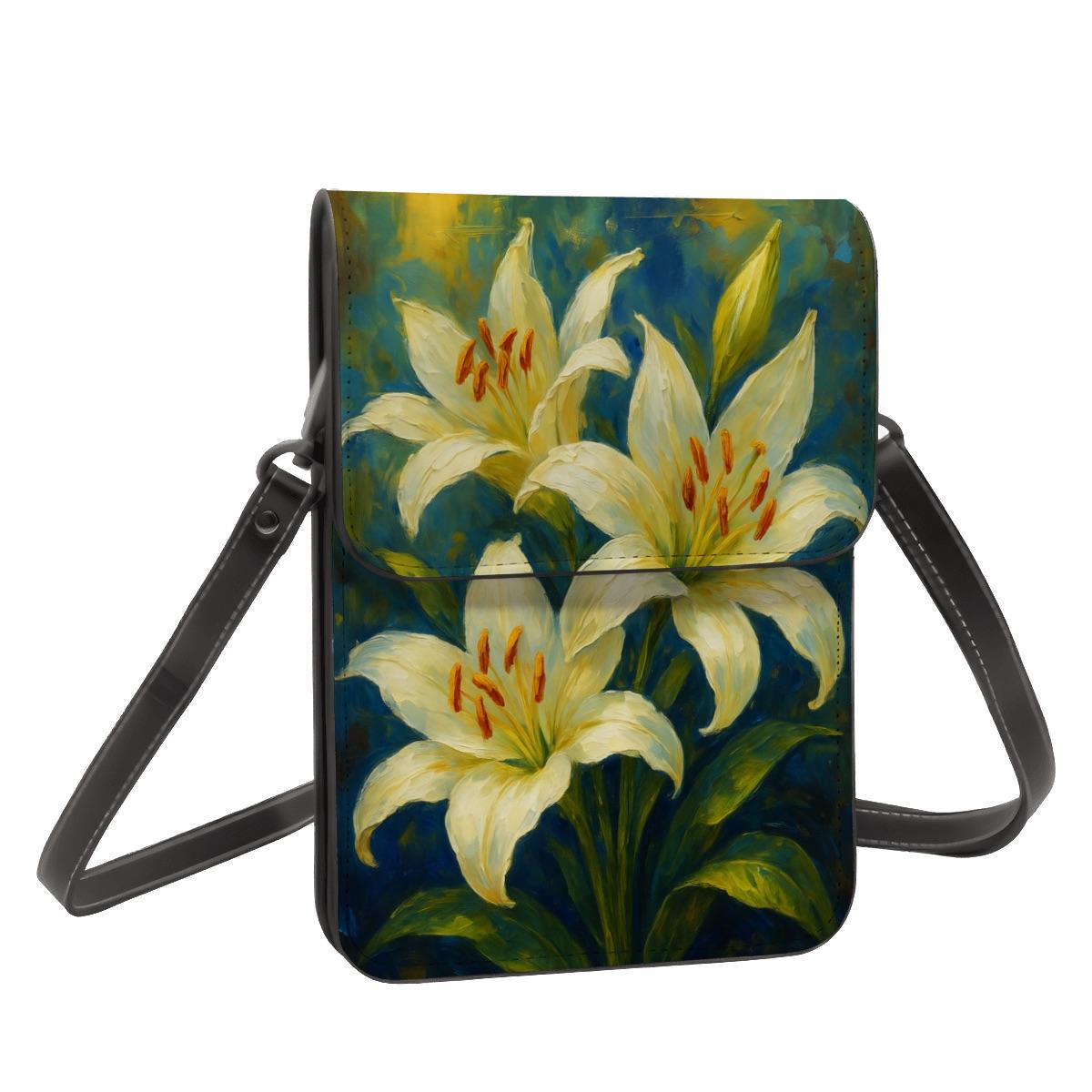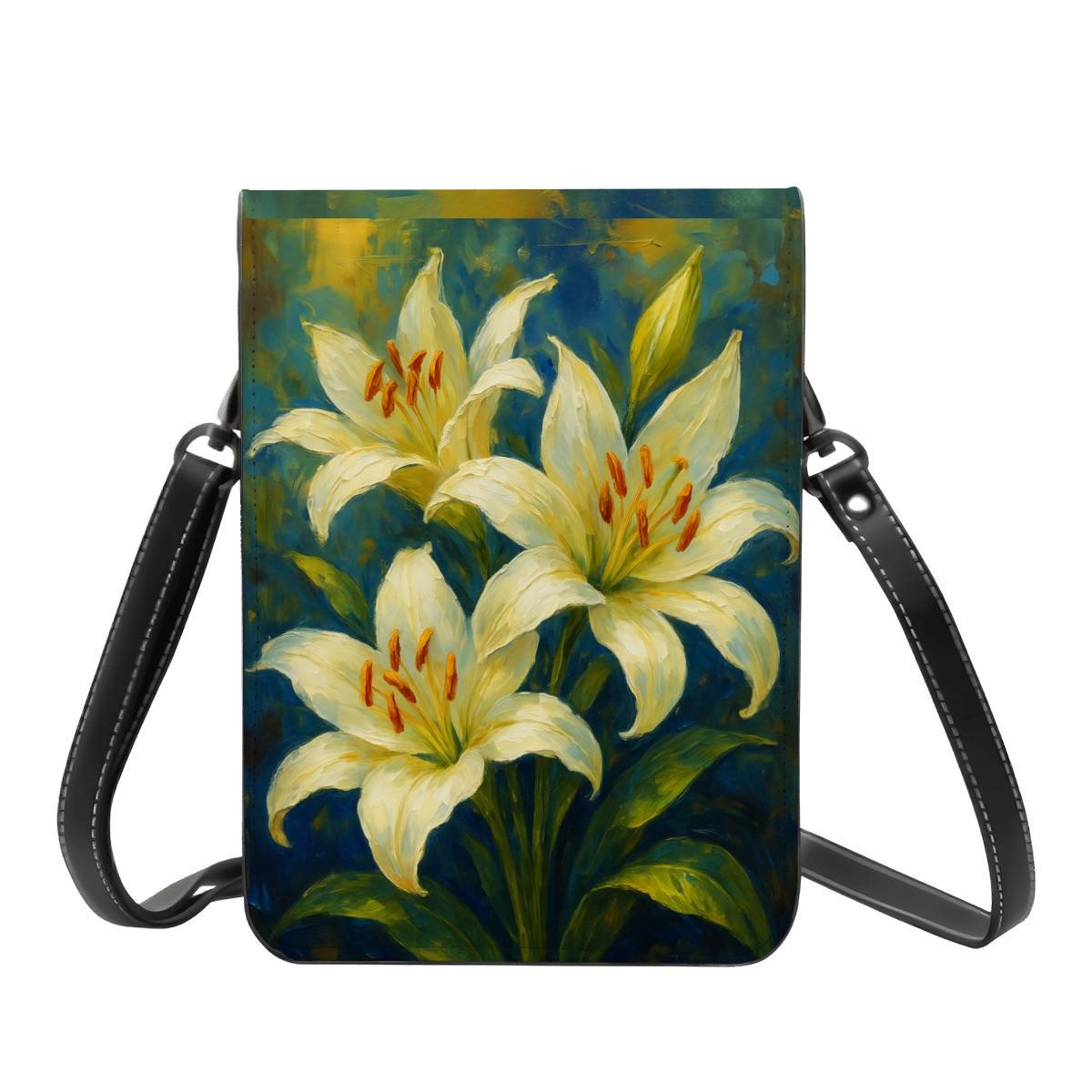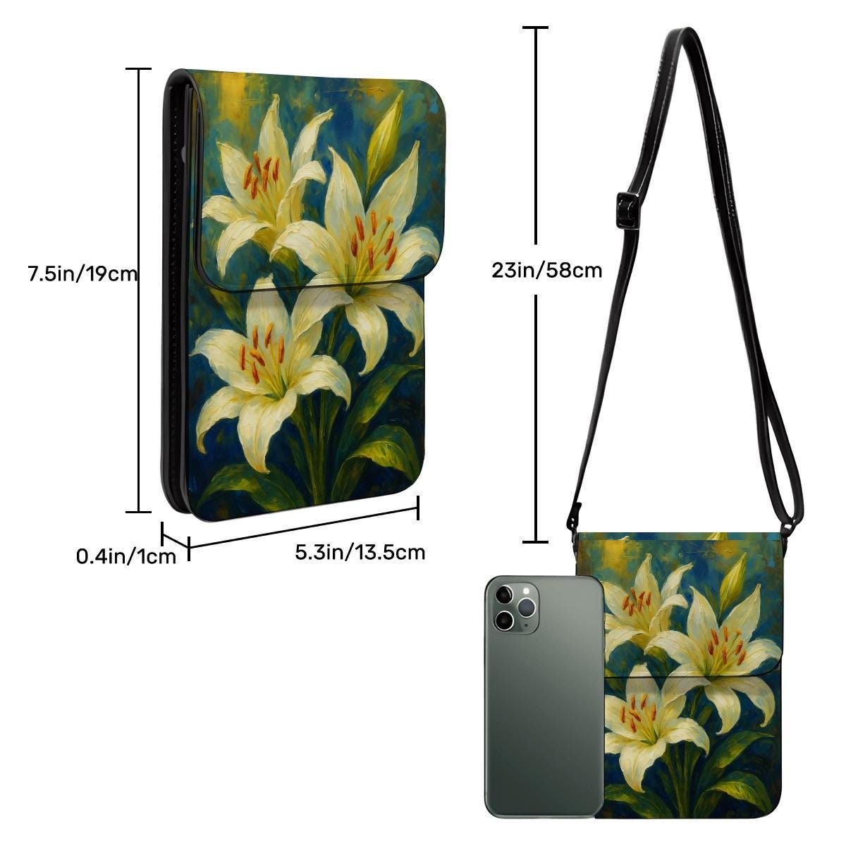 White Lillies, Oil Painting Design Purse, Leather Cell Phone Purse With Shoulder Strap or Adjustable for Crossbody Wear