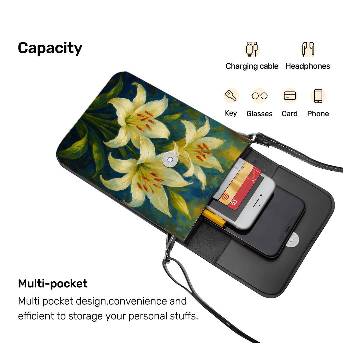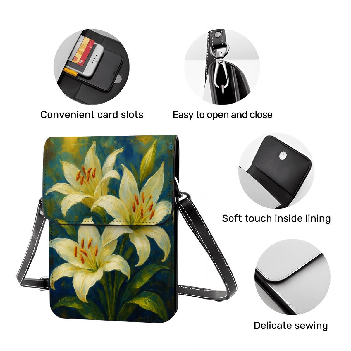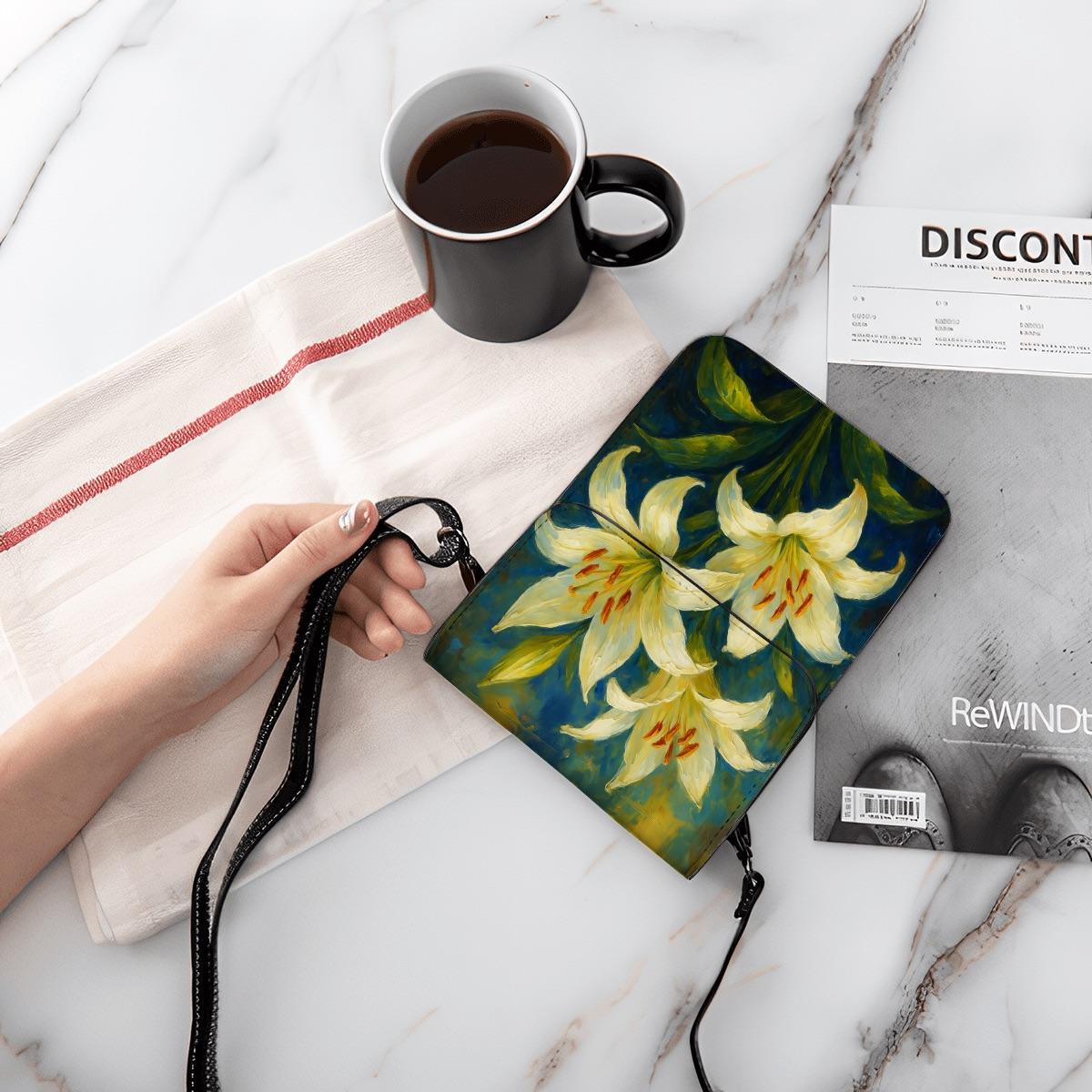 White Lillies, Oil Painting Design Purse, Leather Cell Phone Purse With Shoulder Strap or Adjustable for Crossbody Wear