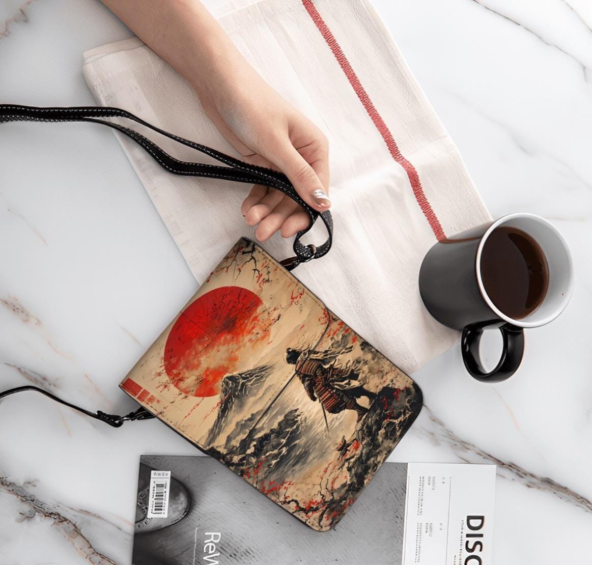 This beautiful crossbody cell phone purse features a Japanese Samurai silhouette under a striking red sun, designed in rich warm tones with a scenic mountain landscape. Stylish, versatile, and lightweight — perfect for everyday use.