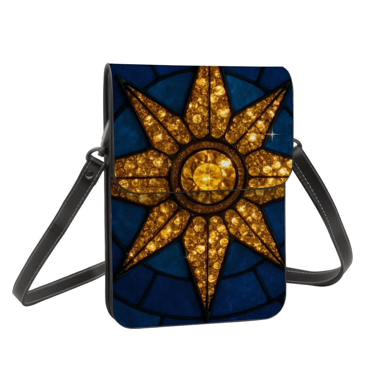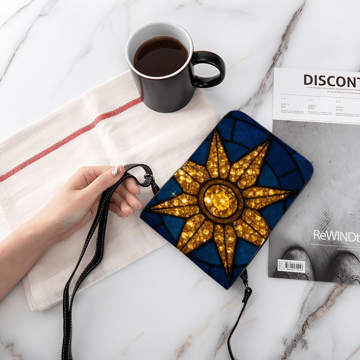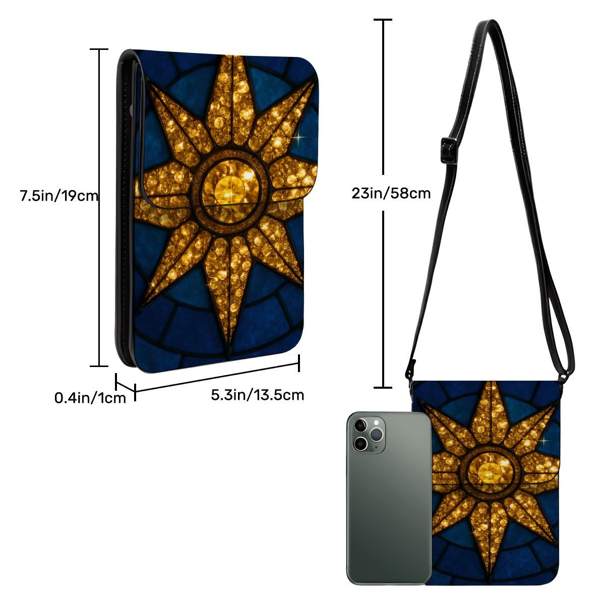 This leather cell phone purse features a bold stained-glass style sunburst design, shown in the photos above. The artwork displays a golden geometric starburst with textured, mosaic-like detailing set against a deep navy blue background, giving the bag a rich, luminous look inspired by stained glass windows.