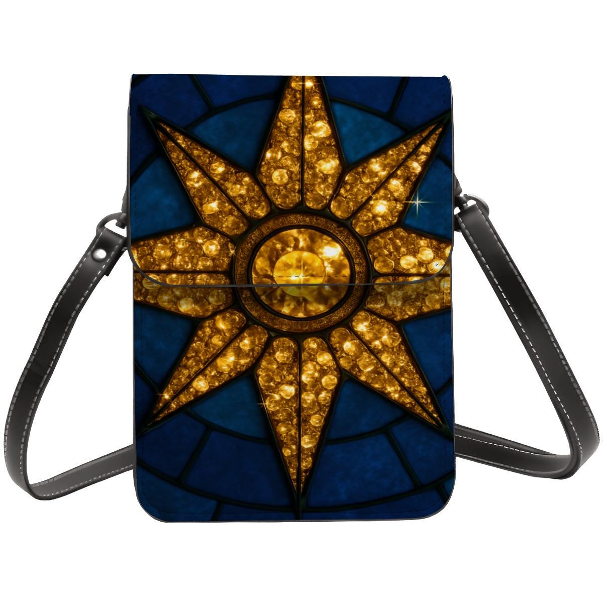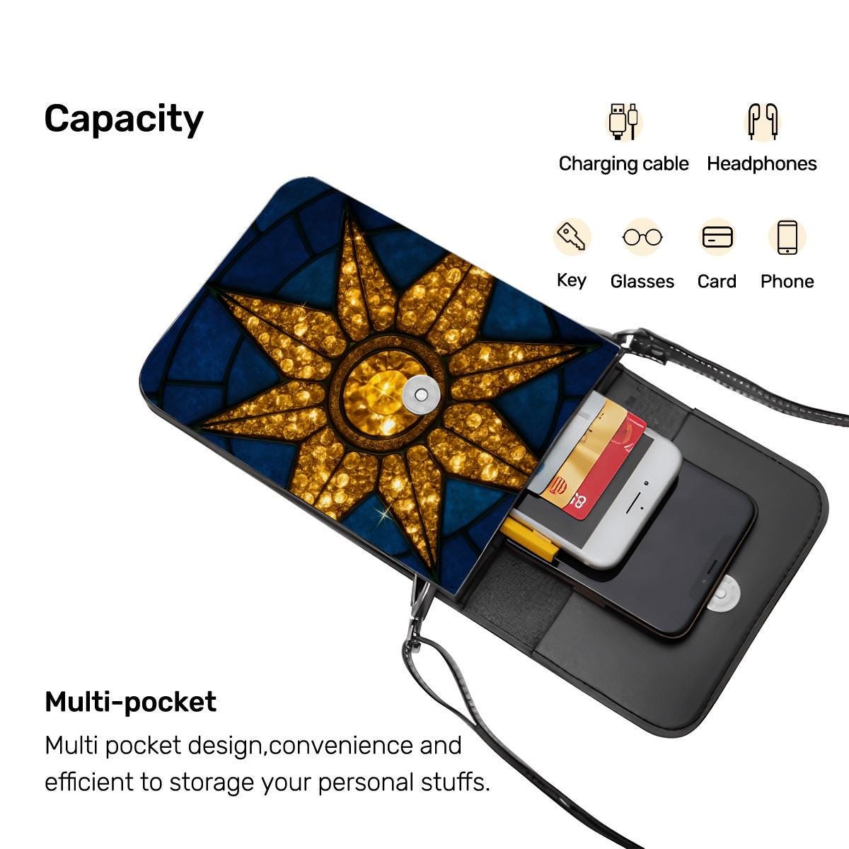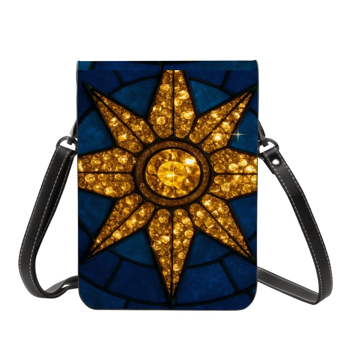 This leather cell phone purse features a bold stained-glass style sunburst design, shown in the photos above. The artwork displays a golden geometric starburst with textured, mosaic-like detailing set against a deep navy blue background, giving the bag a rich, luminous look inspired by stained glass windows.