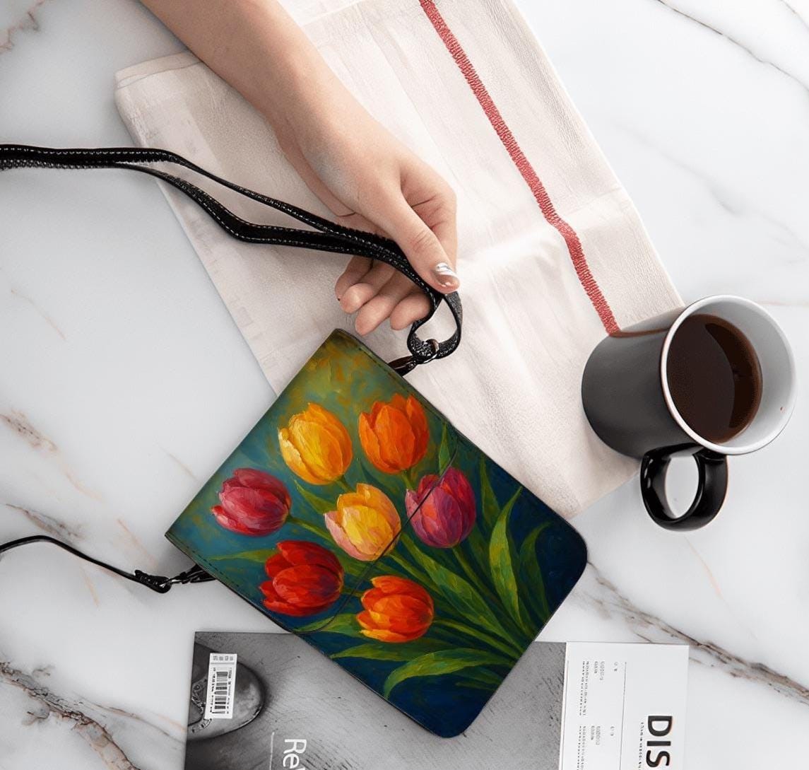 Bring beauty everywhere you go with this Floral Leather Cell Phone Crossbody Purse. Designed with vibrant hand-painted style tulips, this small purse is both stylish and practical, perfect for busy days, trips, errands, work, shopping, concerts, walks, travel and more.