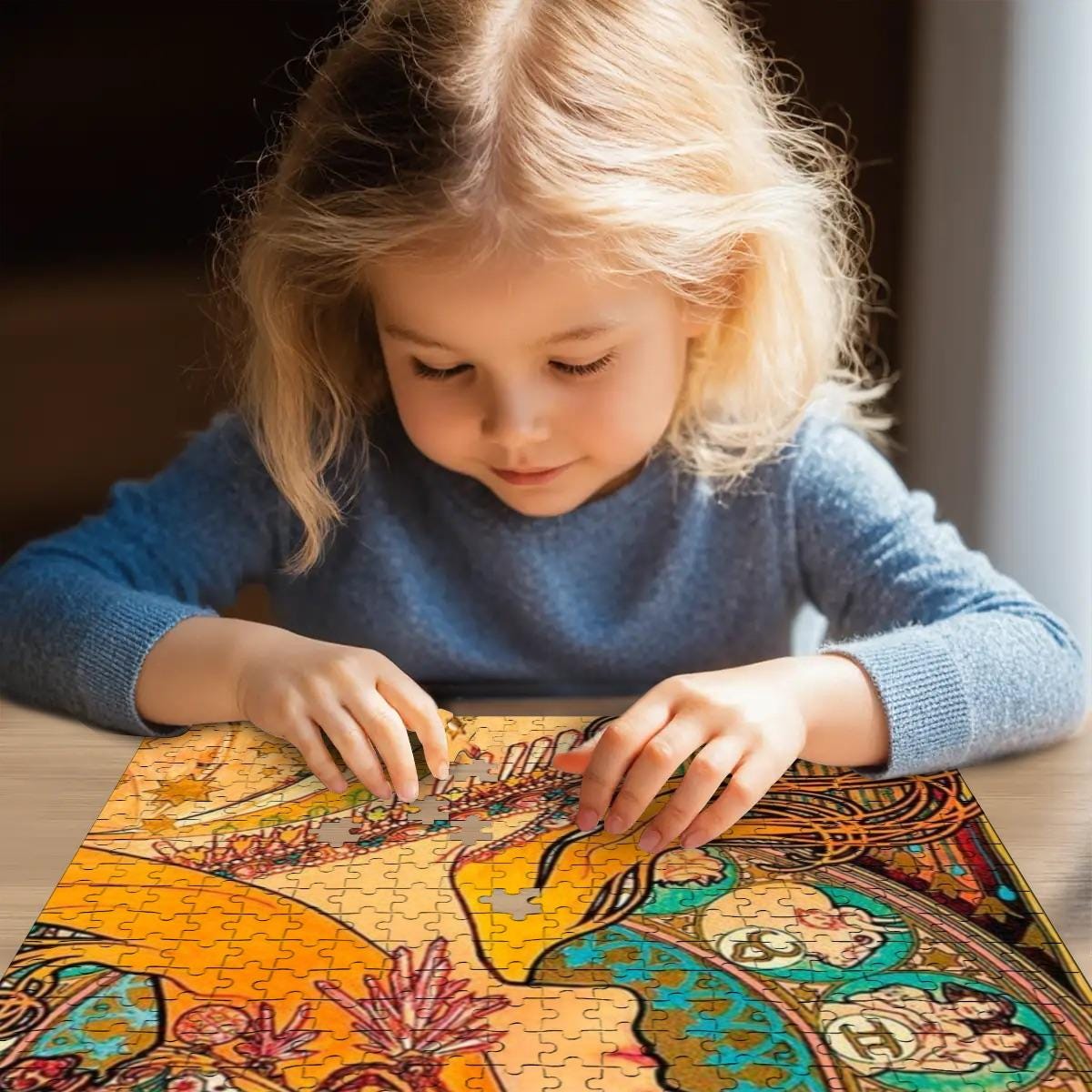 This stunning Art Nouveau masterpiece by Alphonse Mucha features a graceful zodiac goddess surrounded by flowing floral motifs and planetary symbols. With warm golden tones and rich jewel-like greens, this puzzle is both visually captivating and meditative to assemble.