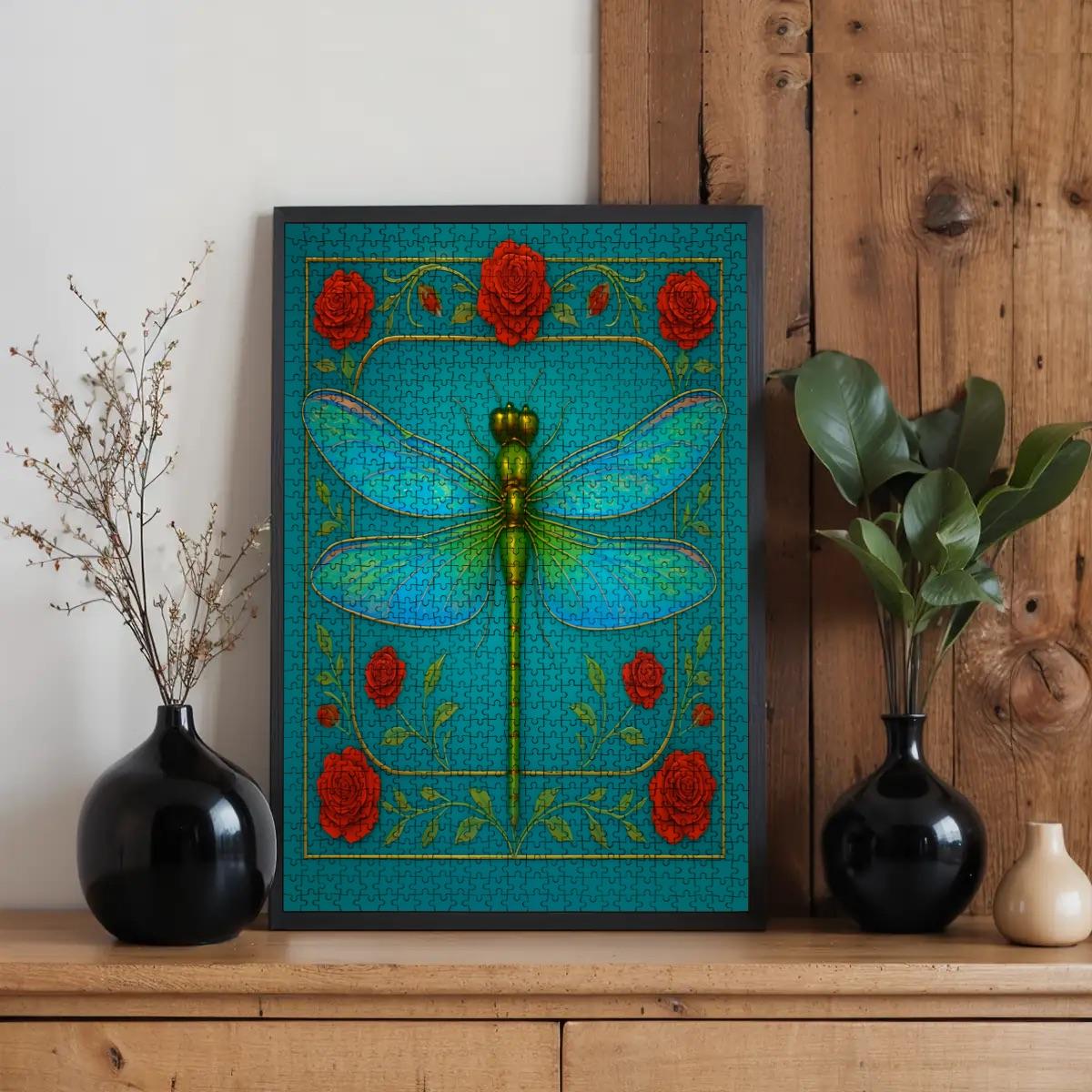 ✨ Dragonfly & Roses Wooden Jigsaw Puzzle – 500 or 1000 Pieces