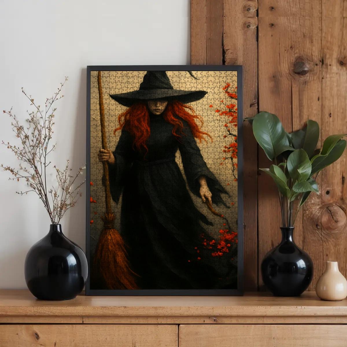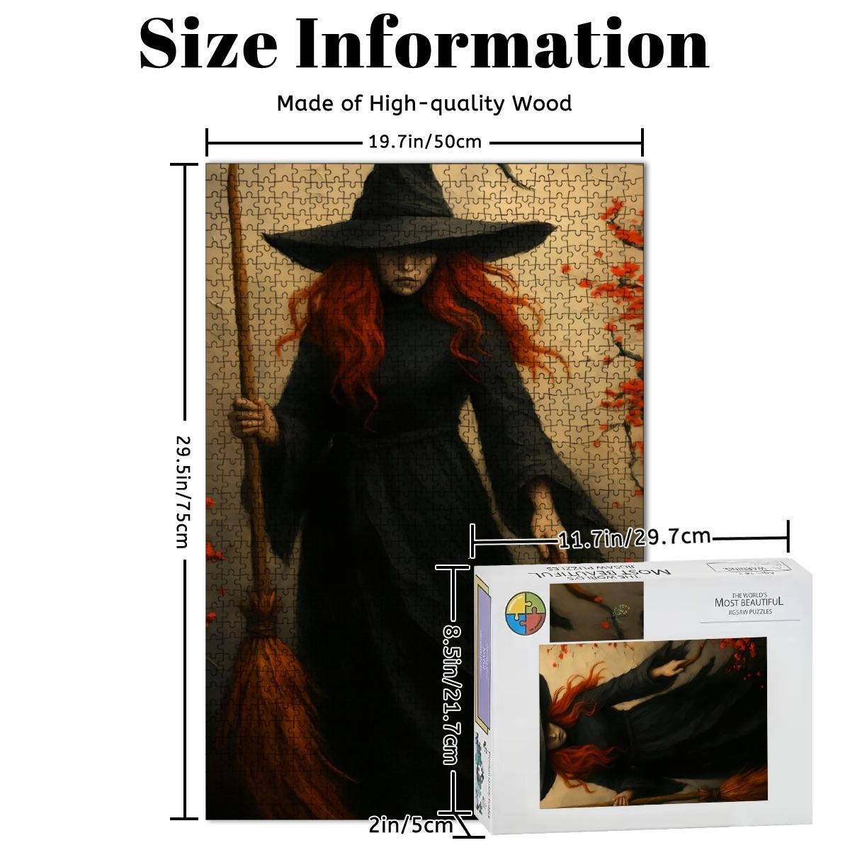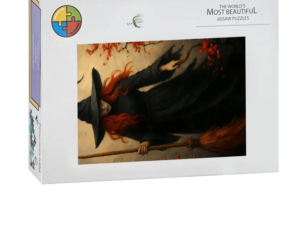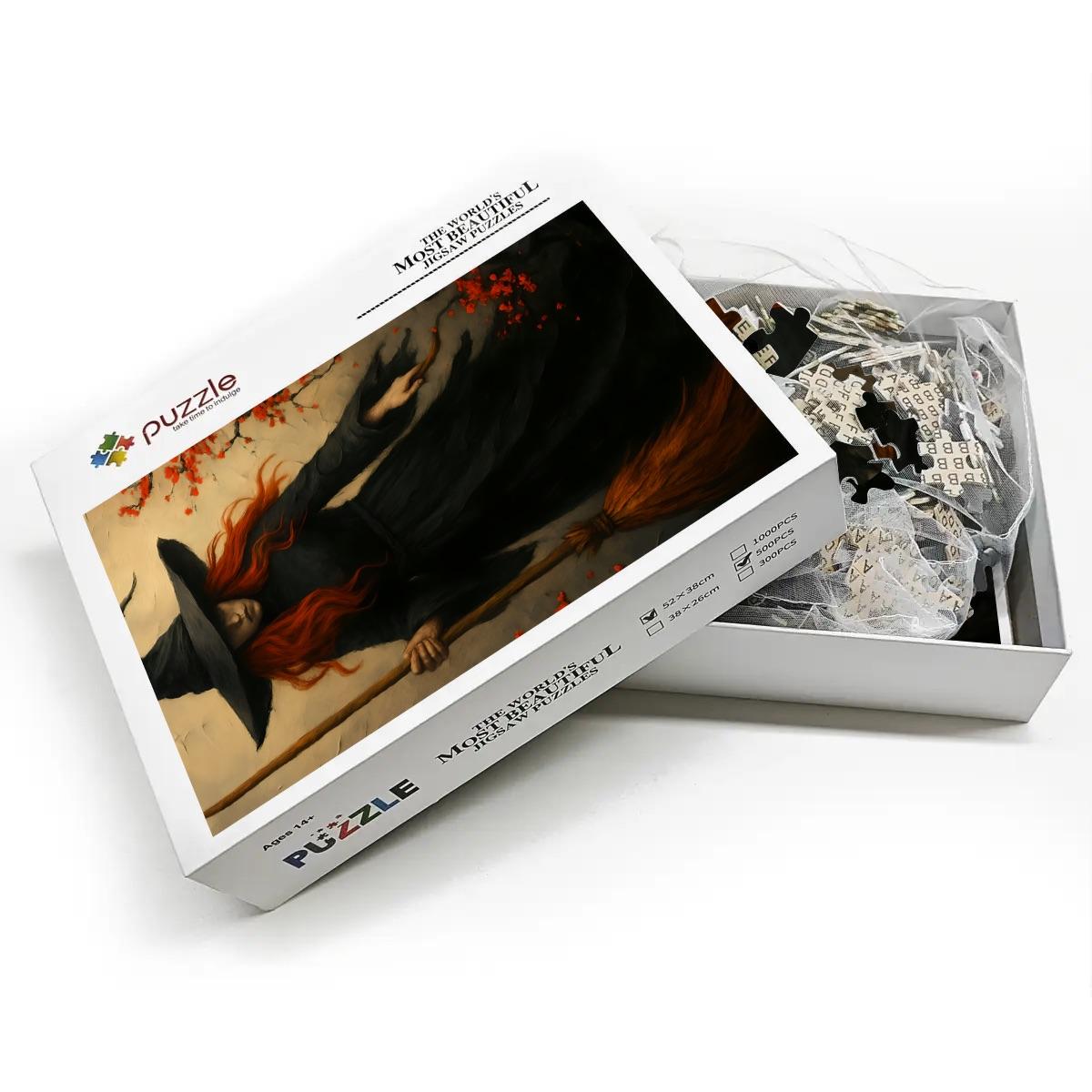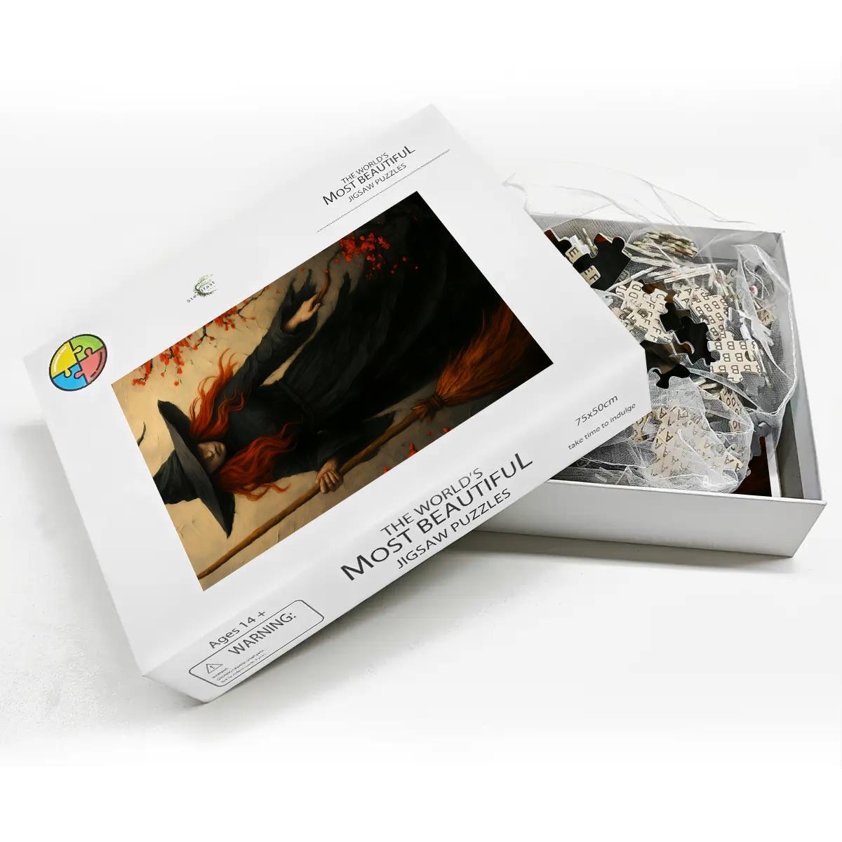 This dramatic witch artwork puzzle makes a stunning and challenging activity for adults who love dark fantasy, autumn vibes, and cozy cottagecore decor. Made from durable oak wood and printed with rich UV color for long-lasting vibrancy, the finished puzzle can be framed and displayed as unique wall art.