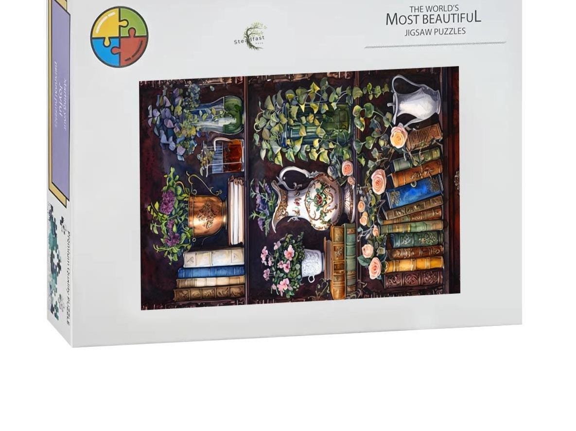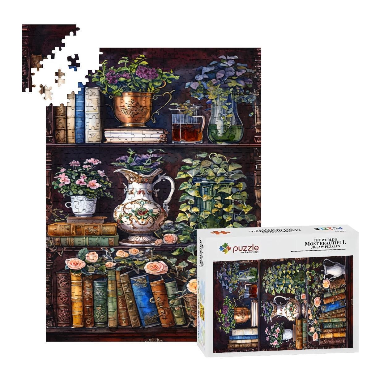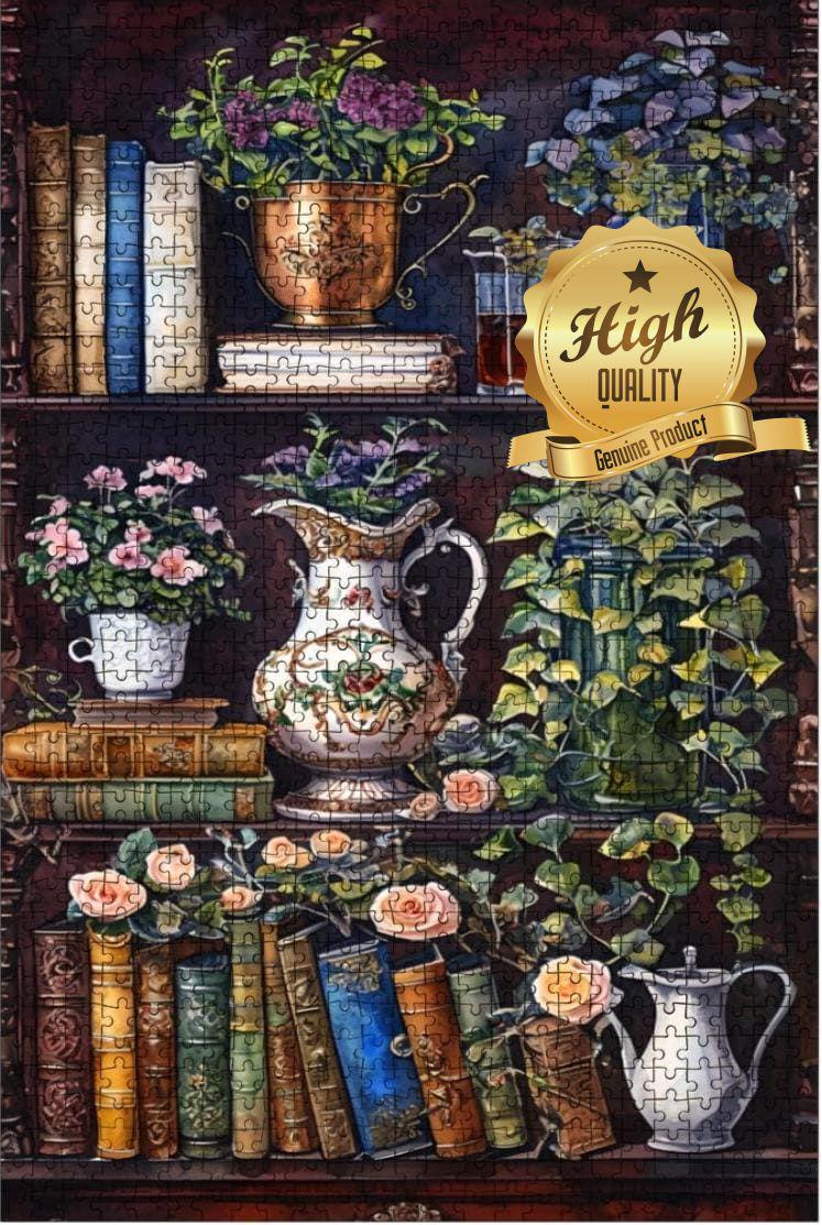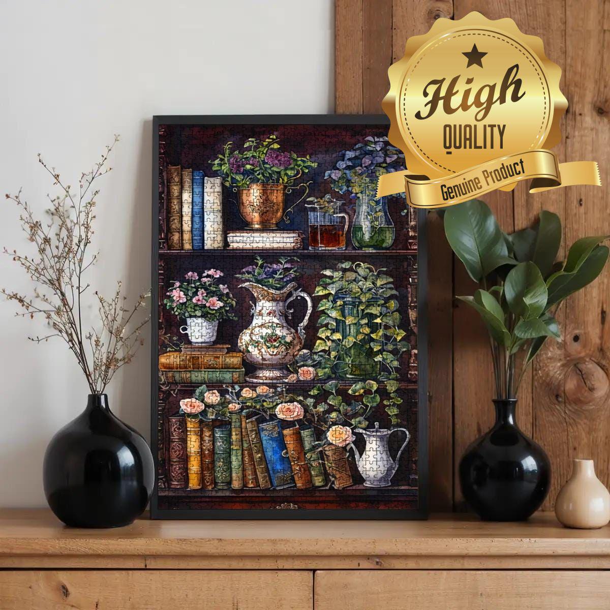 A warm, inviting cottagecore bookshelf scene filled with stacked books, blooming flowers, silver tea pots, and lush greenery. This puzzle is perfect for slow mornings, rainy afternoons, and quiet, relaxing evenings β a comforting and wholesome puzzle experience that becomes beautiful home dΓ©cor once framed.