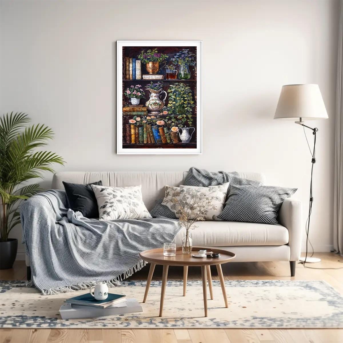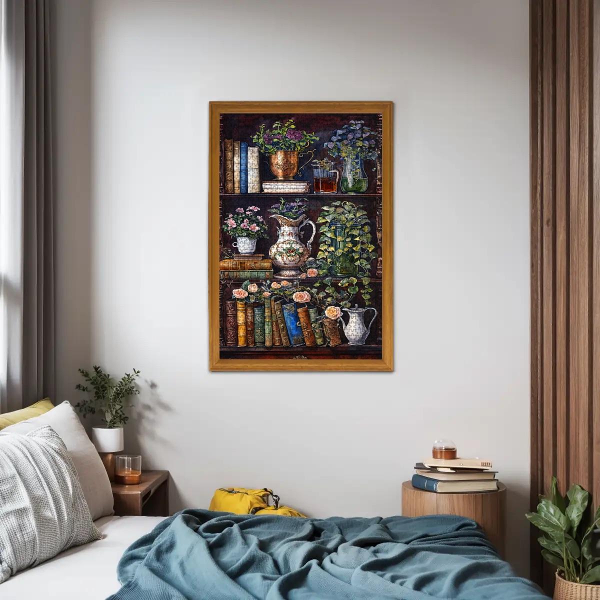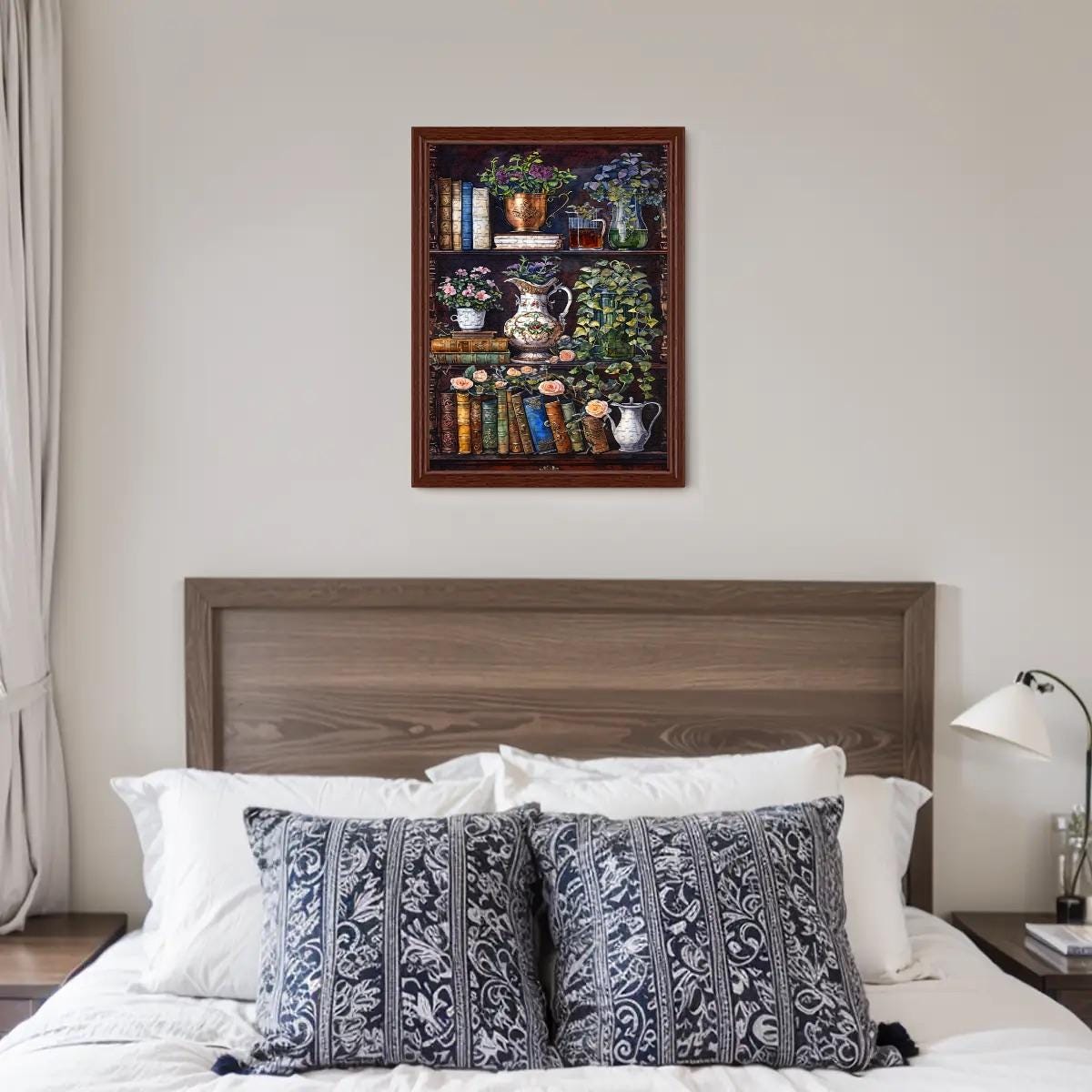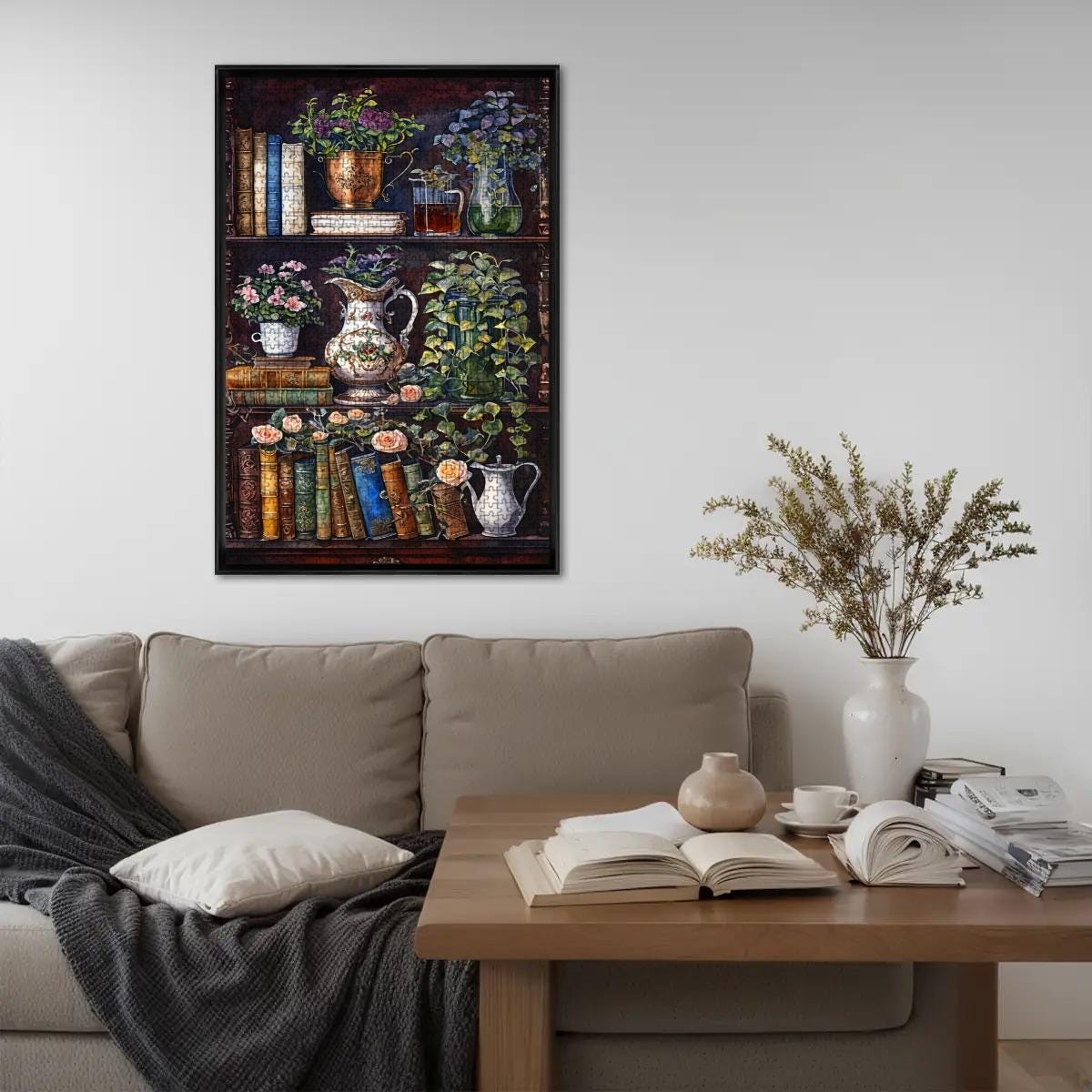 A warm, inviting cottagecore bookshelf scene filled with stacked books, blooming flowers, silver tea pots, and lush greenery. This puzzle is perfect for slow mornings, rainy afternoons, and quiet, relaxing evenings β a comforting and wholesome puzzle experience that becomes beautiful home dΓ©cor once framed.