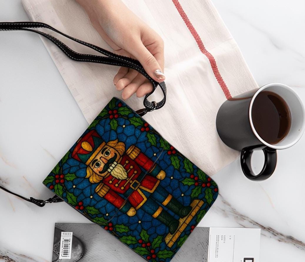 This festive crossbody phone purse features a classic Nutcracker soldier in a beautiful stained glass style with holly leaves and red holiday accents. Cozy, charming, and perfect for the holiday season.