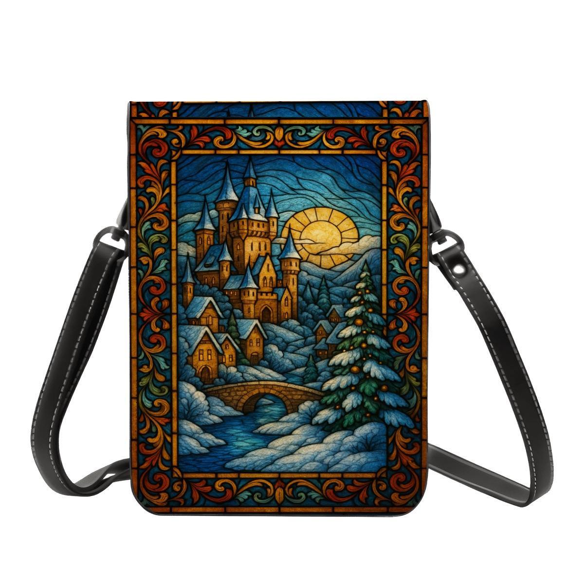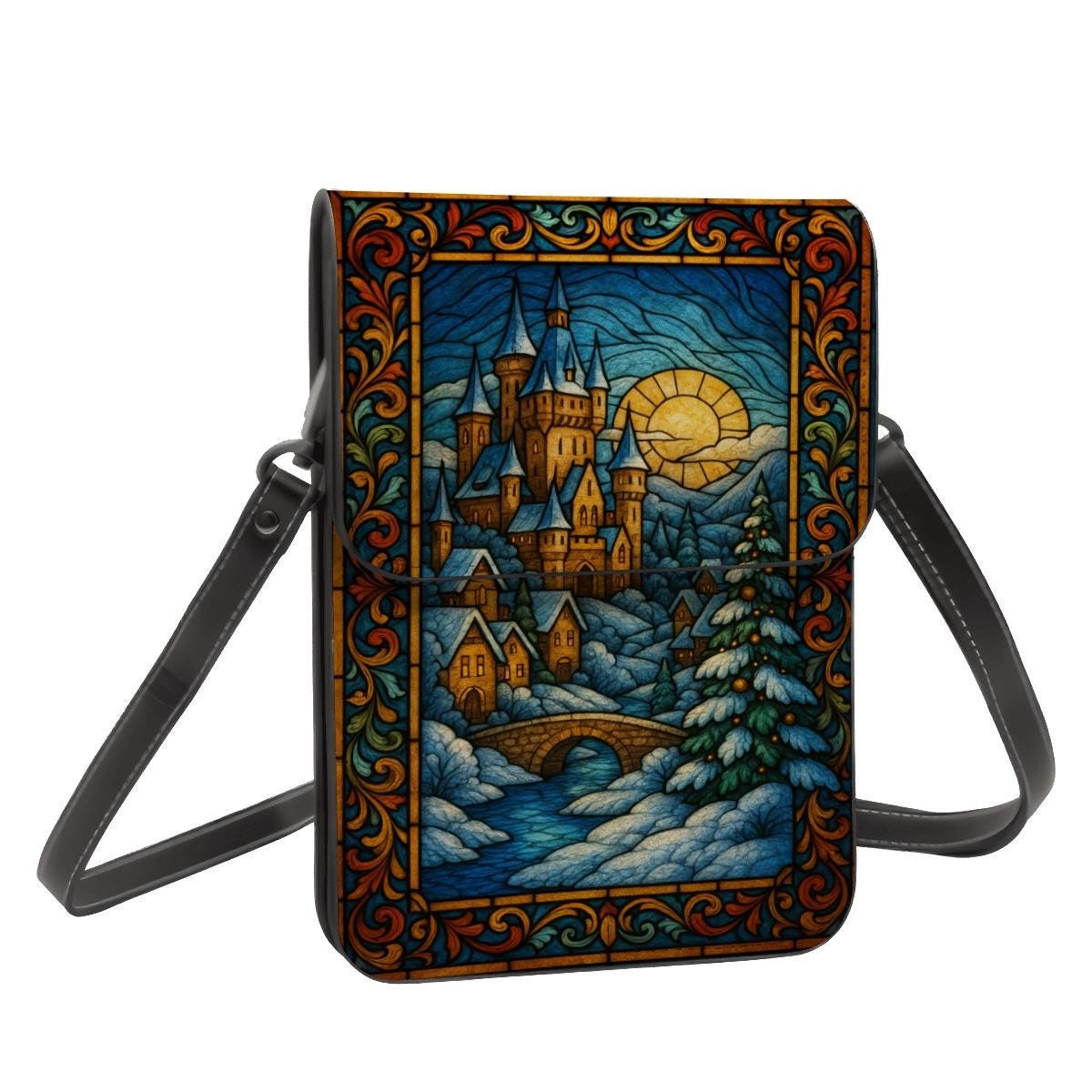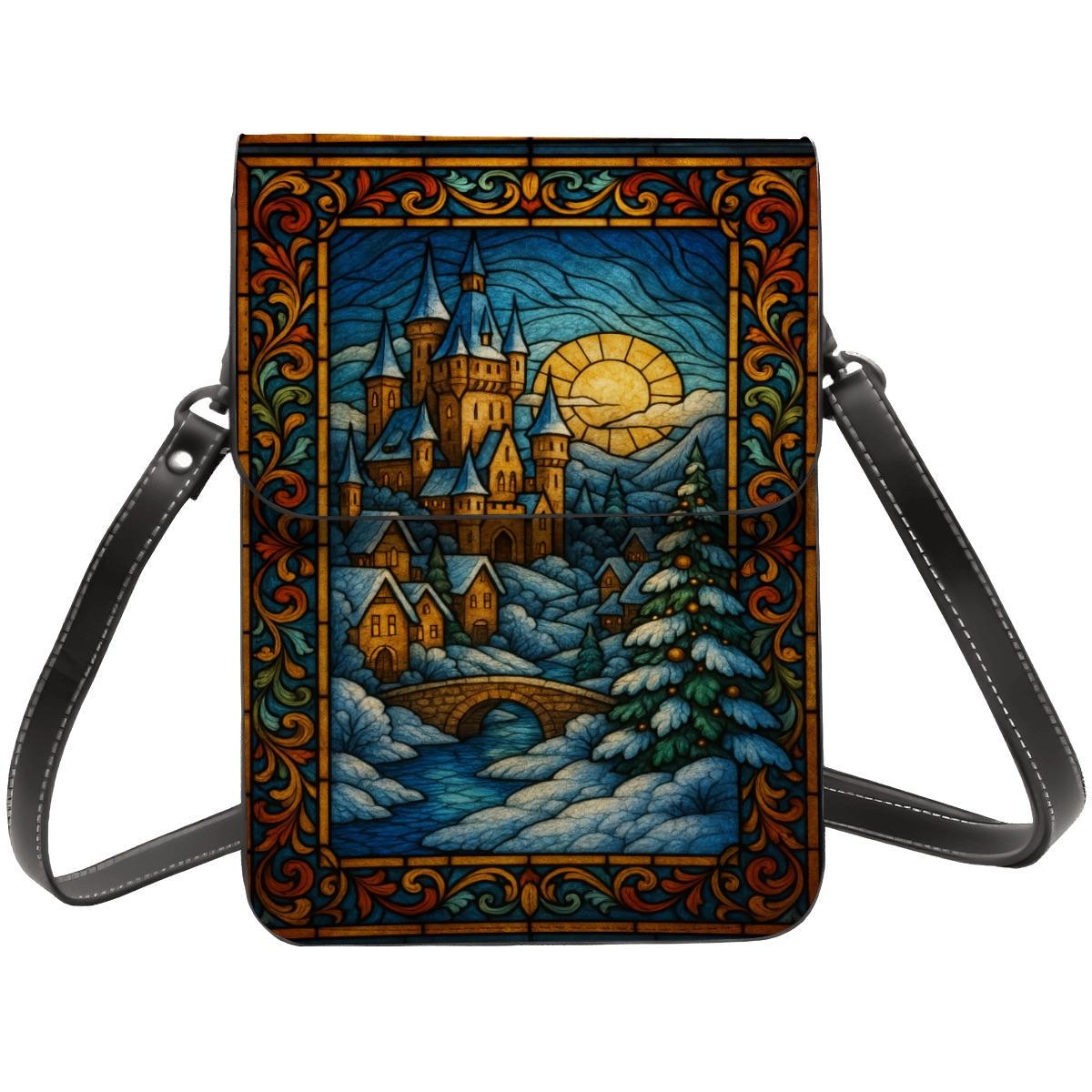 This gorgeous crossbody phone purse features a stained glass style winter castle scene — glowing golden windows, moonlit sky, snowy village, evergreen trees, and ornate border details. A magical fairytale look that stands out beautifully.