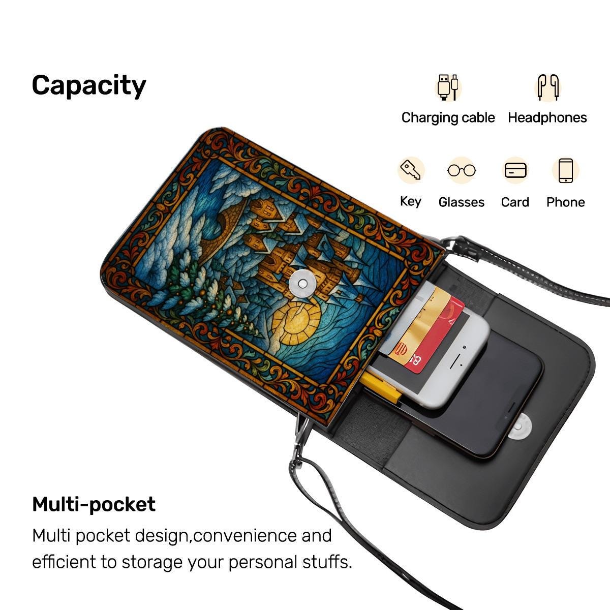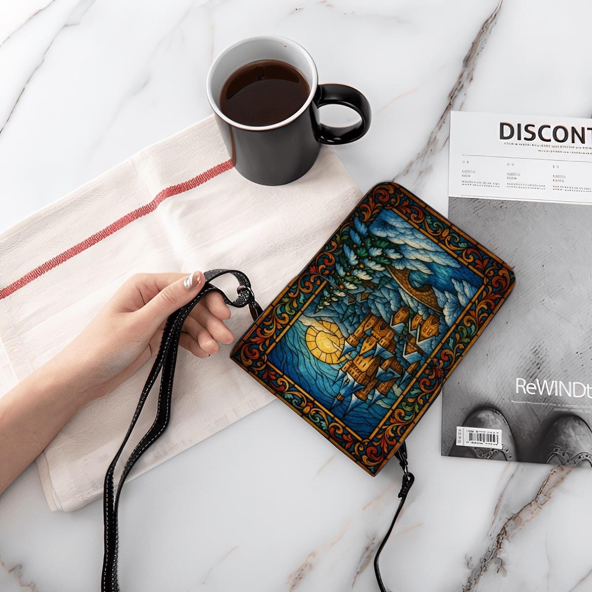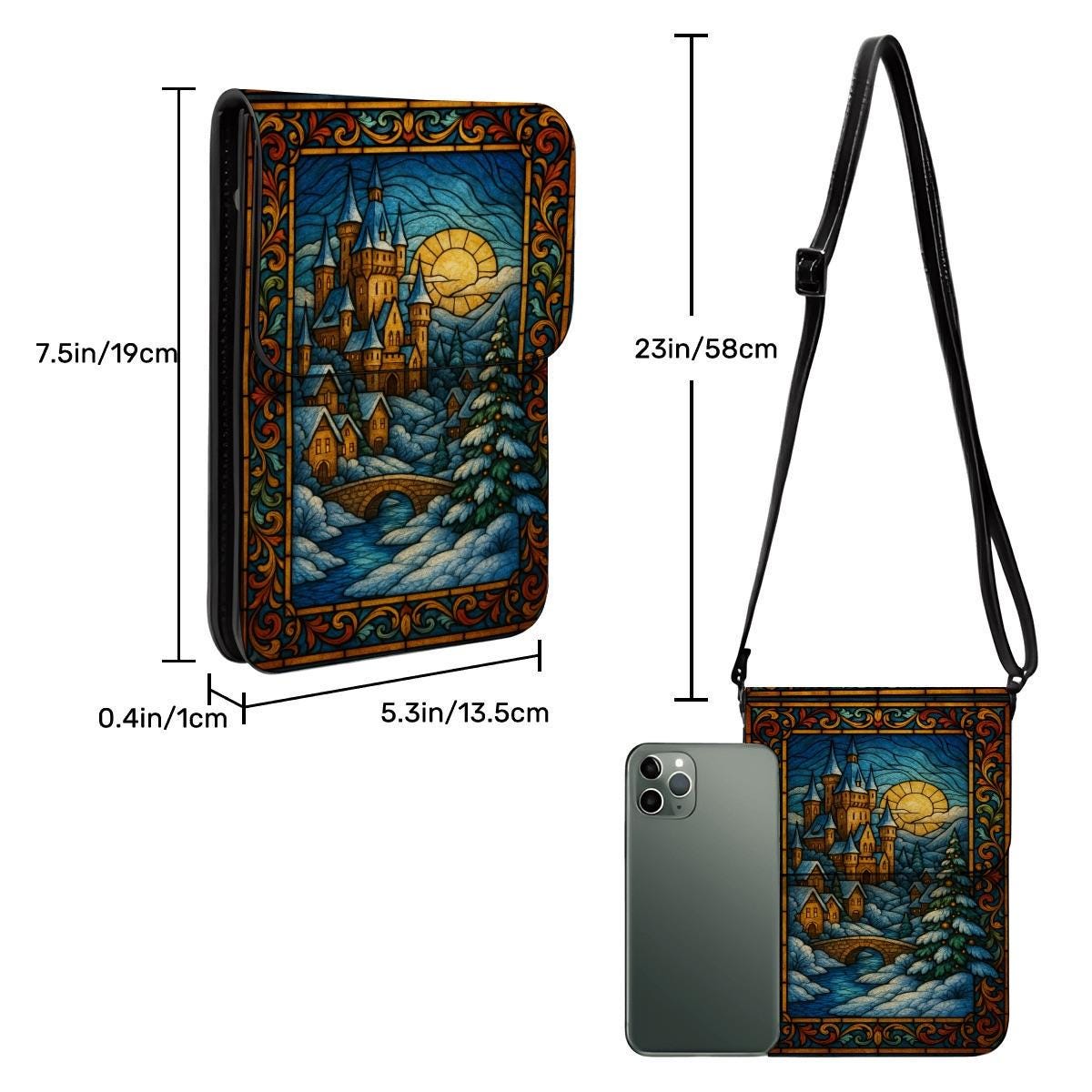 This gorgeous crossbody phone purse features a stained glass style winter castle scene — glowing golden windows, moonlit sky, snowy village, evergreen trees, and ornate border details. A magical fairytale look that stands out beautifully.