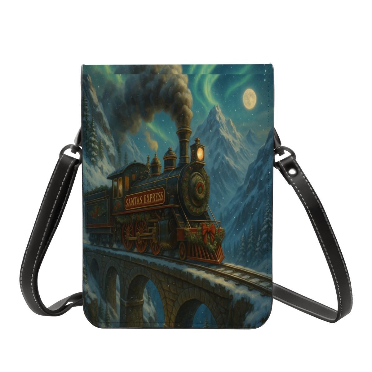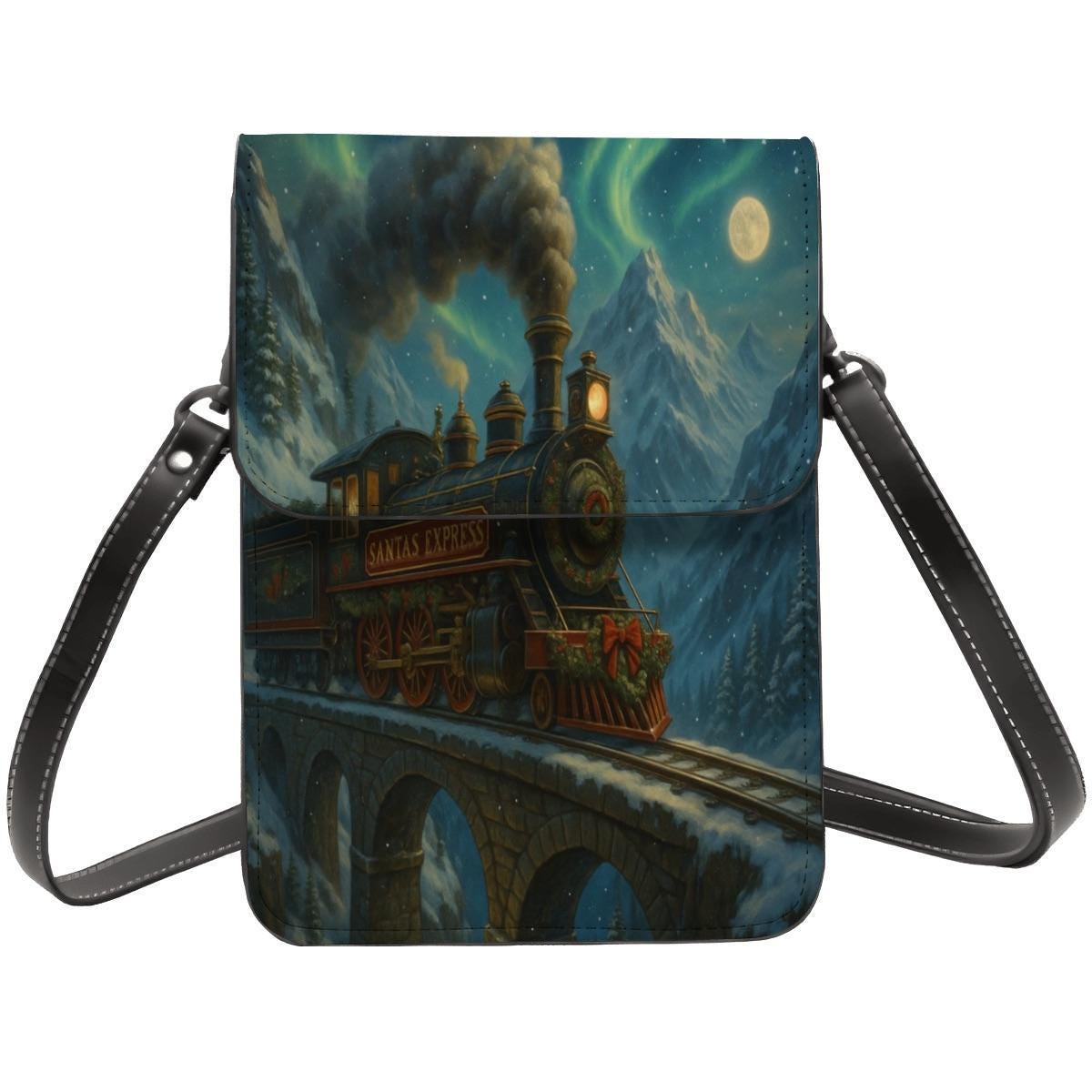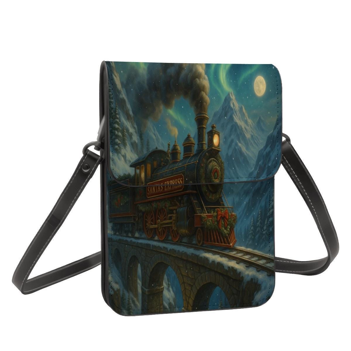 Step into holiday magic with this enchanting Santa Express train crossbody phone purse. The artwork features a steam engine traveling across a moonlit bridge, surrounded by snowy mountains and twinkling night sky — a dreamy winter fairytale scene.