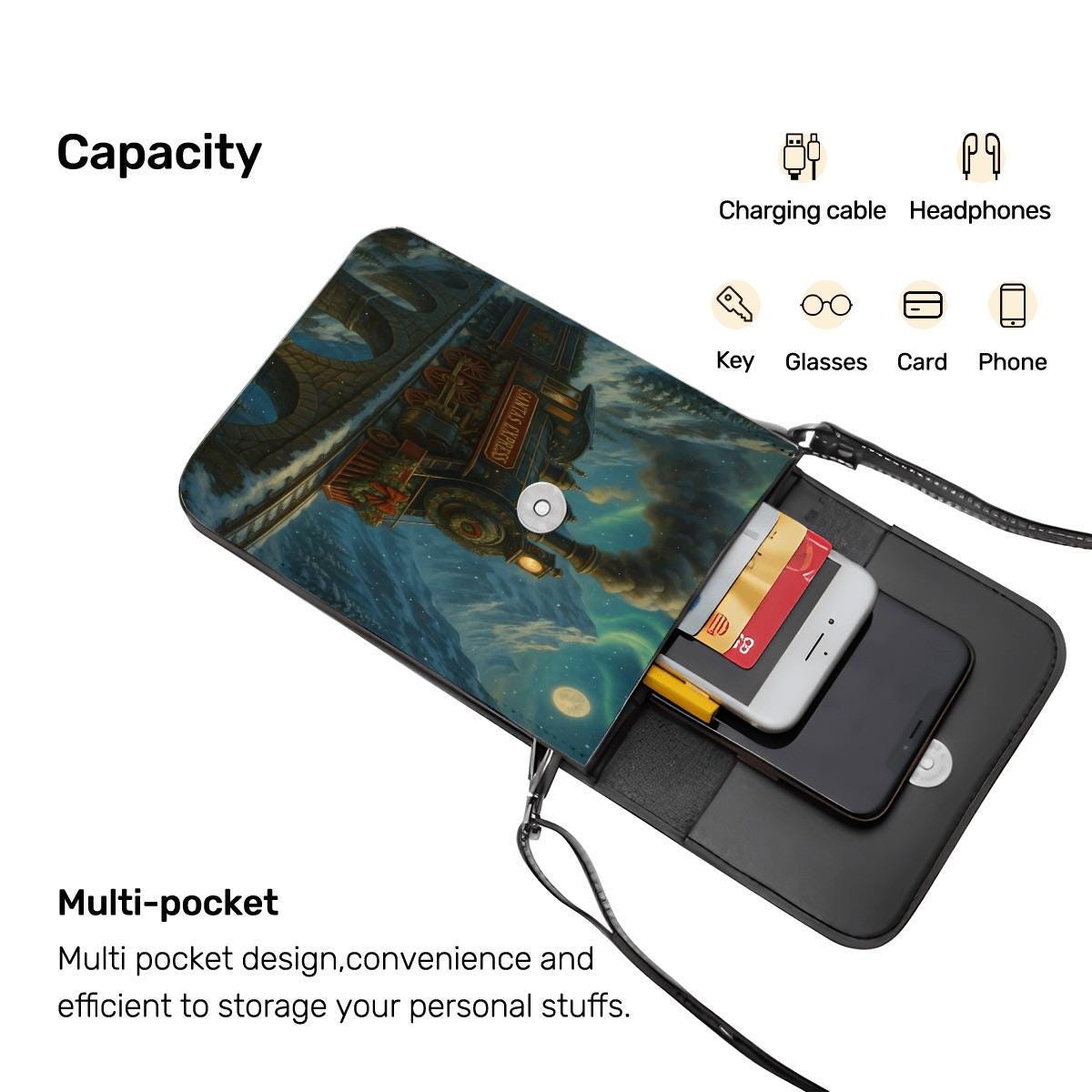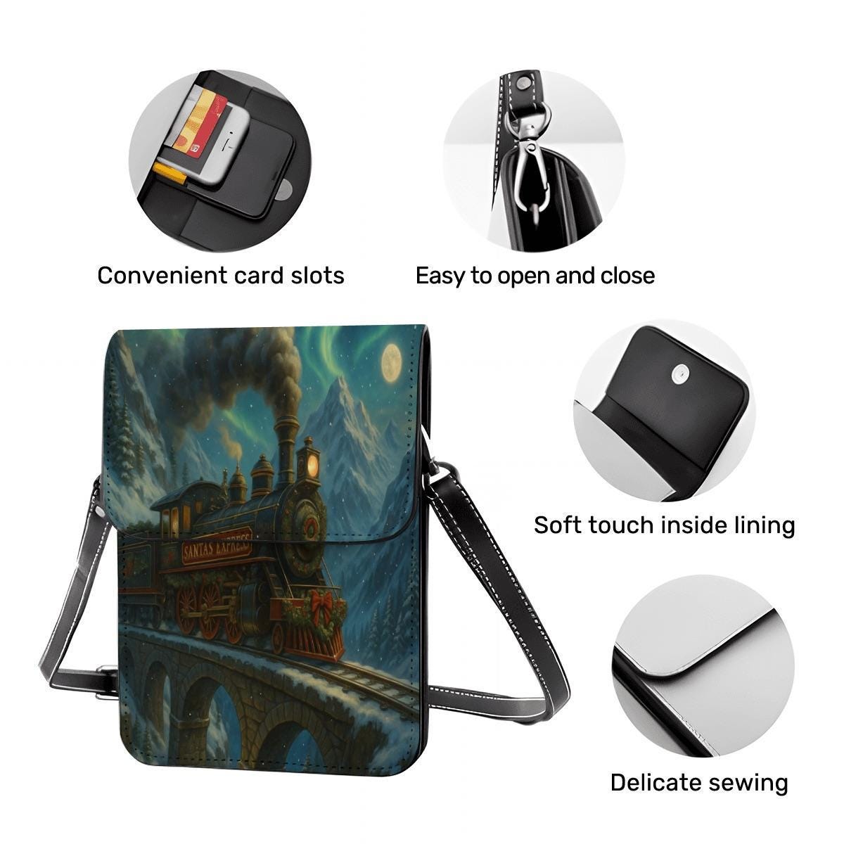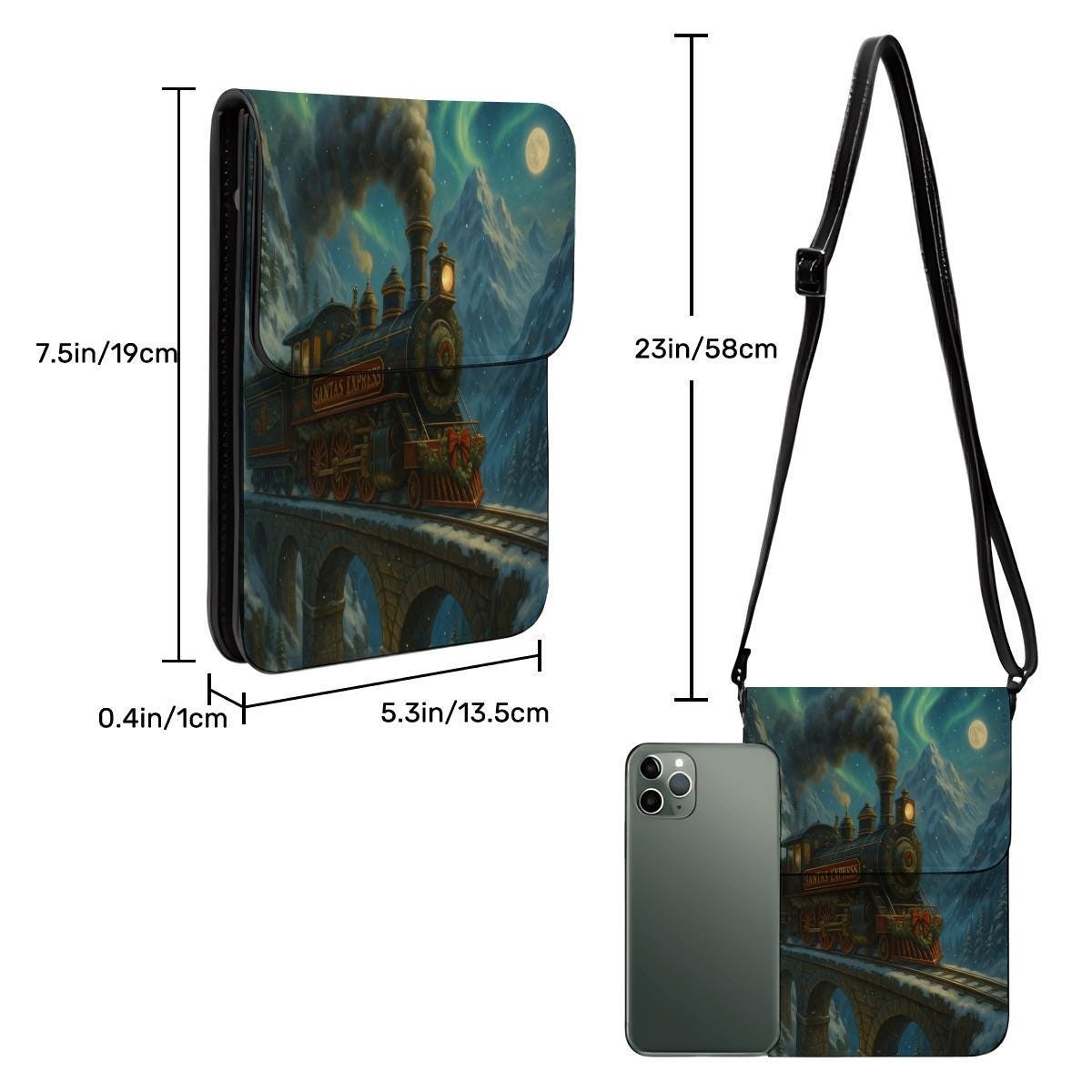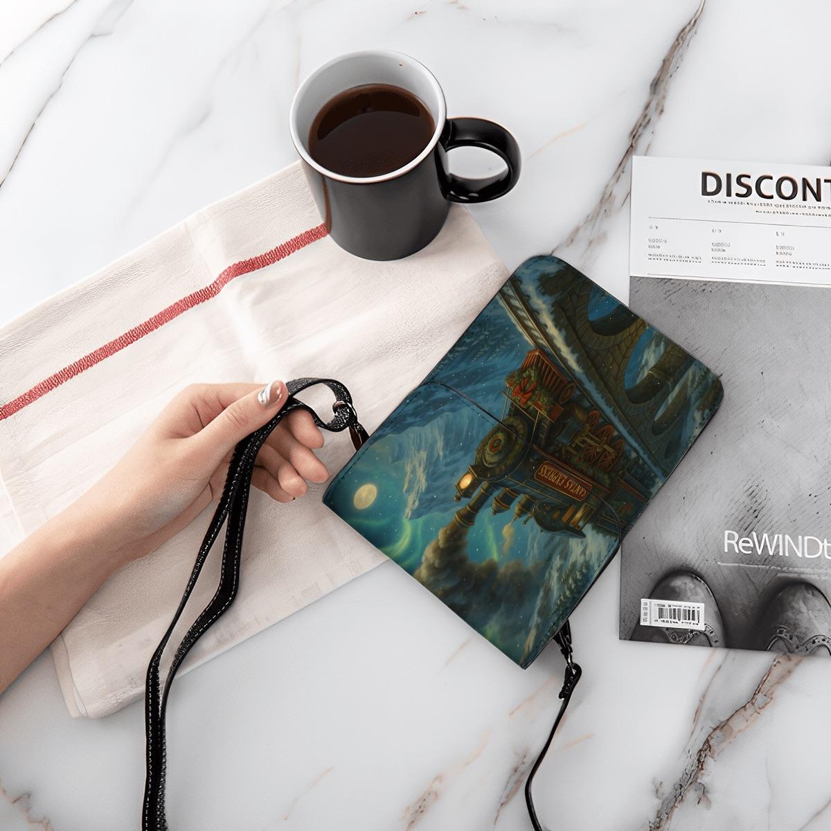 Step into holiday magic with this enchanting Santa Express train crossbody phone purse. The artwork features a steam engine traveling across a moonlit bridge, surrounded by snowy mountains and twinkling night sky — a dreamy winter fairytale scene.