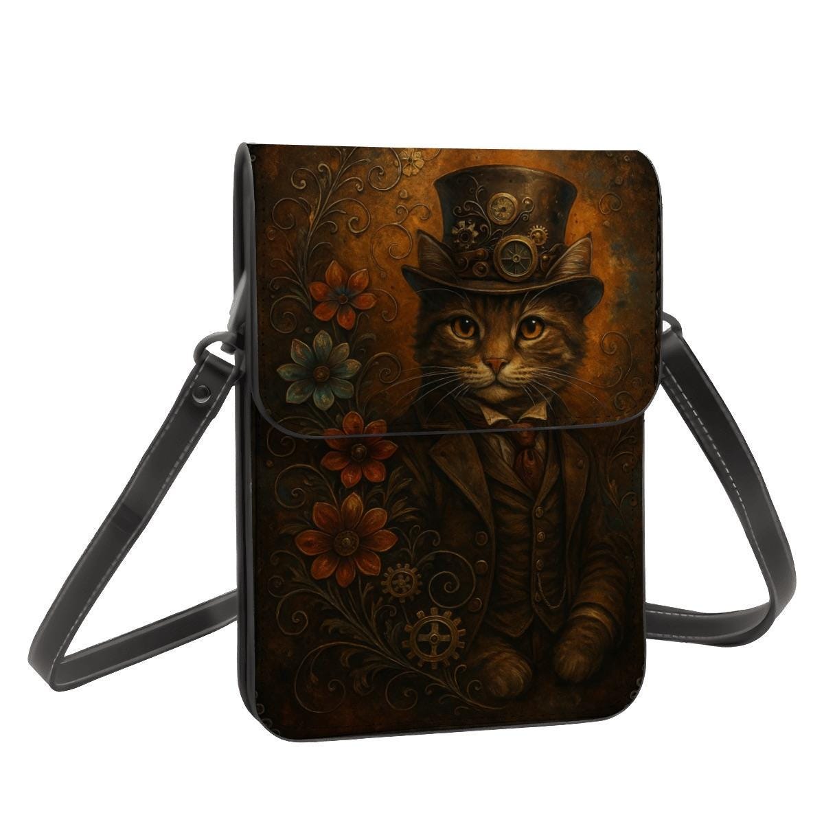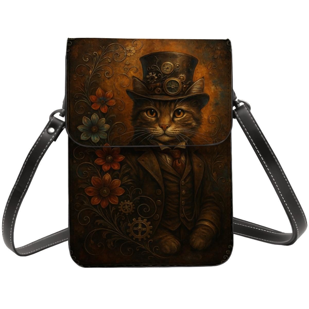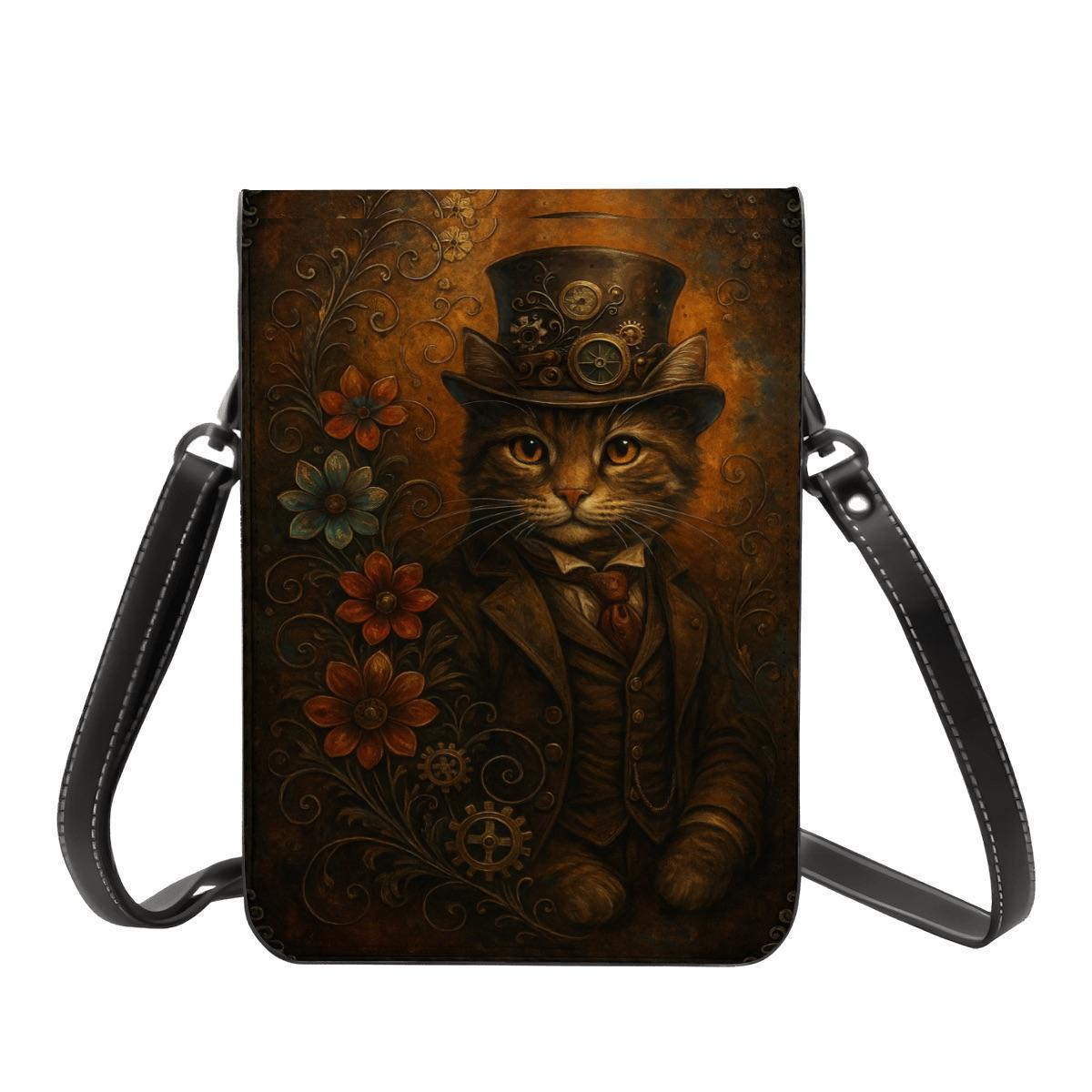 Carry a touch of whimsical elegance with this steampunk cat with top hat crossbody phone purse. The artwork features a refined cat dressed in Victorian attire, surrounded by ornate floral patterns and clockwork gears — an enchanting accessory for anyone who loves cats, art, or fantasy style.