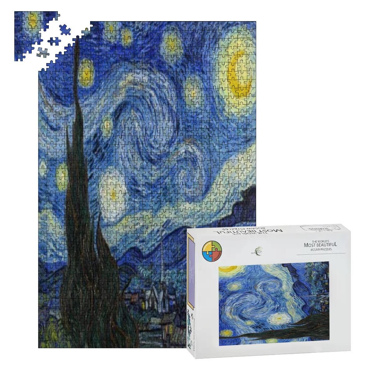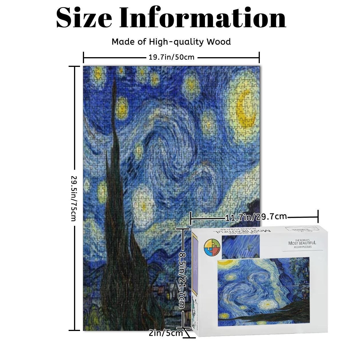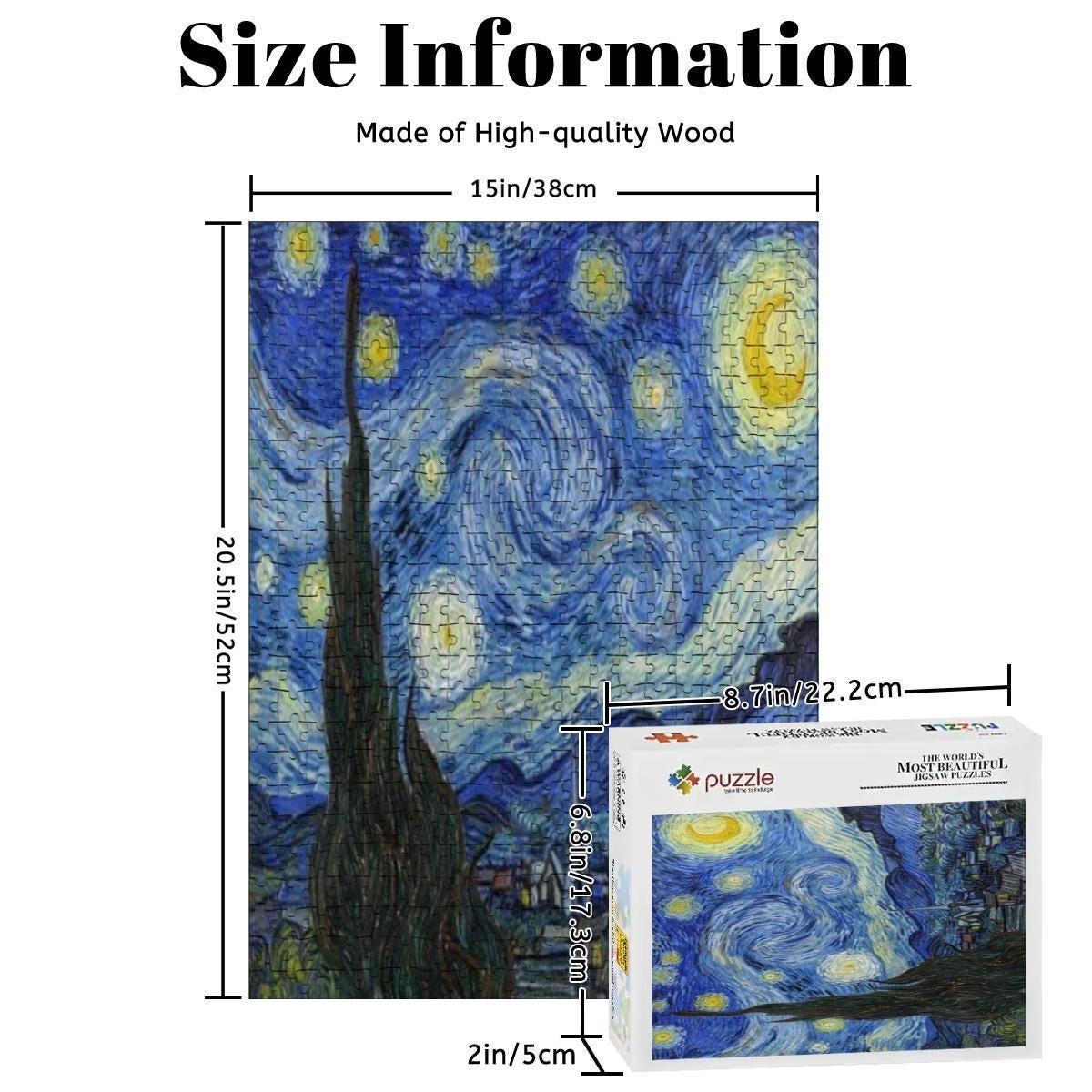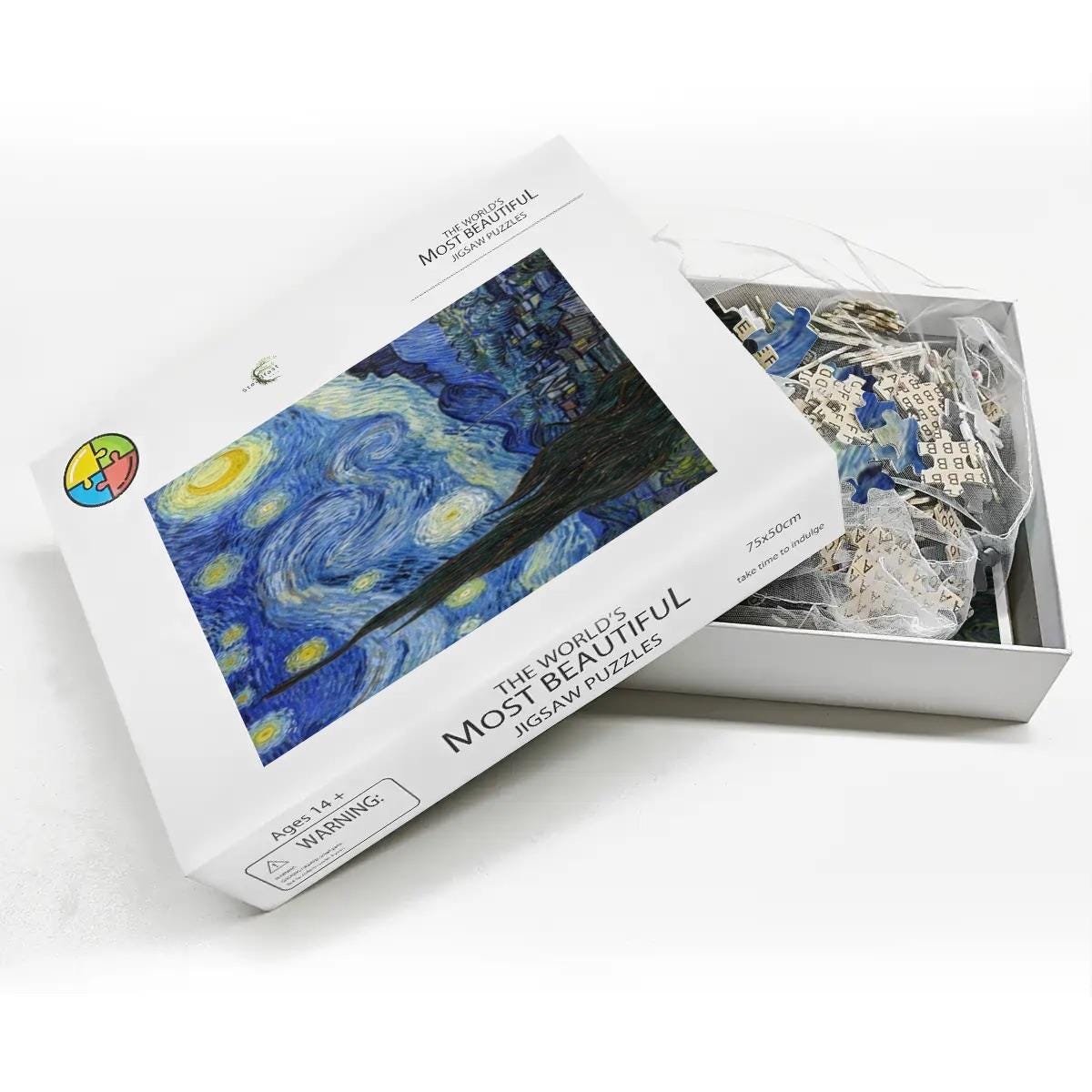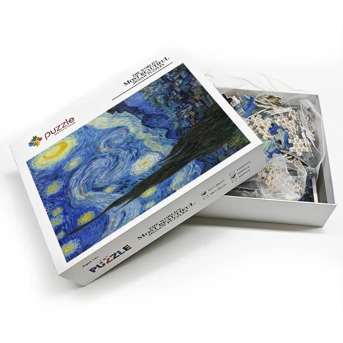 Experience the magic of Van Gogh’s Starry Night with this beautifully crafted oak-wood jigsaw puzzle, available in 500 pieces or 1000 pieces. Designed for puzzle lovers, art fans, and anyone who appreciates high-quality craftsmanship, this piece is both a relaxing activity and a stunning work of art when finished.