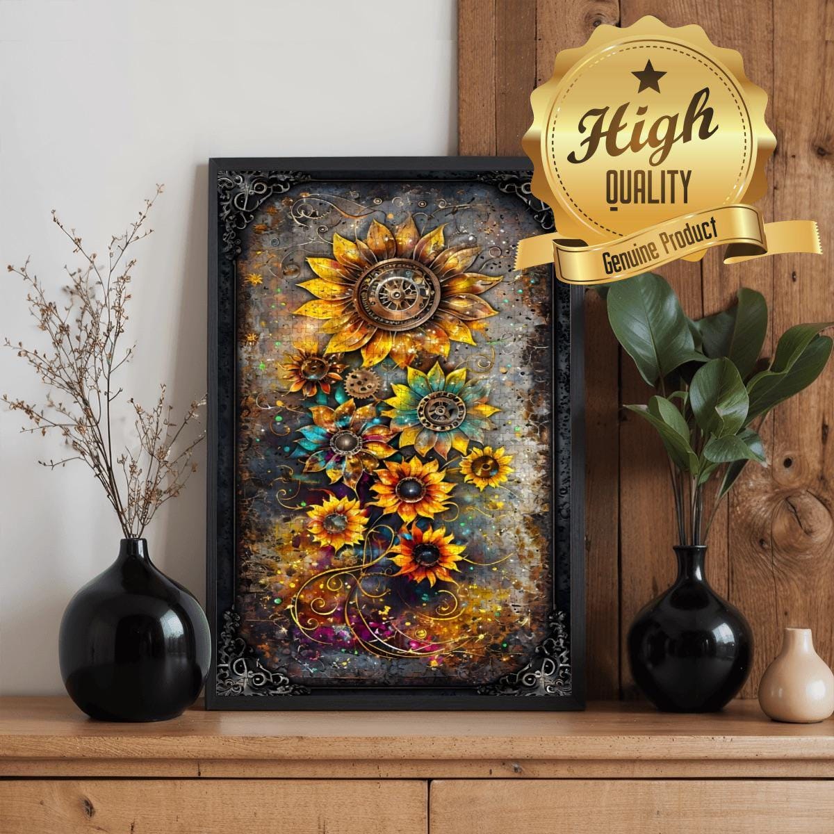 Bring bold color and vintage charm to your puzzle table with this Steampunk Sunflower Wooden Jigsaw Puzzle, available in 500 pieces or 1000 pieces. Featuring vibrant sunflowers, gears, antique clockwork touches, and rich textured background art, this premium oak-wood puzzle is perfect for gifting, relaxing, and framing as art after completion.