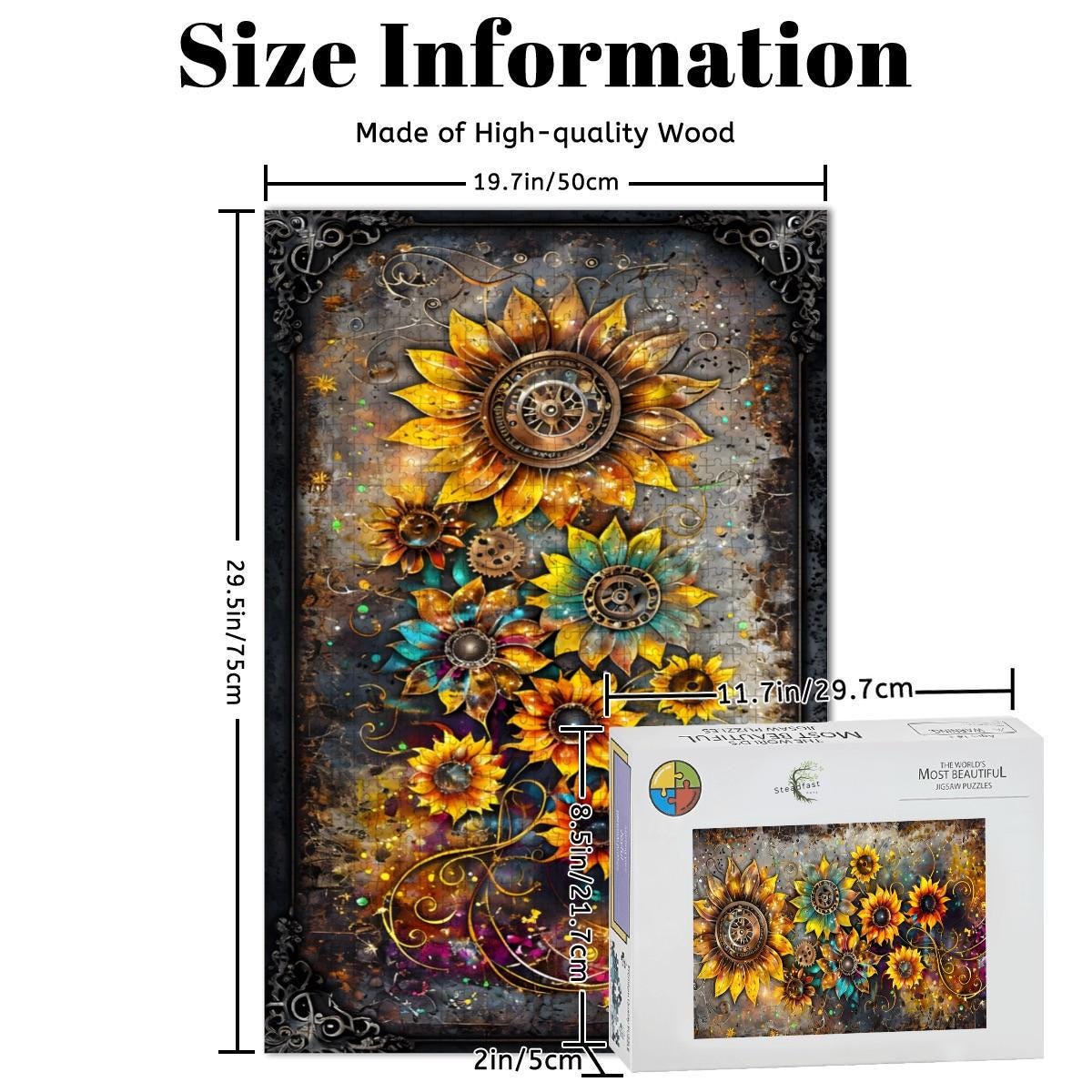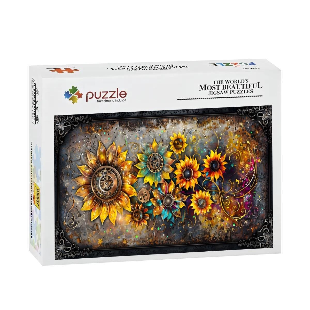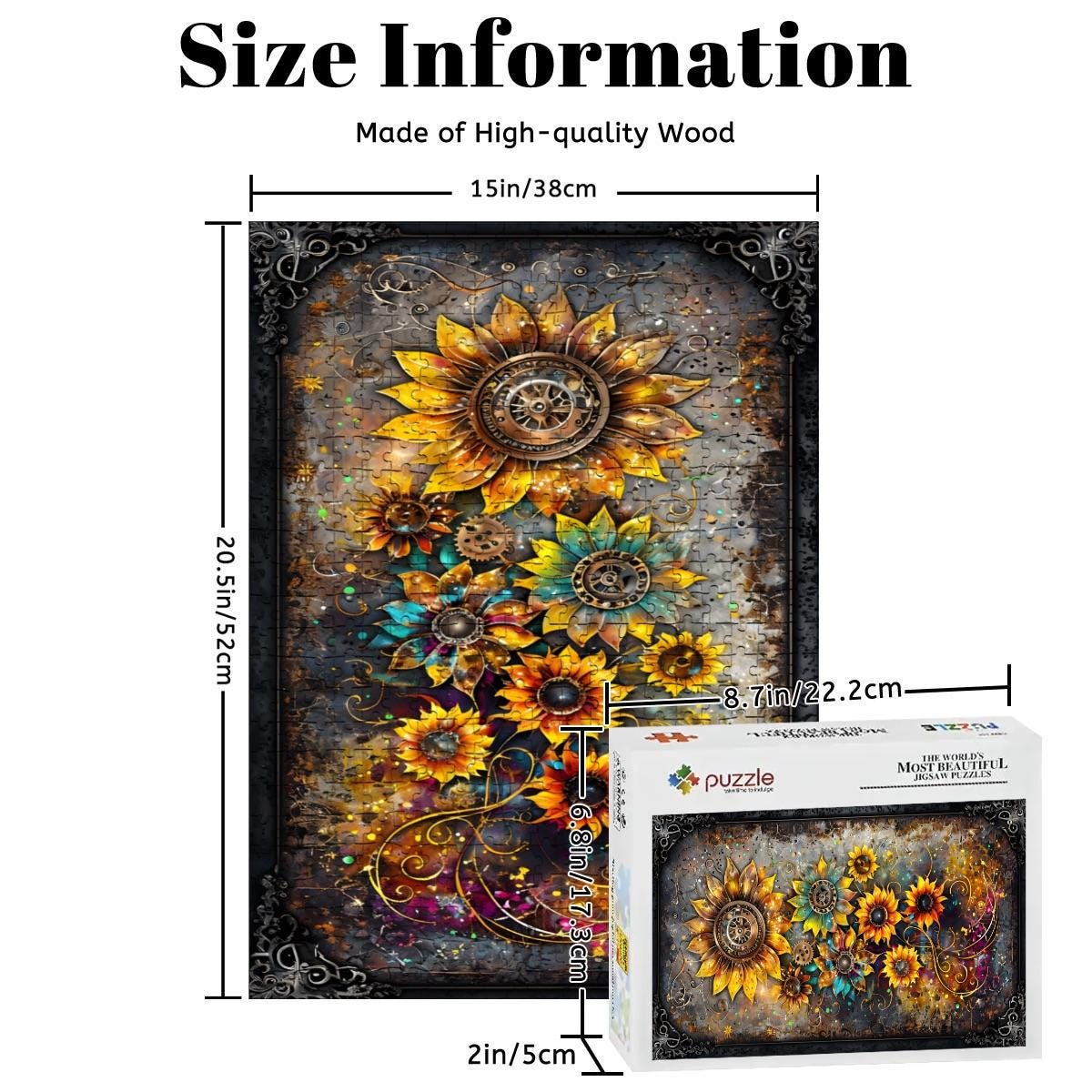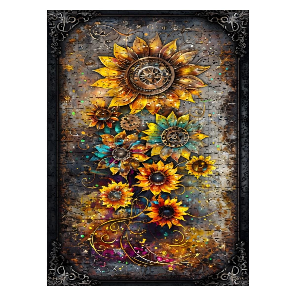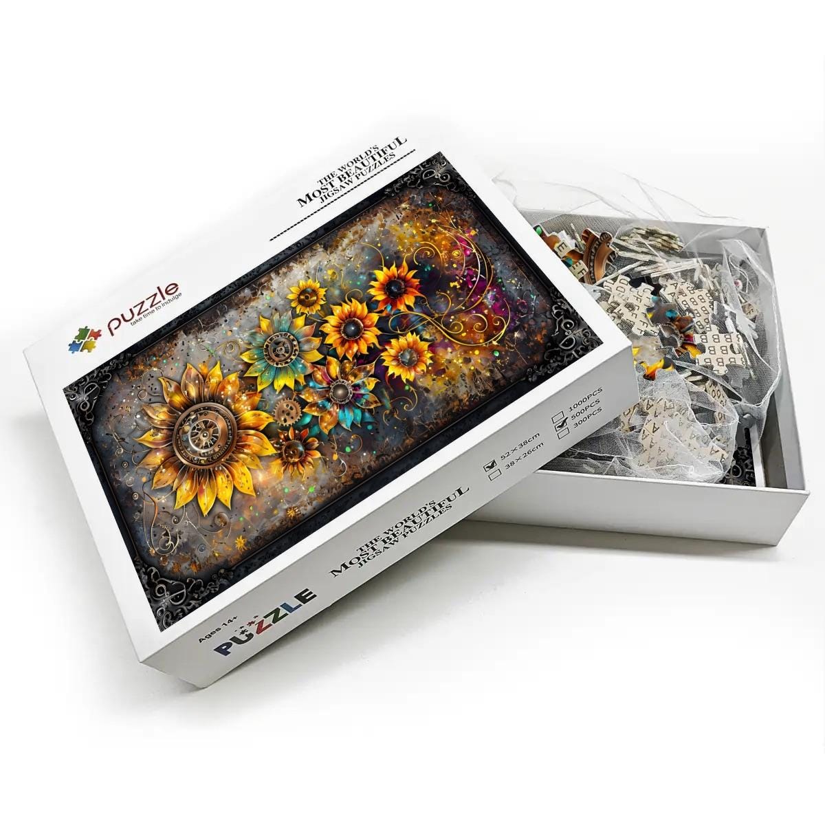 Bring bold color and vintage charm to your puzzle table with this Steampunk Sunflower Wooden Jigsaw Puzzle, available in 500 pieces or 1000 pieces. Featuring vibrant sunflowers, gears, antique clockwork touches, and rich textured background art, this premium oak-wood puzzle is perfect for gifting, relaxing, and framing as art after completion.