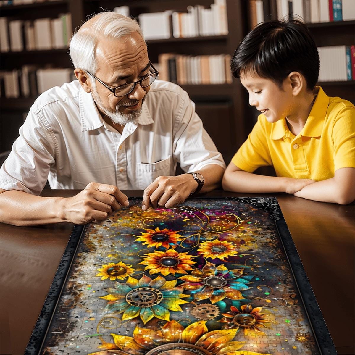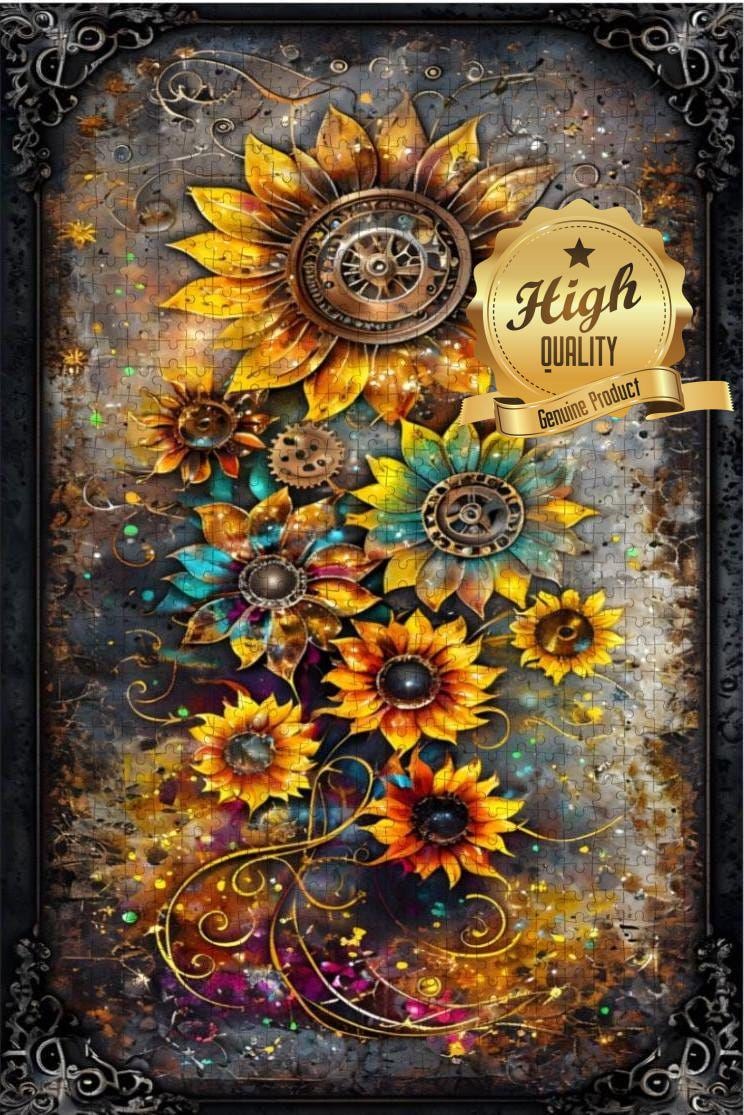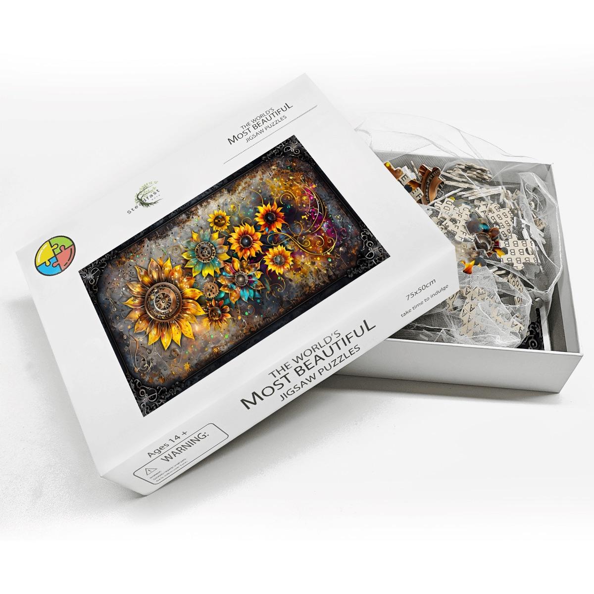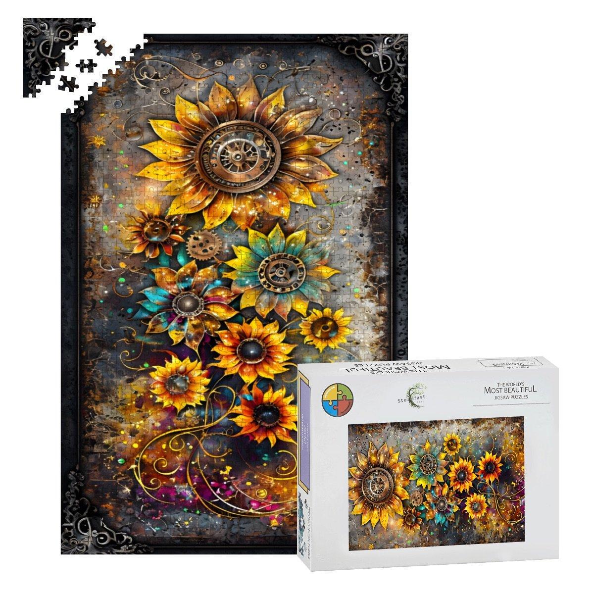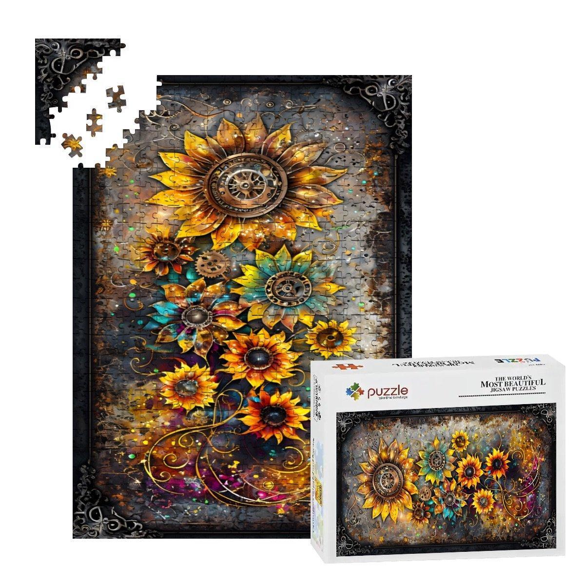 Bring bold color and vintage charm to your puzzle table with this Steampunk Sunflower Wooden Jigsaw Puzzle, available in 500 pieces or 1000 pieces. Featuring vibrant sunflowers, gears, antique clockwork touches, and rich textured background art, this premium oak-wood puzzle is perfect for gifting, relaxing, and framing as art after completion.