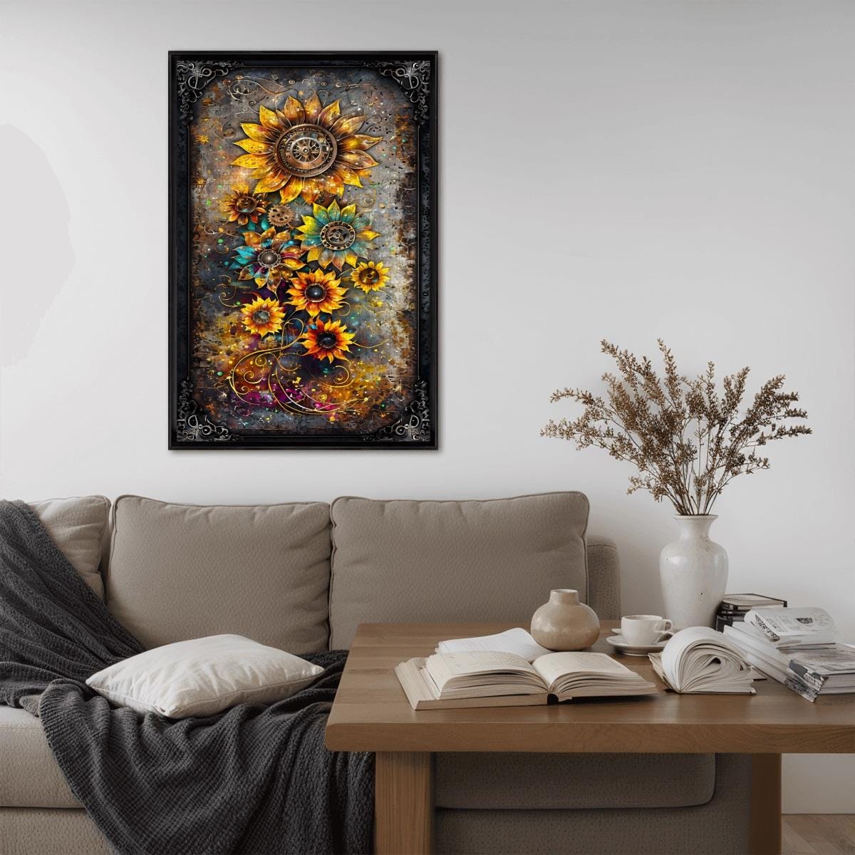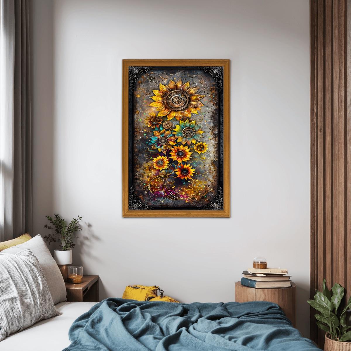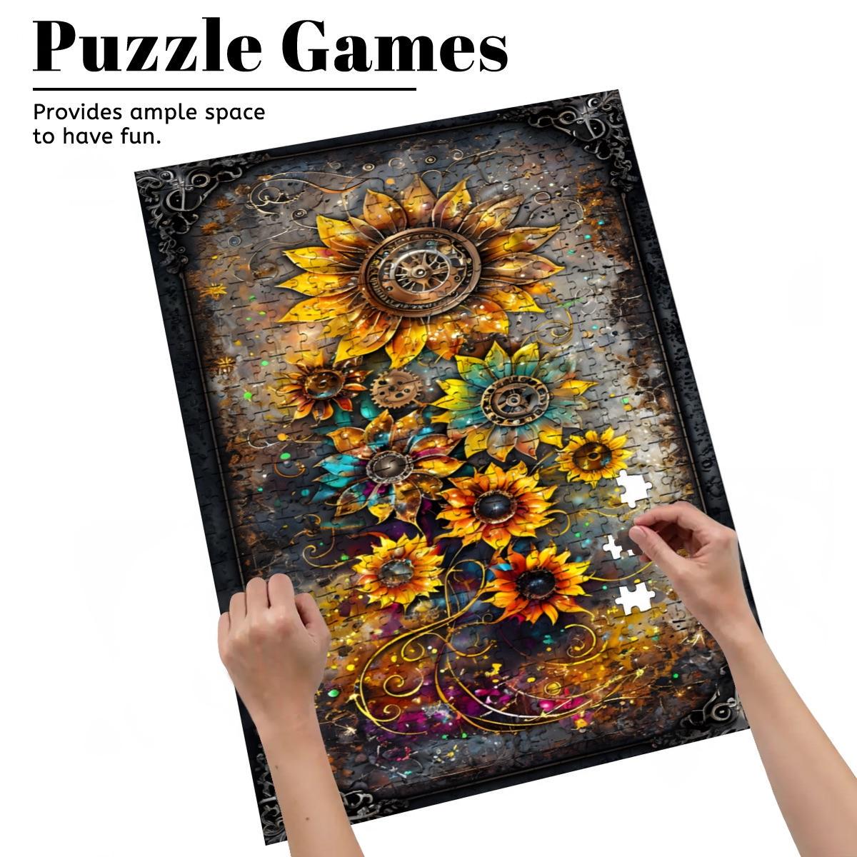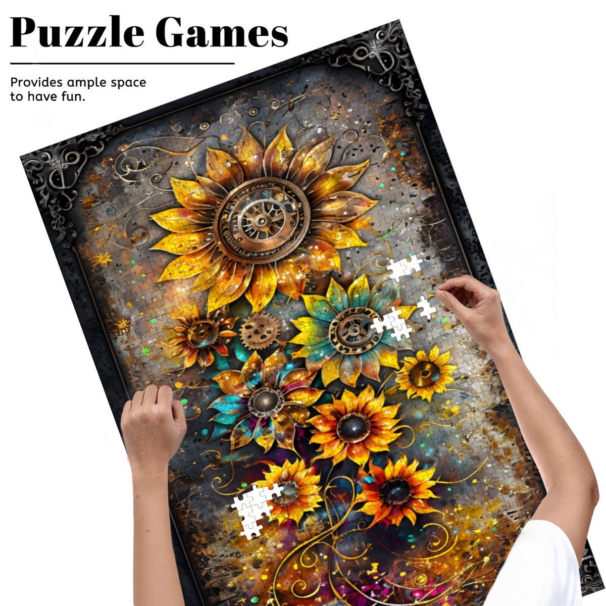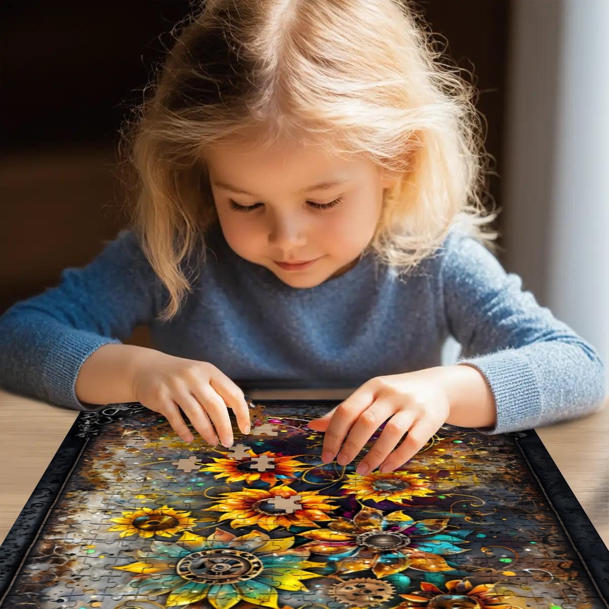 Bring bold color and vintage charm to your puzzle table with this Steampunk Sunflower Wooden Jigsaw Puzzle, available in 500 pieces or 1000 pieces. Featuring vibrant sunflowers, gears, antique clockwork touches, and rich textured background art, this premium oak-wood puzzle is perfect for gifting, relaxing, and framing as art after completion.