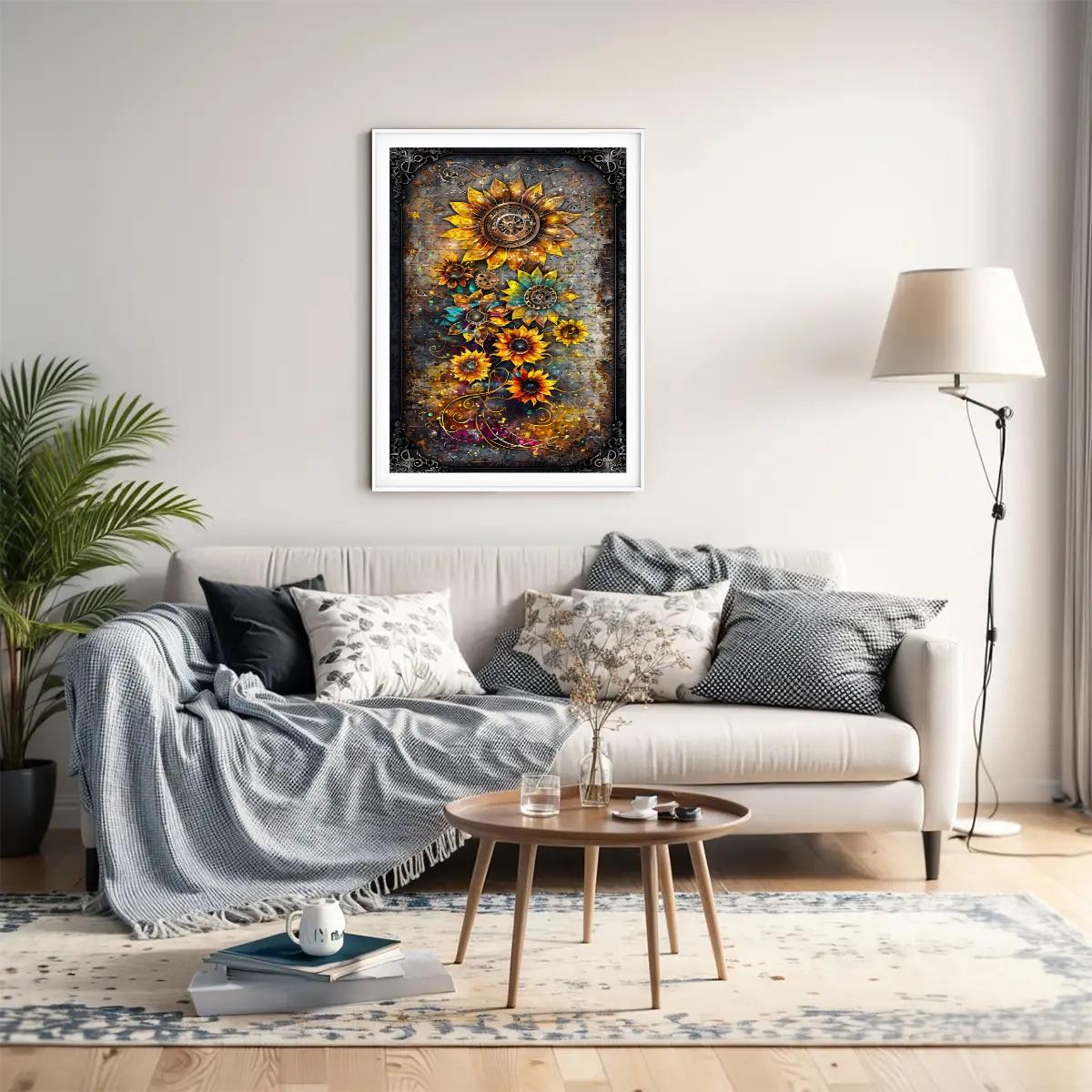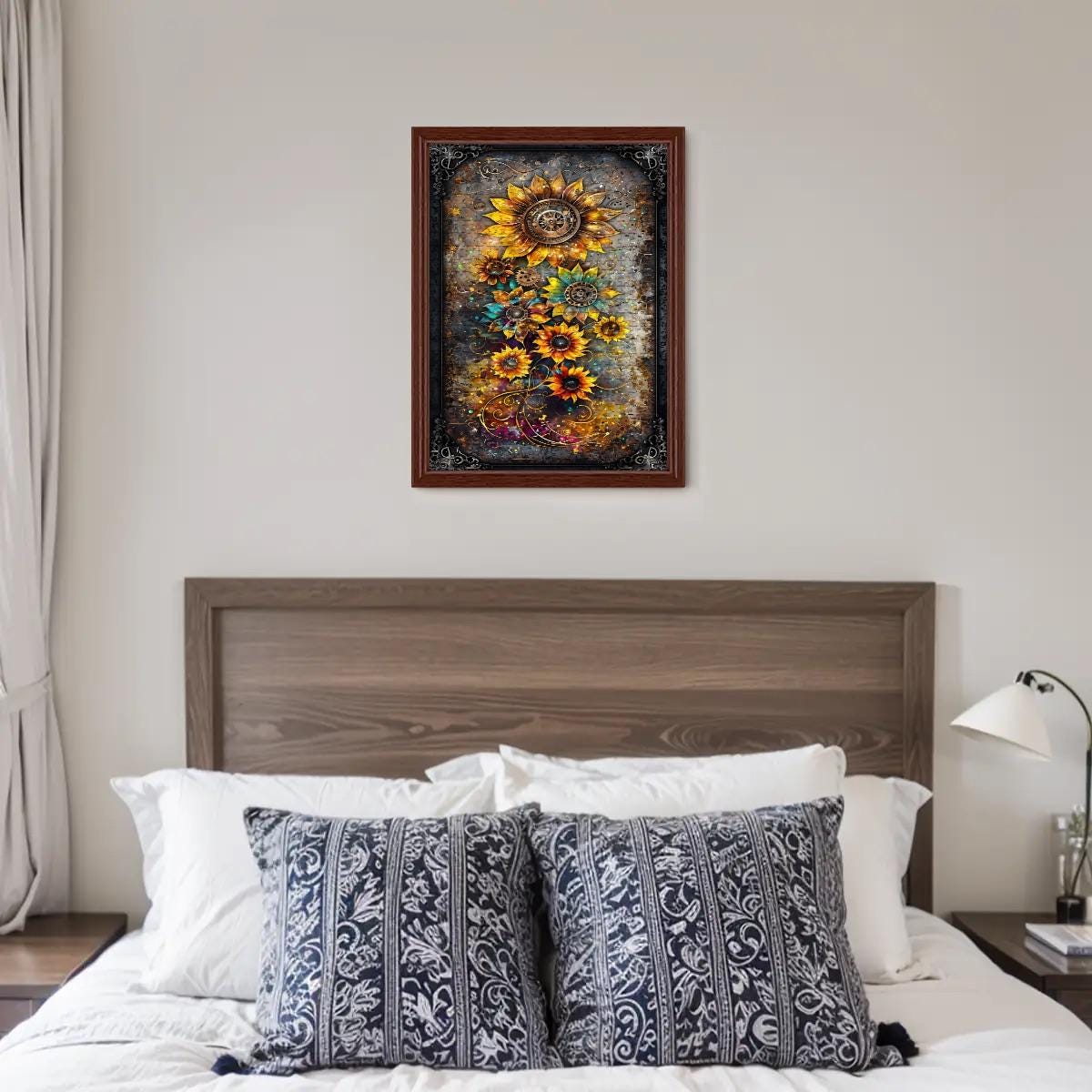 Once finished, this sunflower artwork becomes a stunning, vintage-style display piece.