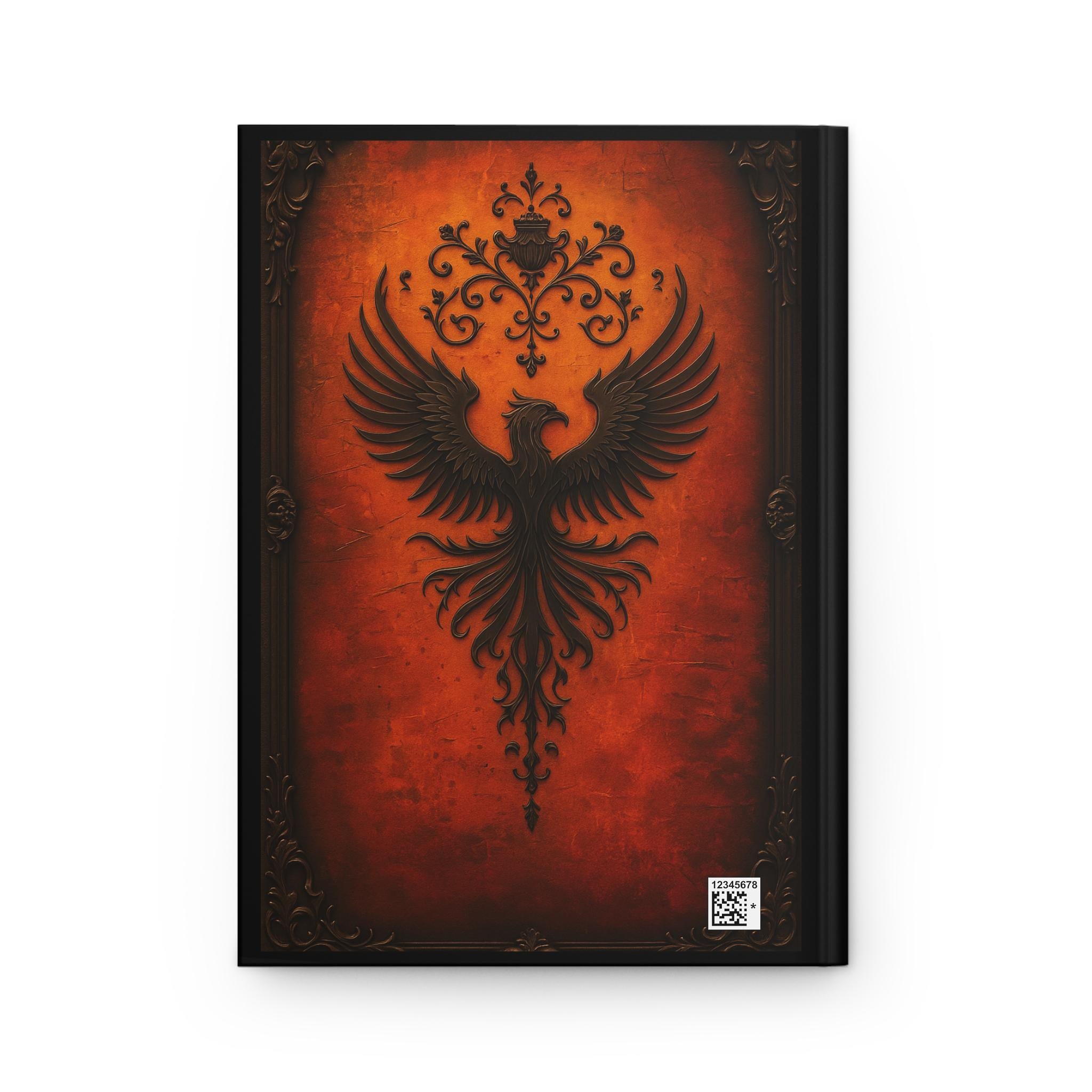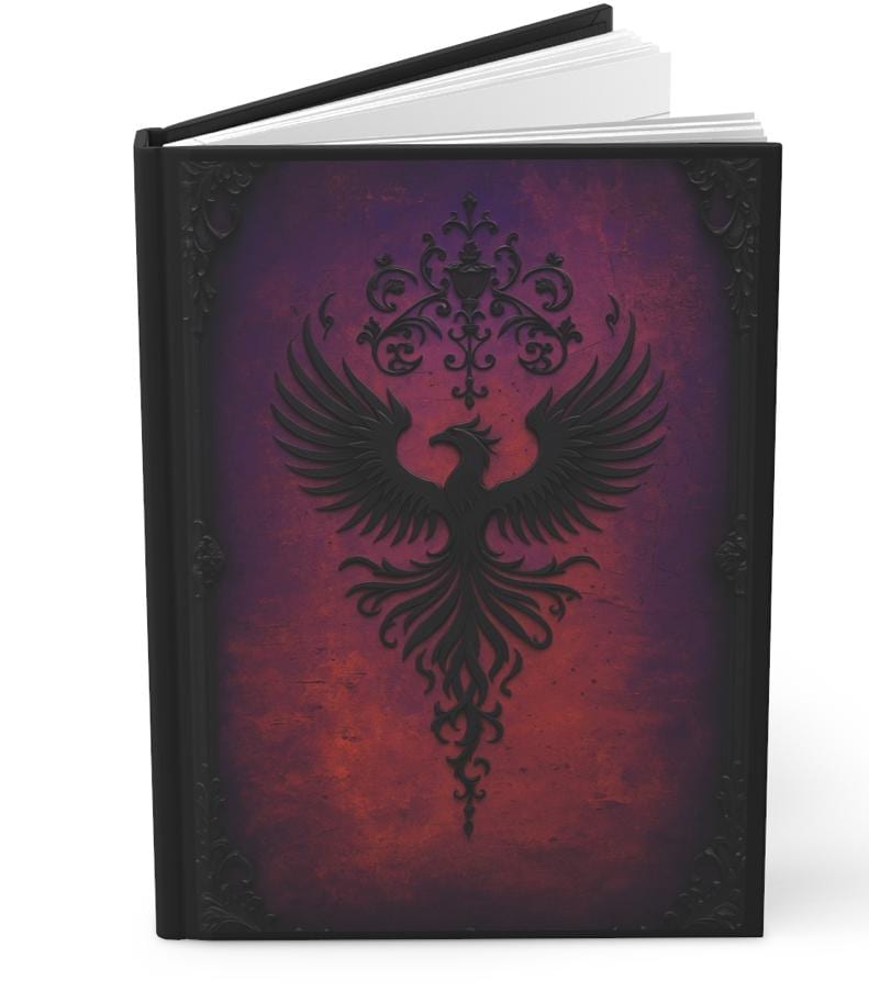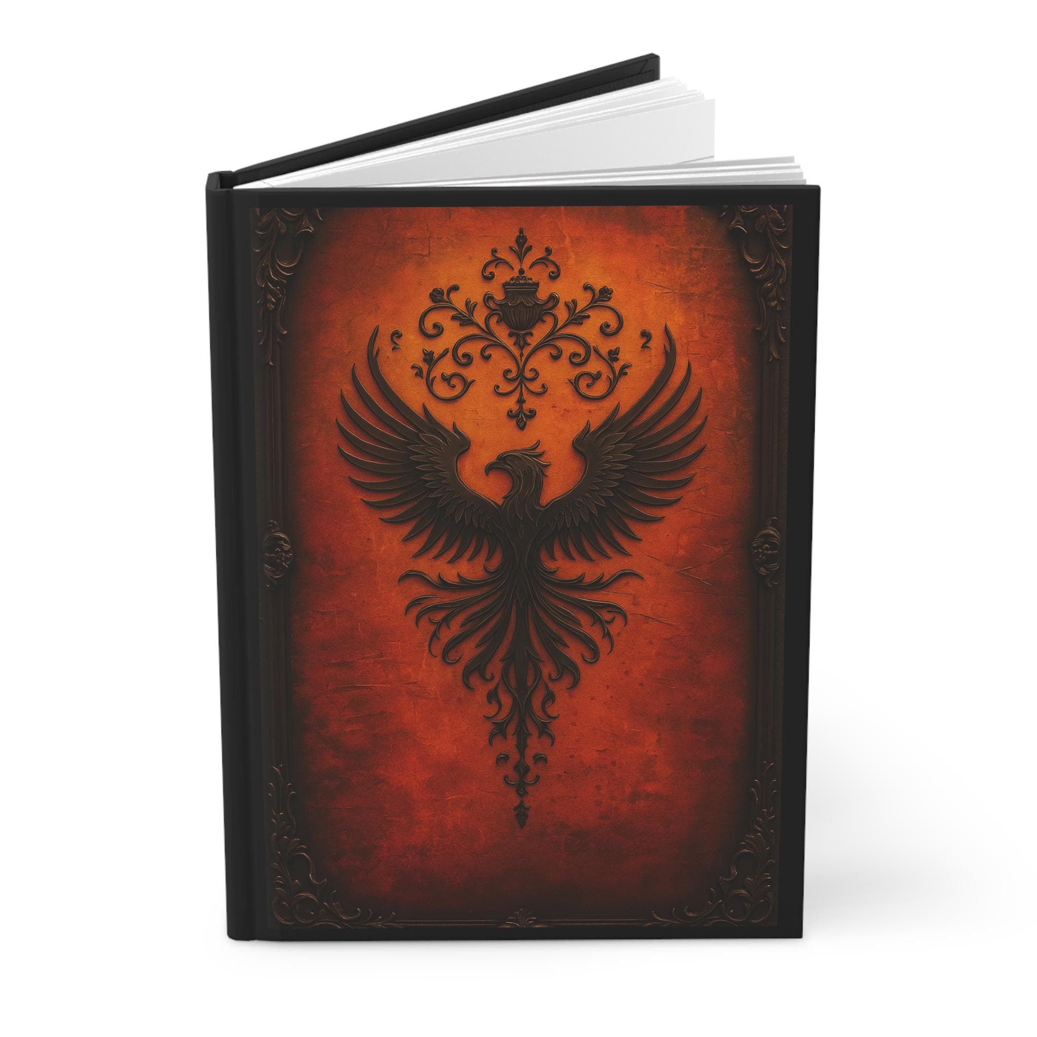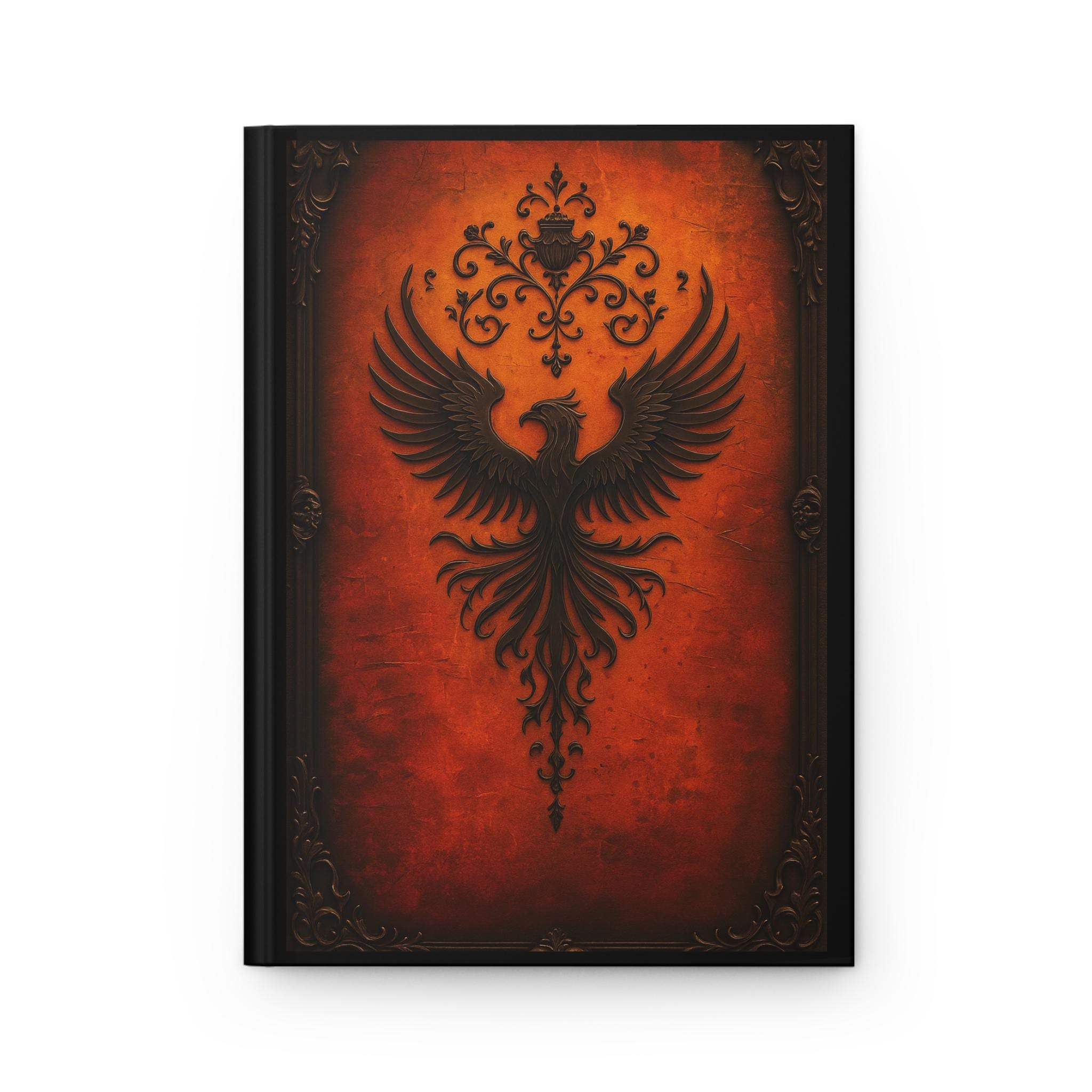 A hardcover journal with a rich, burnished cover that feels like an heirloom. The phoenix-like emblem rises against a smoldering, textured red background framed by ornamental corners — a bold companion for writing down comebacks, spells, sketches, plans, or private thoughts. The matte laminated cover offers a smooth, low-glare finish that resists wear while the sewn casewrap binding keeps the book flexible and lays flatter when you write. Inside, 150 lined pages with perforations give you room to work through ideas and tear out pages cleanly when you’re ready to share or display. The full wraparound print keeps the design continuous from front to back, so the story doesn’t stop at the spine. This journal fits into days spent sketching, planning, or reflecting — for those who like their stationery with a touch of drama and permanence.