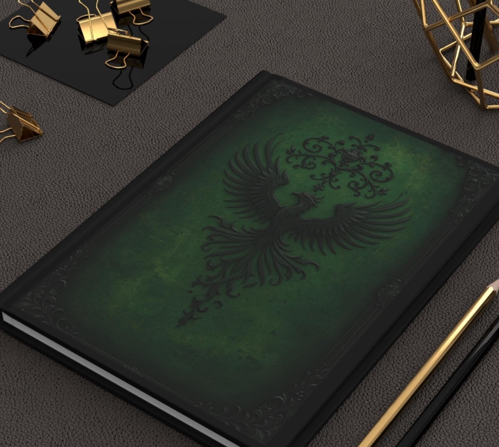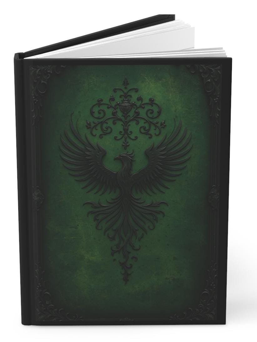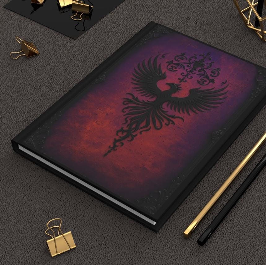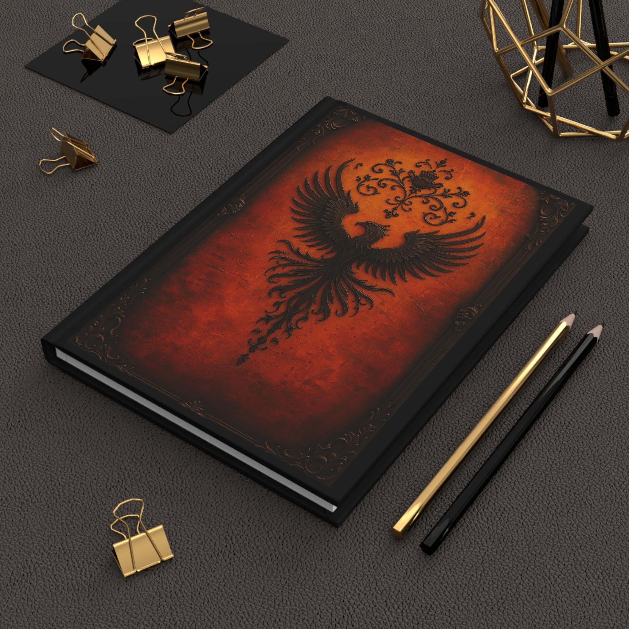A hardcover journal with a rich, burnished cover that feels like an heirloom. The phoenix-like emblem rises against a smoldering, textured red background framed by ornamental corners — a bold companion for writing down comebacks, spells, sketches, plans, or private thoughts. The matte laminated cover offers a smooth, low-glare finish that resists wear while the sewn casewrap binding keeps the book flexible and lays flatter when you write. Inside, 150 lined pages with perforations give you room to work through ideas and tear out pages cleanly when you’re ready to share or display. The full wraparound print keeps the design continuous from front to back, so the story doesn’t stop at the spine. This journal fits into days spent sketching, planning, or reflecting — for those who like their stationery with a touch of drama and permanence.