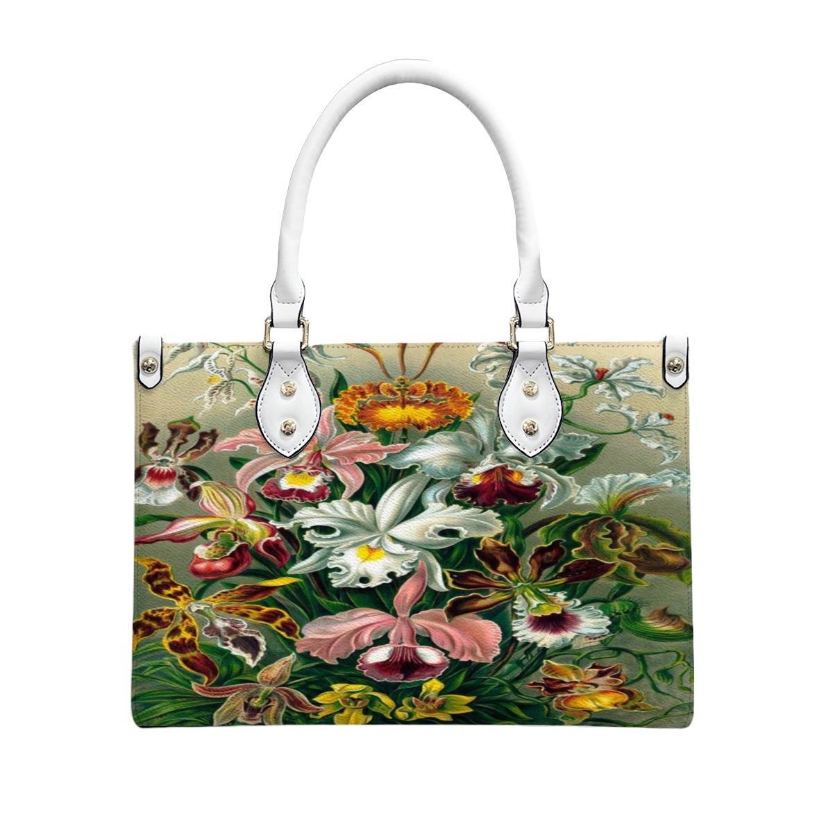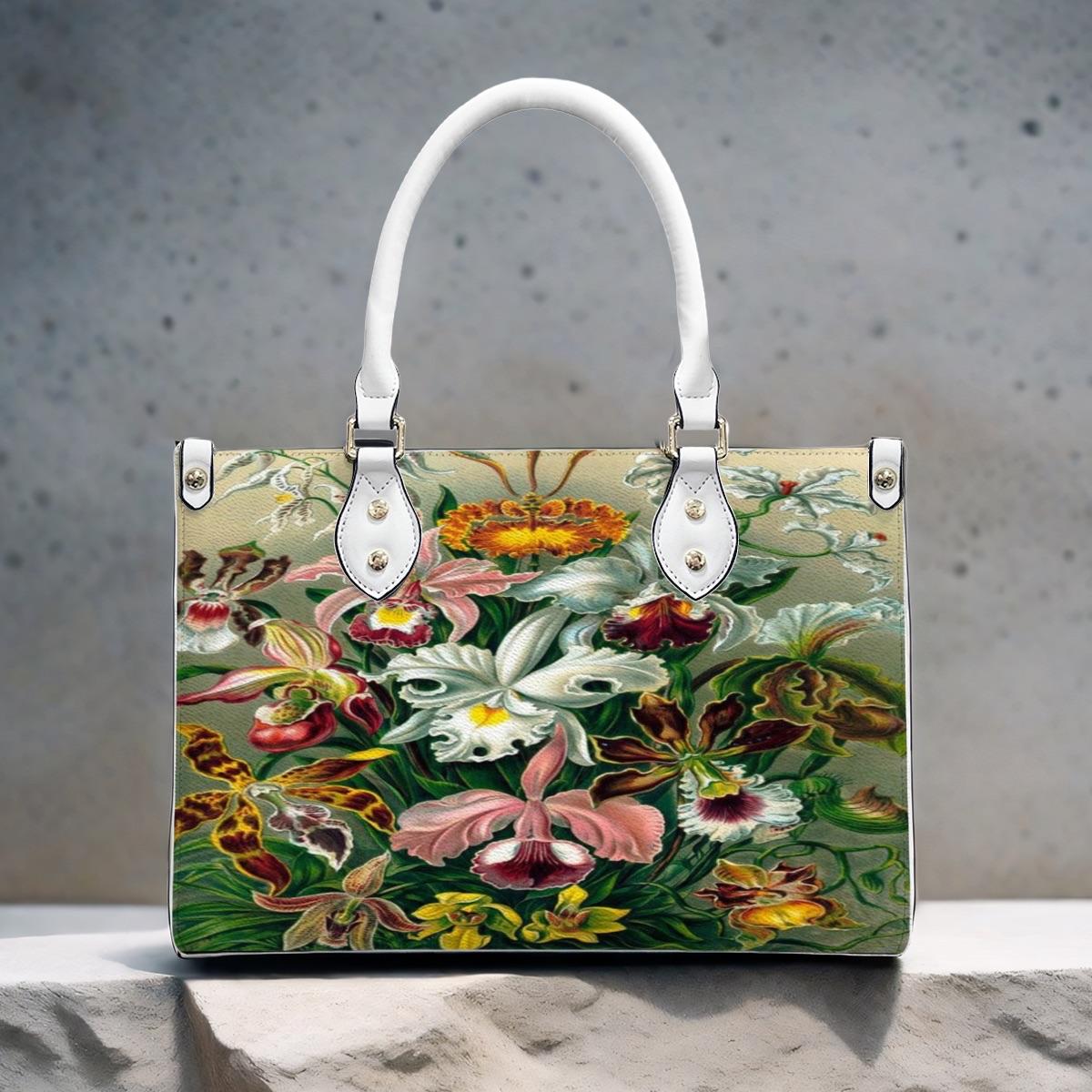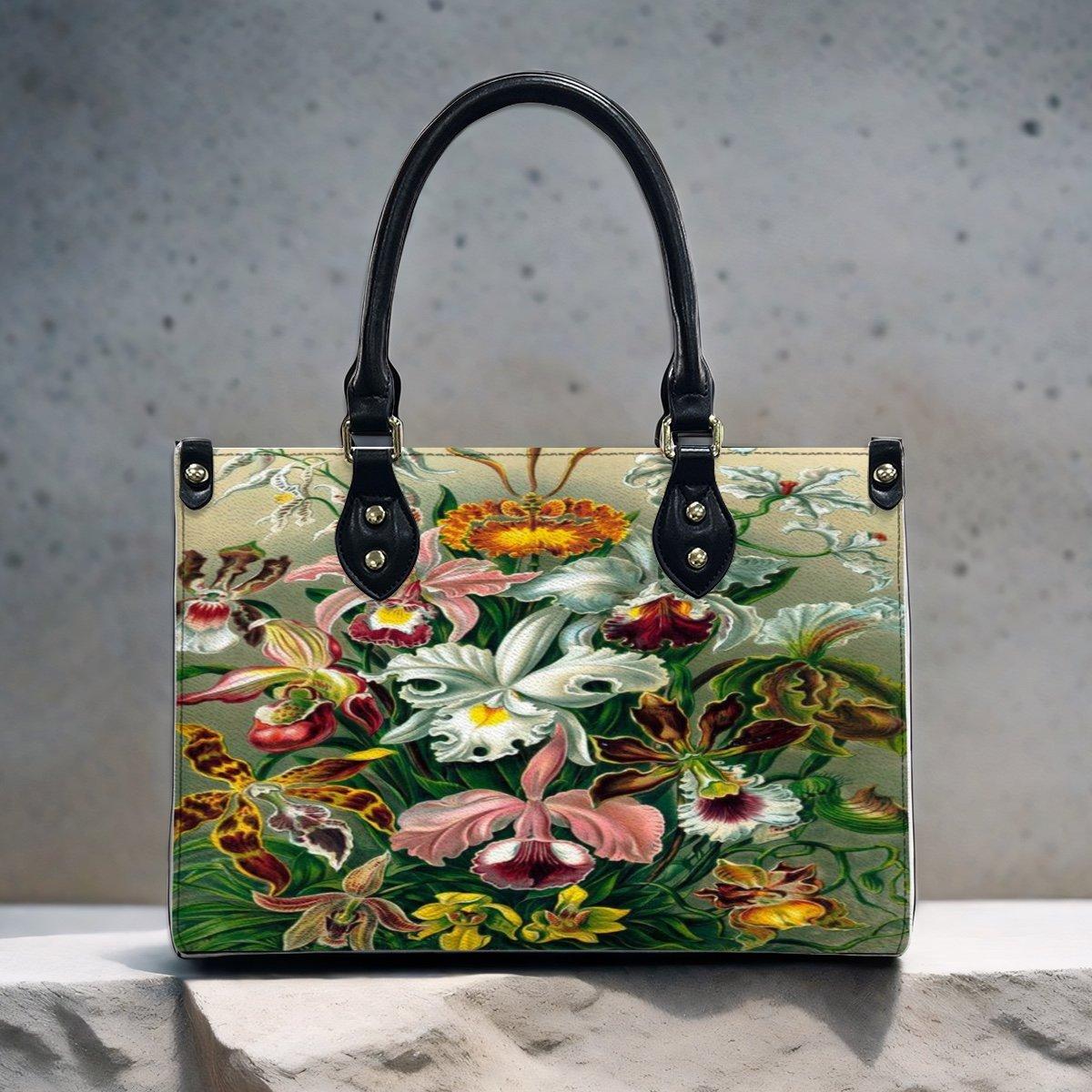 This elegant handbag features a lush orchid and botanical garden design, printed in high-definition UV ink for vibrant color and long-lasting clarity. Made with premium PU leather, this tote is soft, durable, and waterproof—perfect for everyday use, travel, work, and special outings. Orchidae design inspired by the artwork of Ernst Haeckel