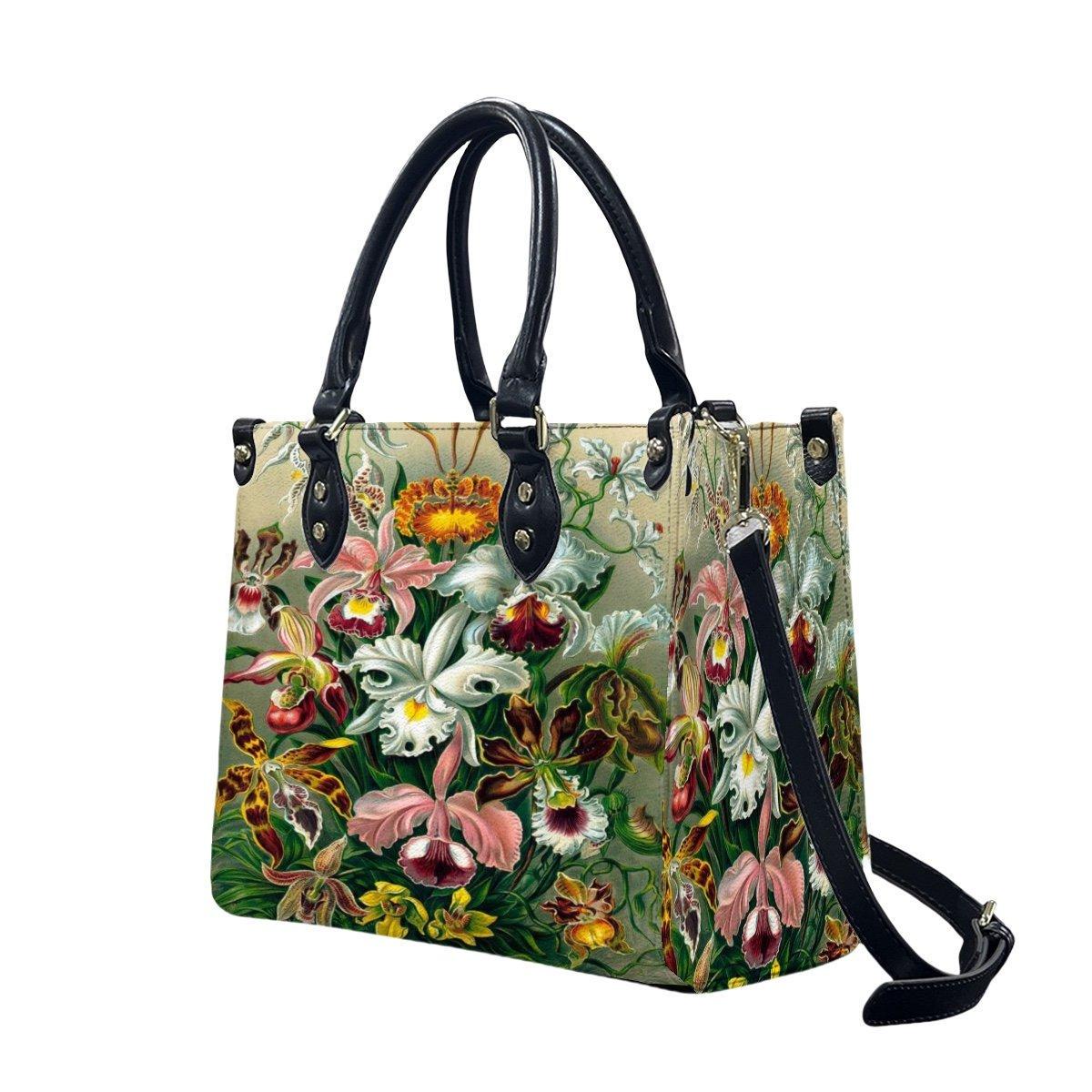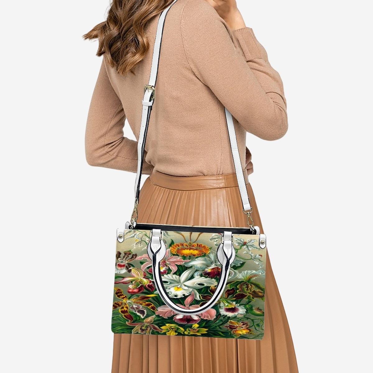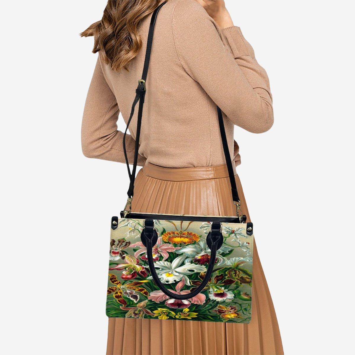 This elegant handbag features a lush orchid and botanical garden design, printed in high-definition UV ink for vibrant color and long-lasting clarity. Made with premium PU leather, this tote is soft, durable, and waterproof—perfect for everyday use, travel, work, and special outings. Orchidae design inspired by the artwork of Ernst Haeckel