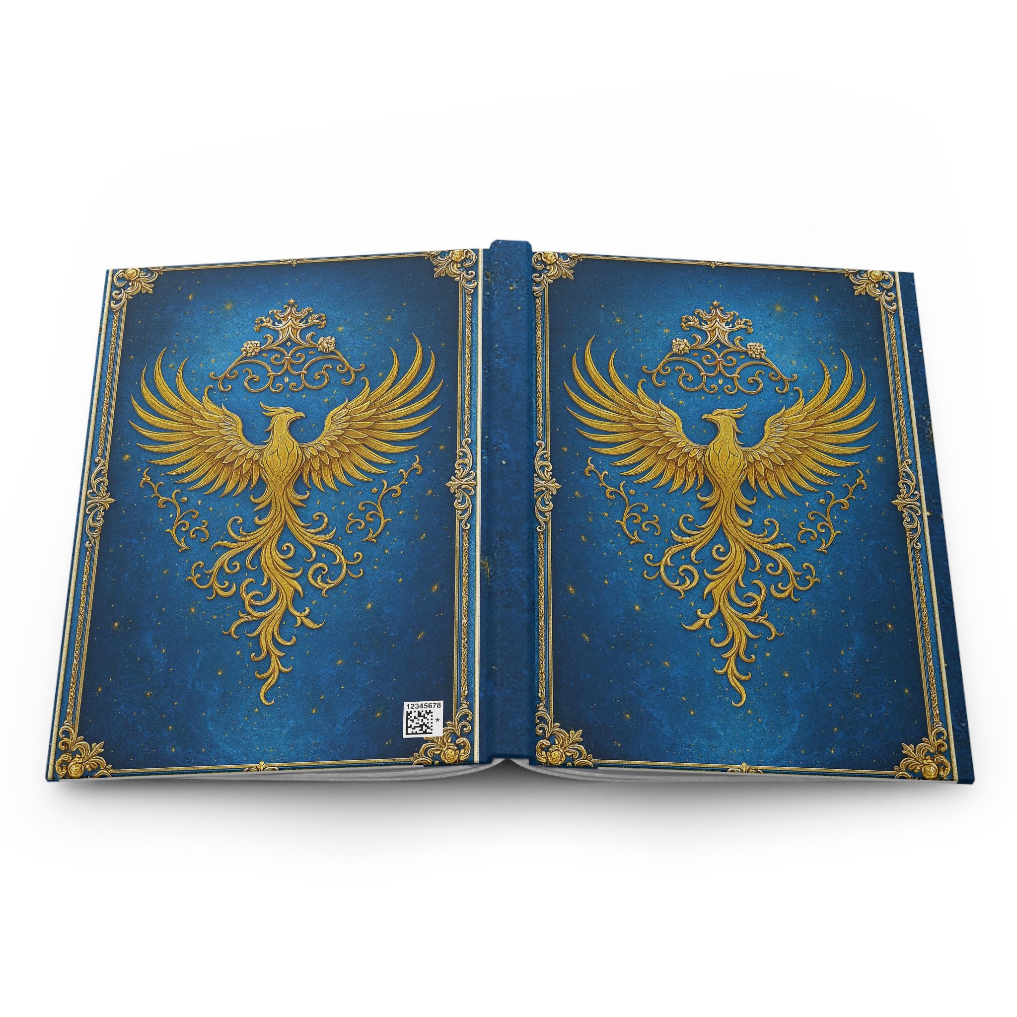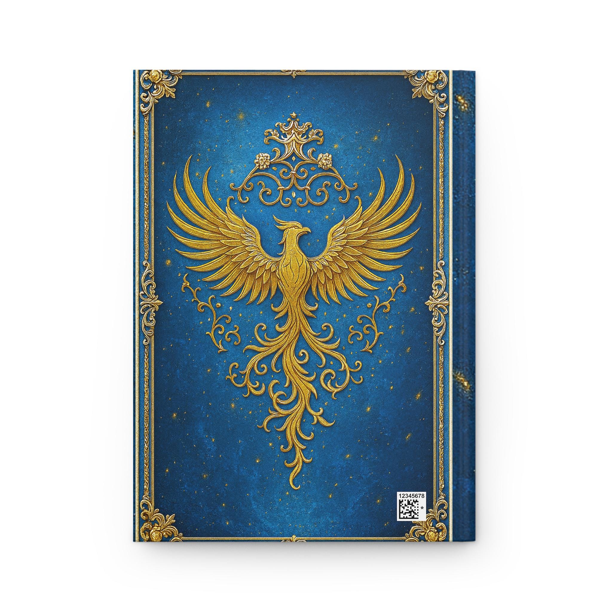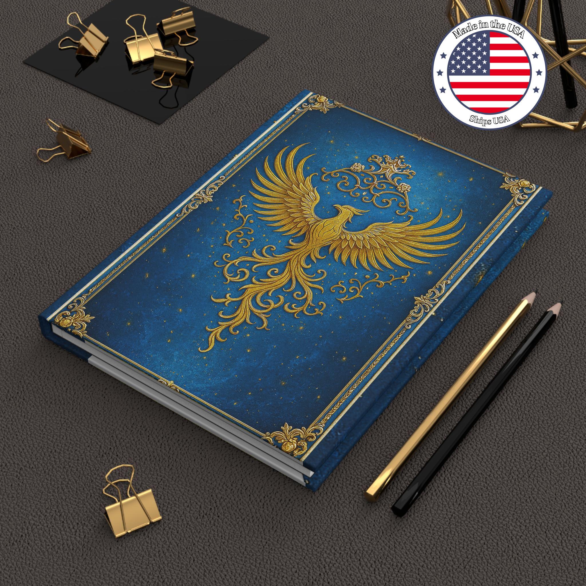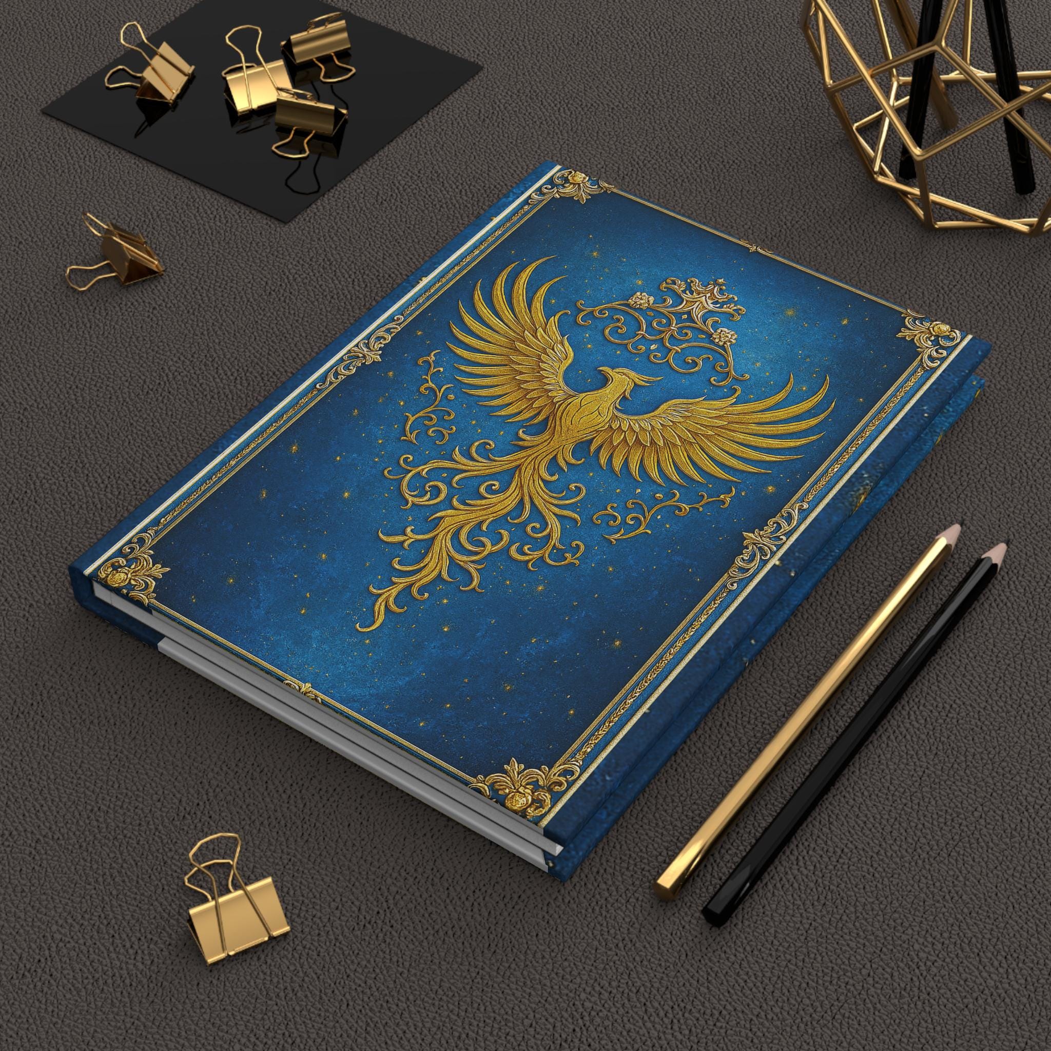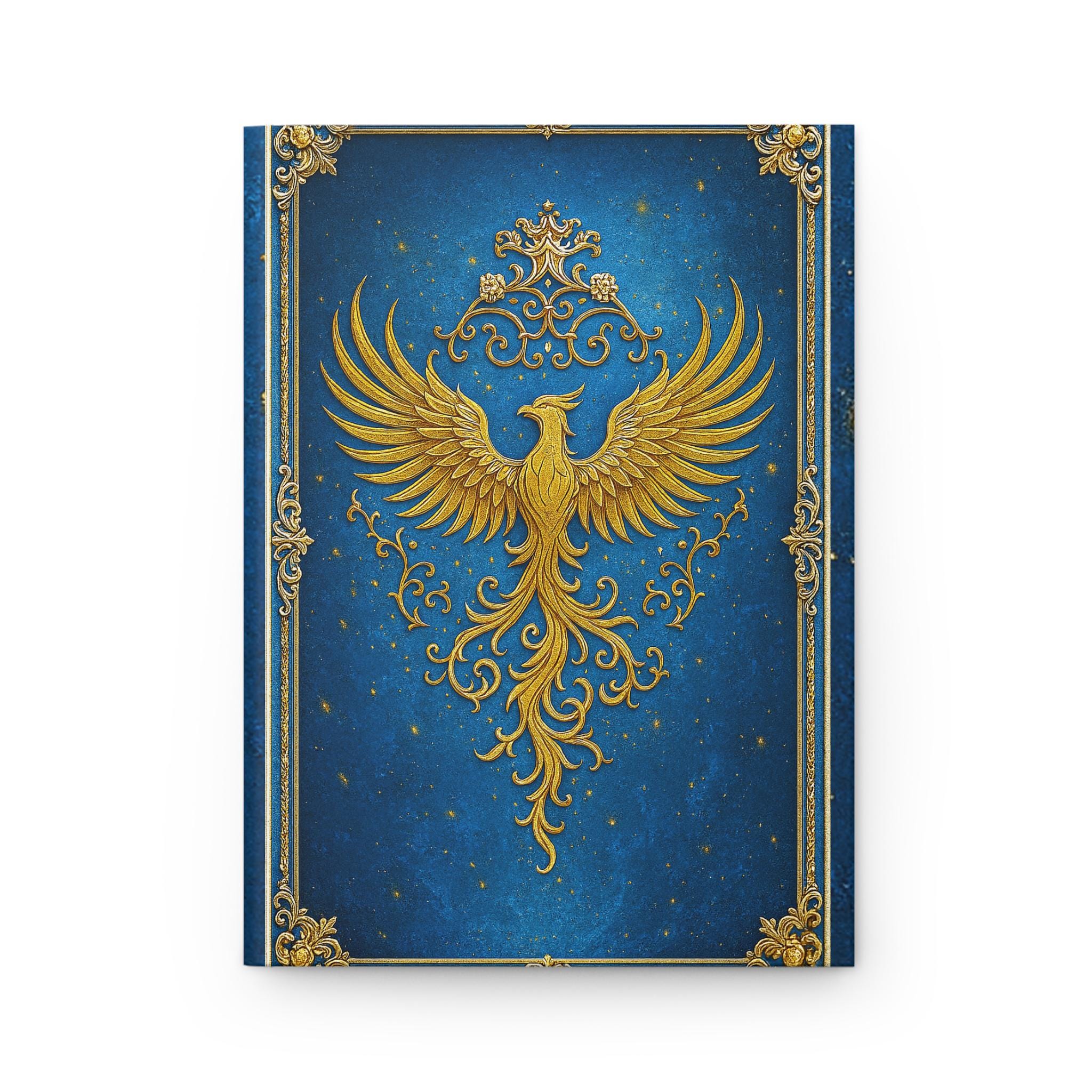 This hardcover journal opens like a little treasure chest. A regal gold phoenix rises across a deep, star-speckled blue cover, framed with ornate filigree — a design that feels both magical and purposeful. The matte laminated finish softens the shine while protecting the art; the sewn casewrap binding lets the book lie comfortably in hand. Inside, 150 lined pages with perforations give you room for long-form thoughts, daily notes, or sketches you want to tear out and share. Keep it by your bedside for reflective evenings, tucked into a bag for on-the-go planning, or set it on a desk as a quiet statement of intent.