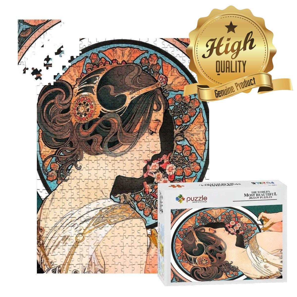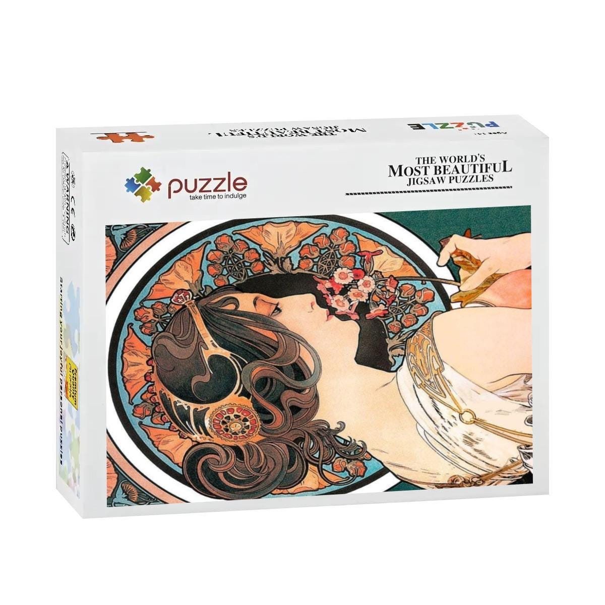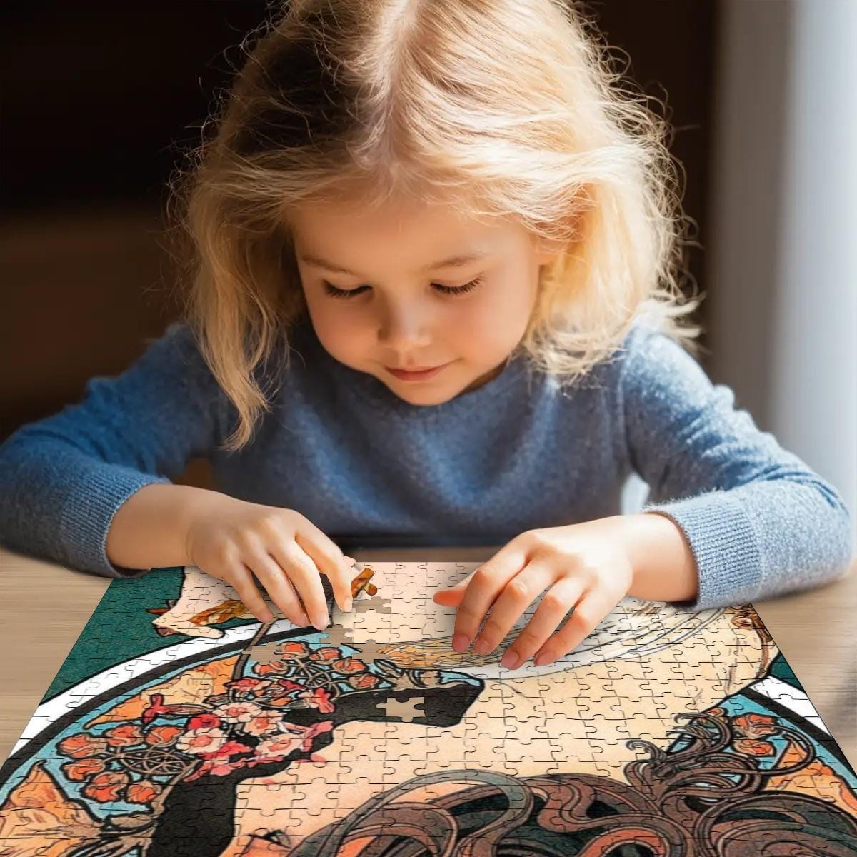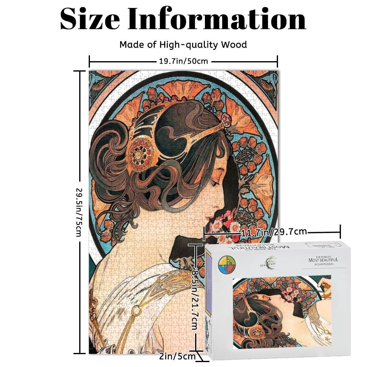 Bring the elegance of Art Nouveau to your puzzle table with this Vintage Mucha-Style Wooden Puzzle, available in 500 or 1000 pieces. Featuring a graceful woman surrounded by floral motifs, swirling lines, and soft vintage colors, this puzzle beautifully captures the romantic, decorative style inspired by Alphonse Mucha’s iconic artwork.