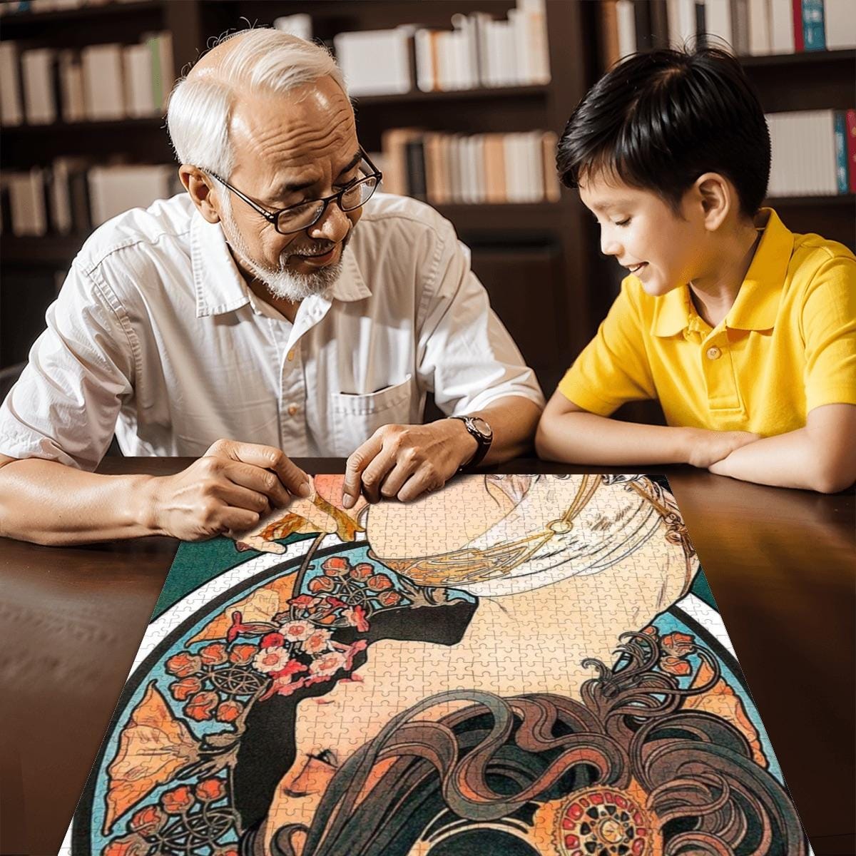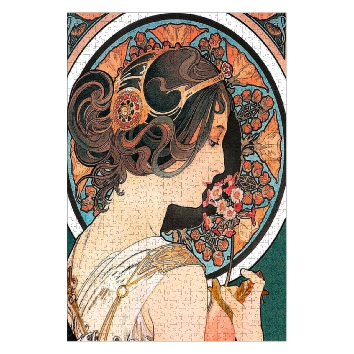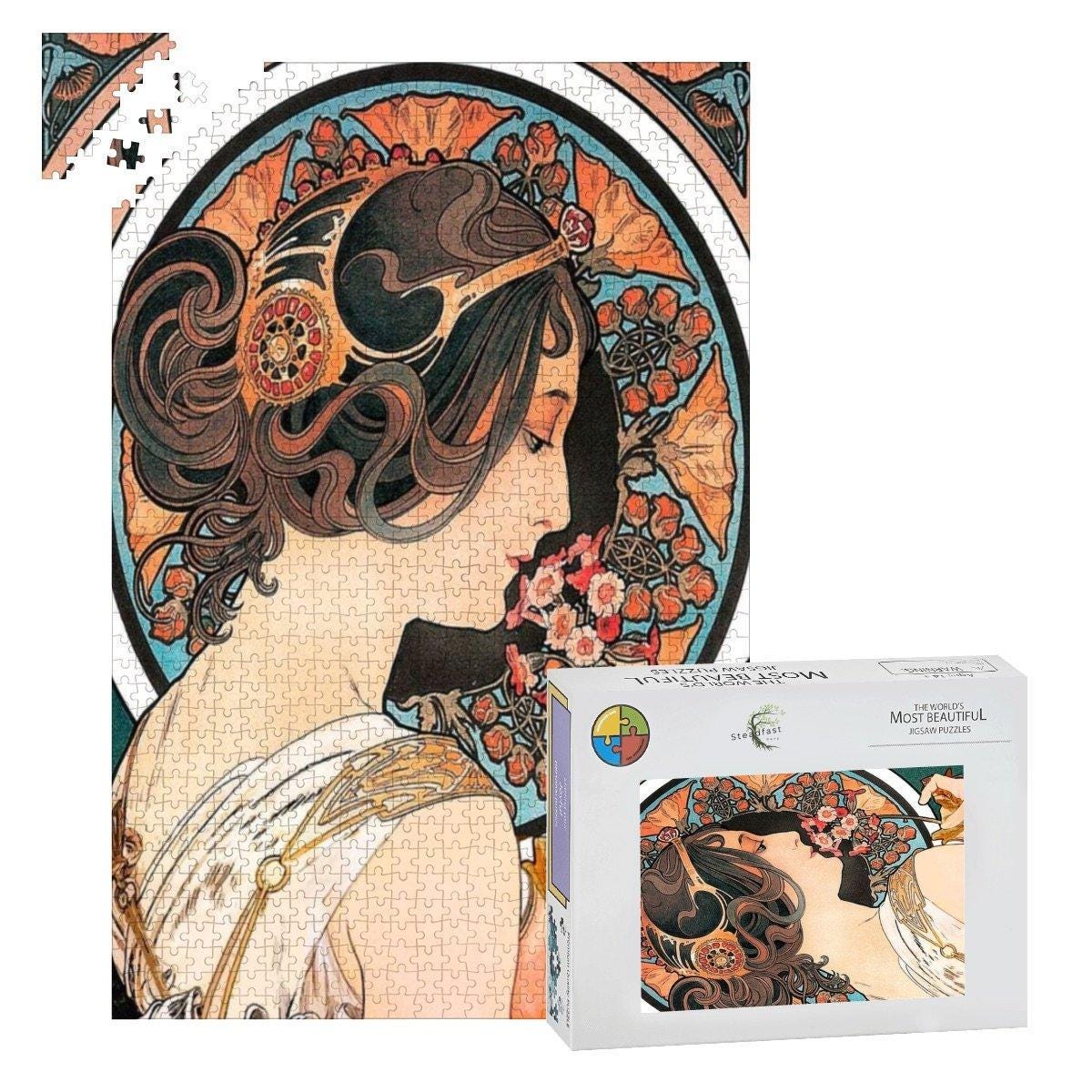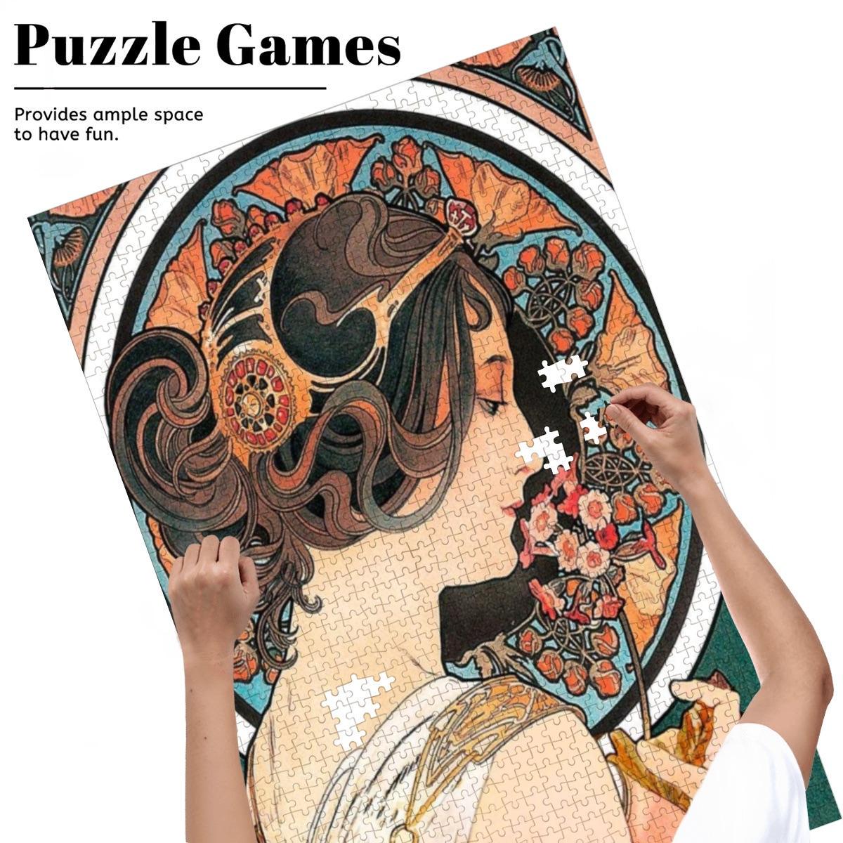 Bring the elegance of Art Nouveau to your puzzle table with this Vintage Mucha-Style Wooden Puzzle, available in 500 or 1000 pieces. Featuring a graceful woman surrounded by floral motifs, swirling lines, and soft vintage colors, this puzzle beautifully captures the romantic, decorative style inspired by Alphonse Mucha’s iconic artwork.
